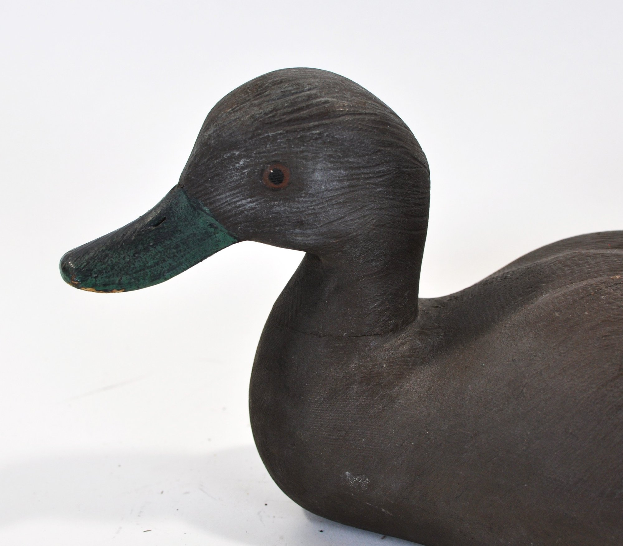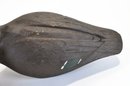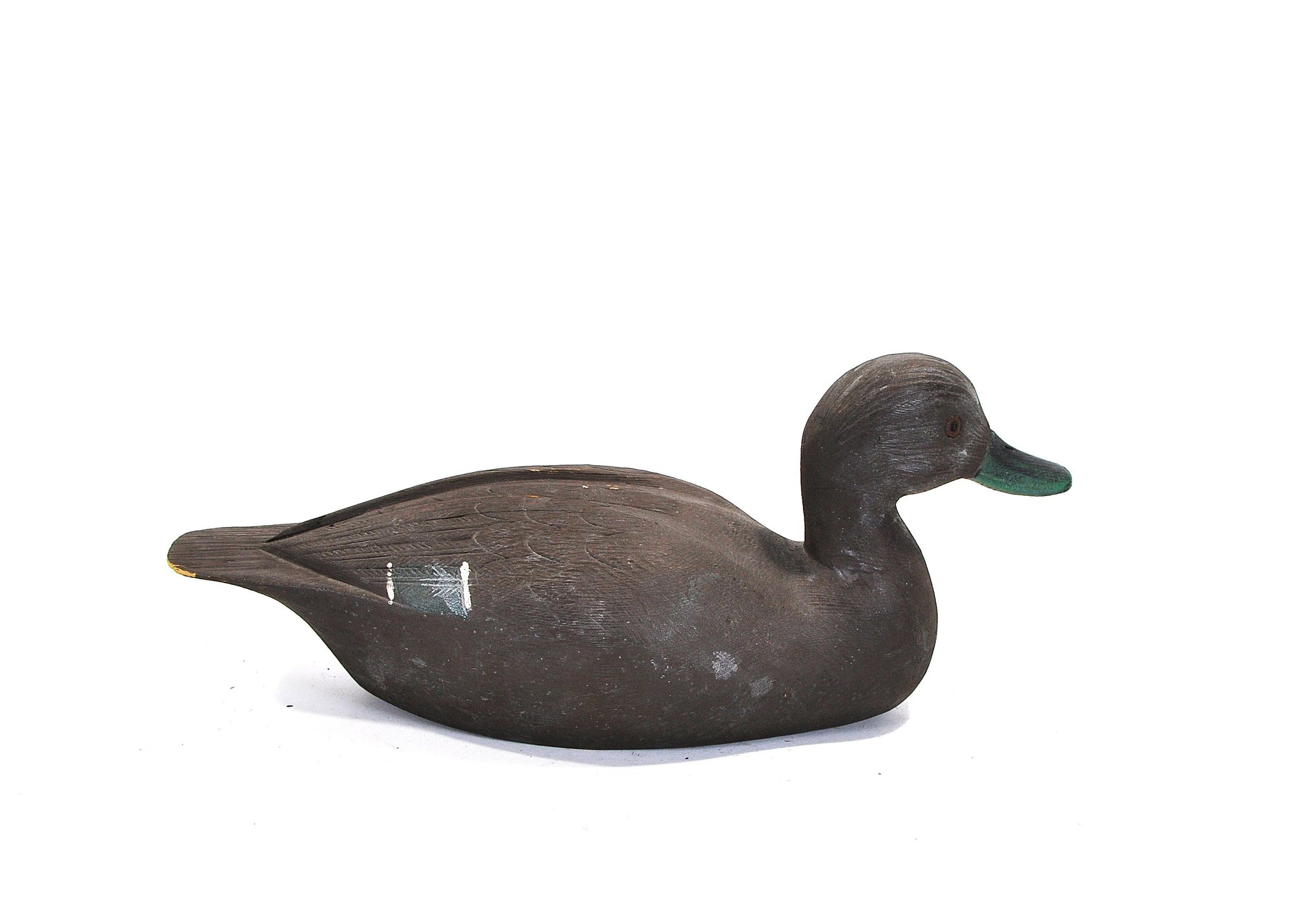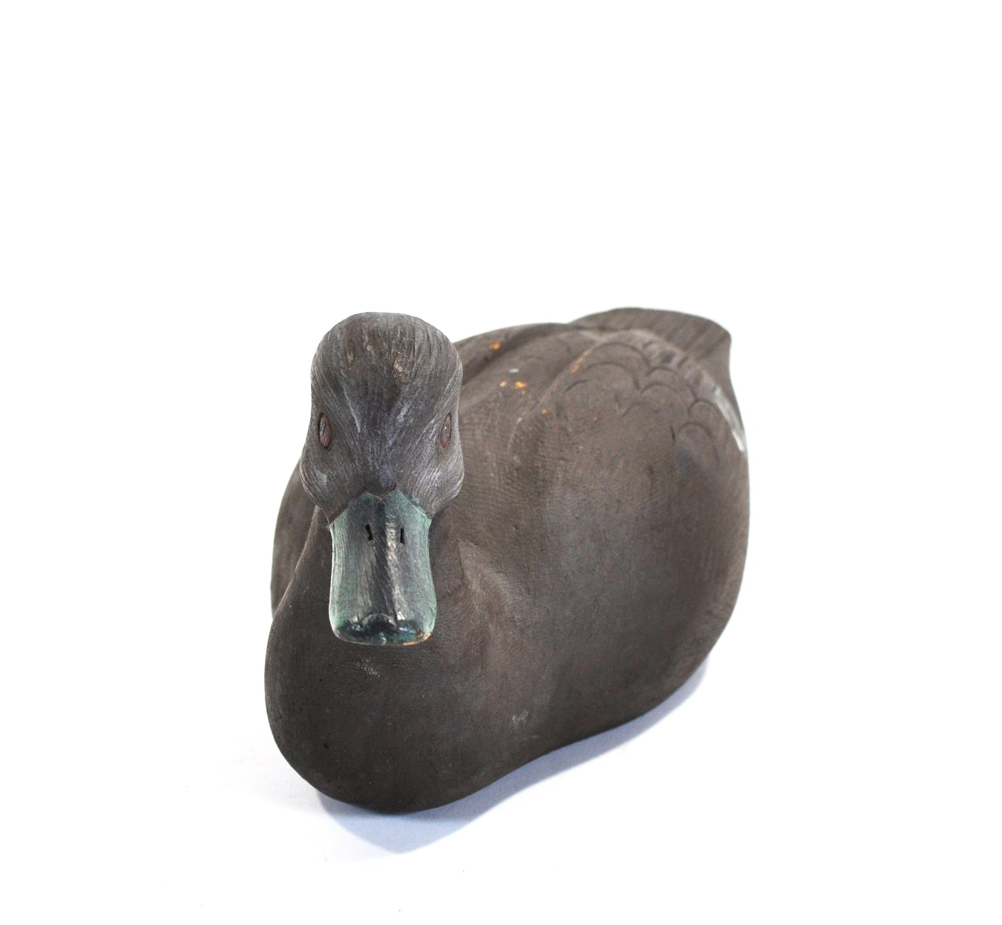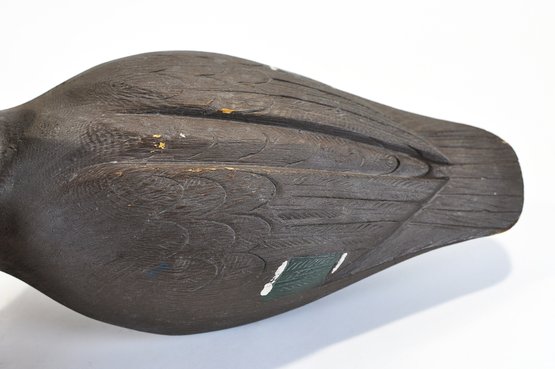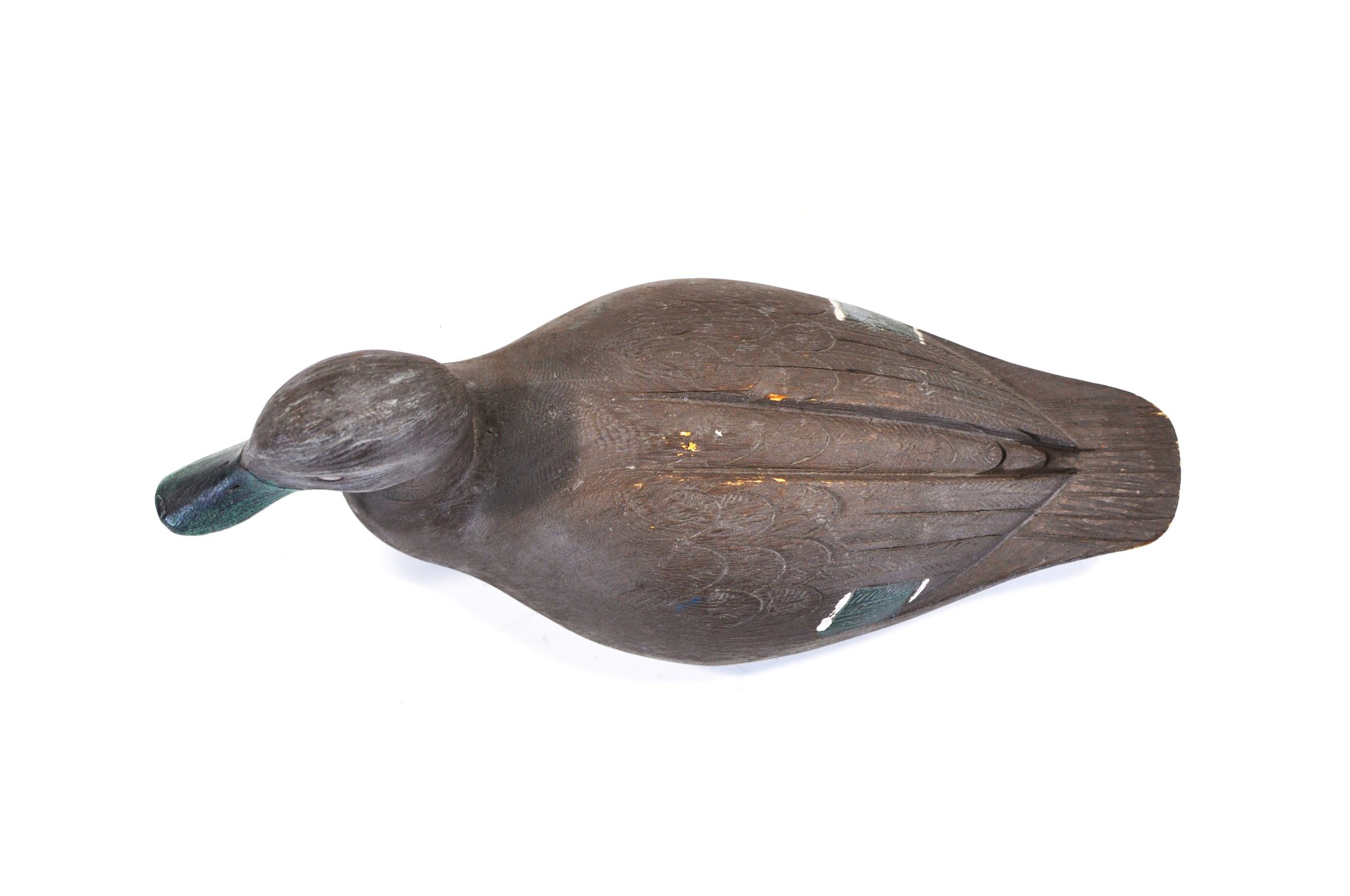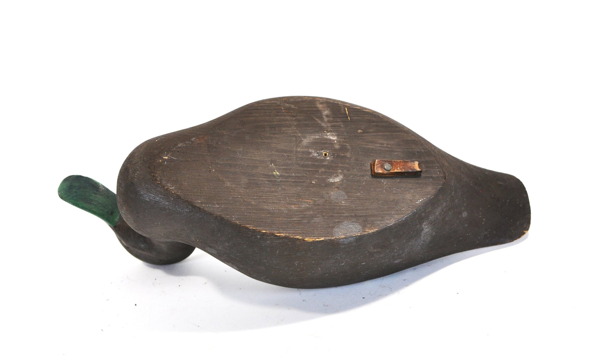 Nicely carved decorative wooden duck decoy featuring detailed incised feather carving and a naturalistic painted finish. The decoy has a smooth sculpted head, carved wing and feather patterns, and a subtle green speculum accent on the side. The underside retains a small metal weight.