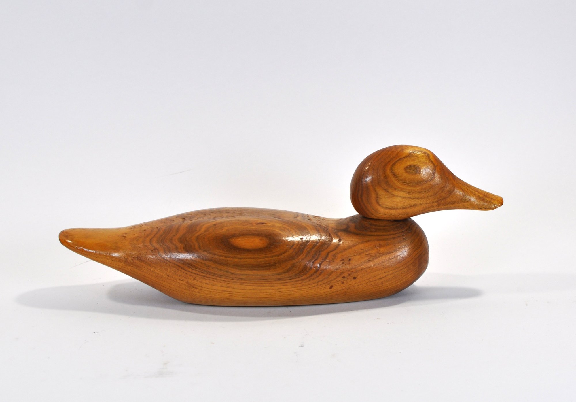 Hand-carved wooden duck decoy with a sleek, minimalist form and smooth sculpted body. The decoy is finished in a warm natural tone that highlights the attractive wood grain pattern across the body and head. The simplified carving and polished finish suggest it was made primarily as a decorative or display decoy rather than a working hunting example.
