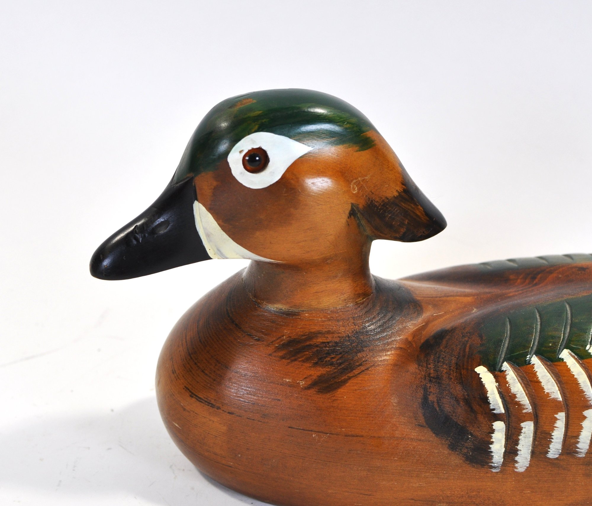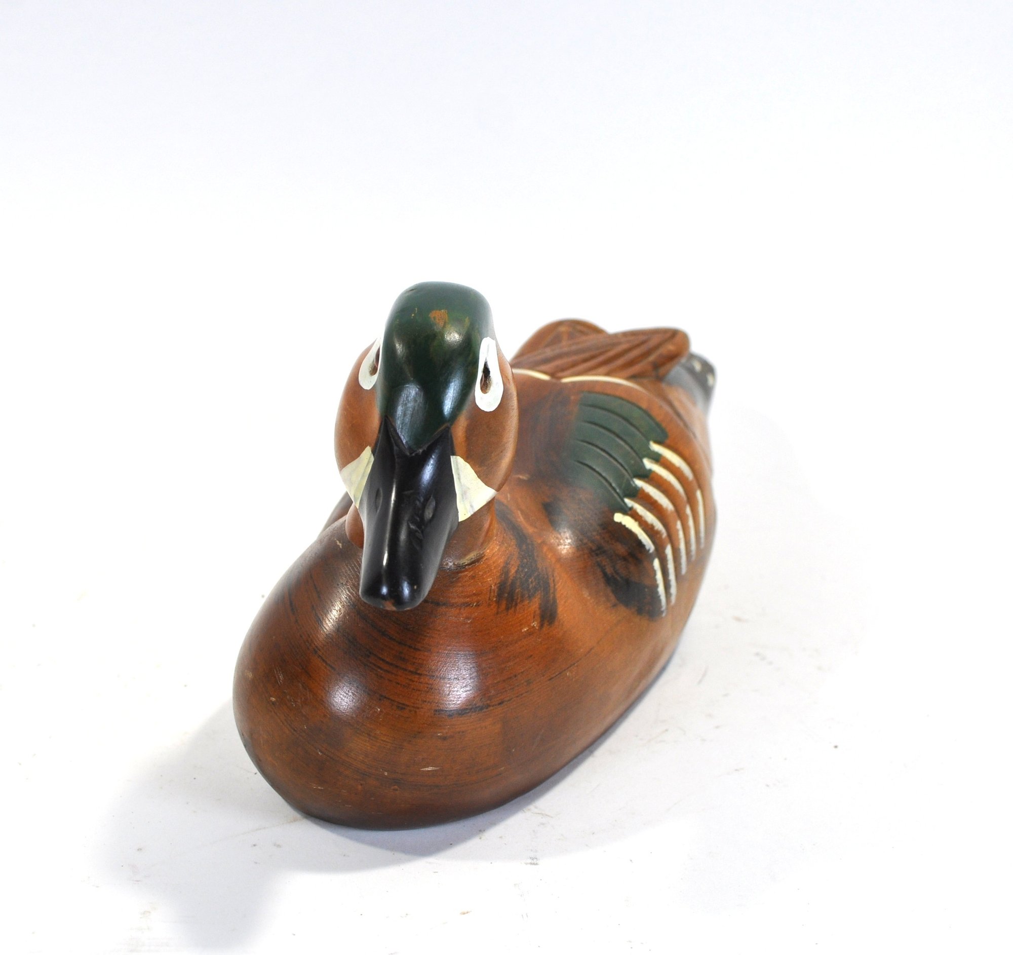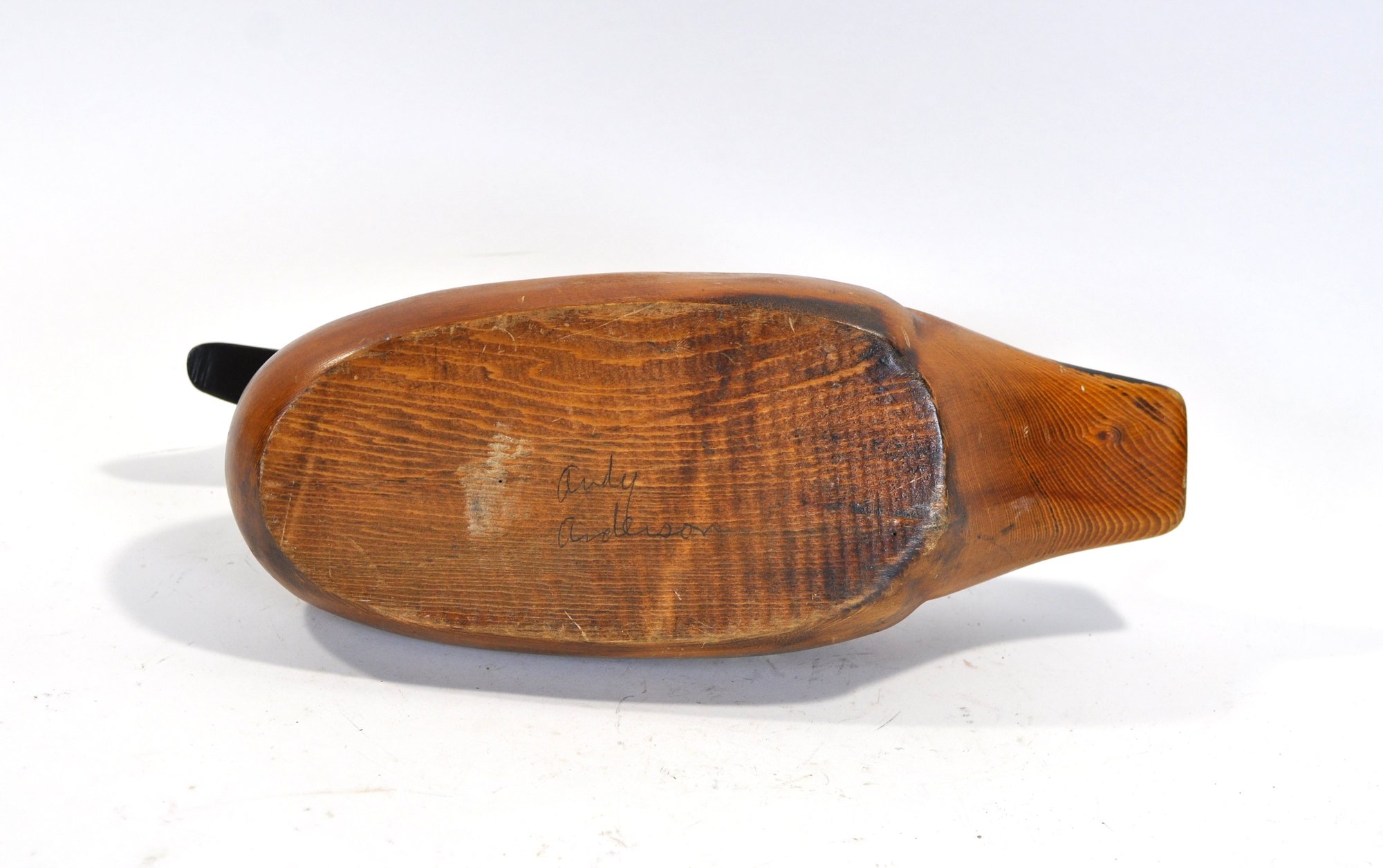 Attractive hand-carved and painted Wood Duck drake decoy, pen signed on the underside “Andy Anderson”. This decorative example features bold coloration with a deep chestnut body, green crown, white facial patch, and carved wing and tail detailing.