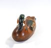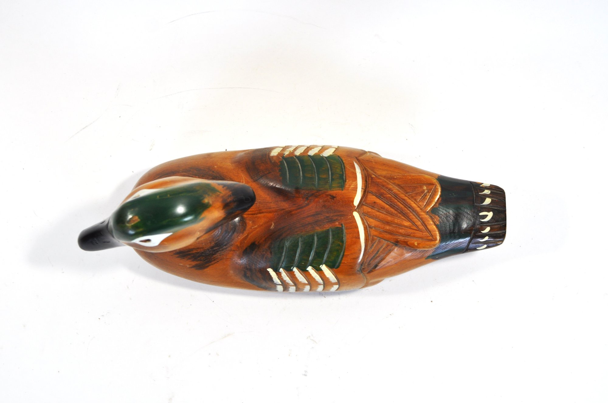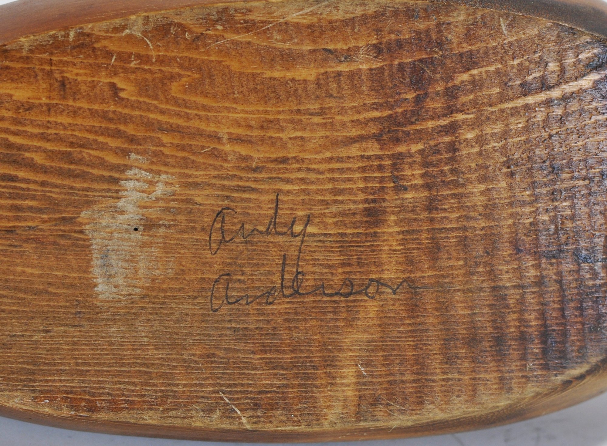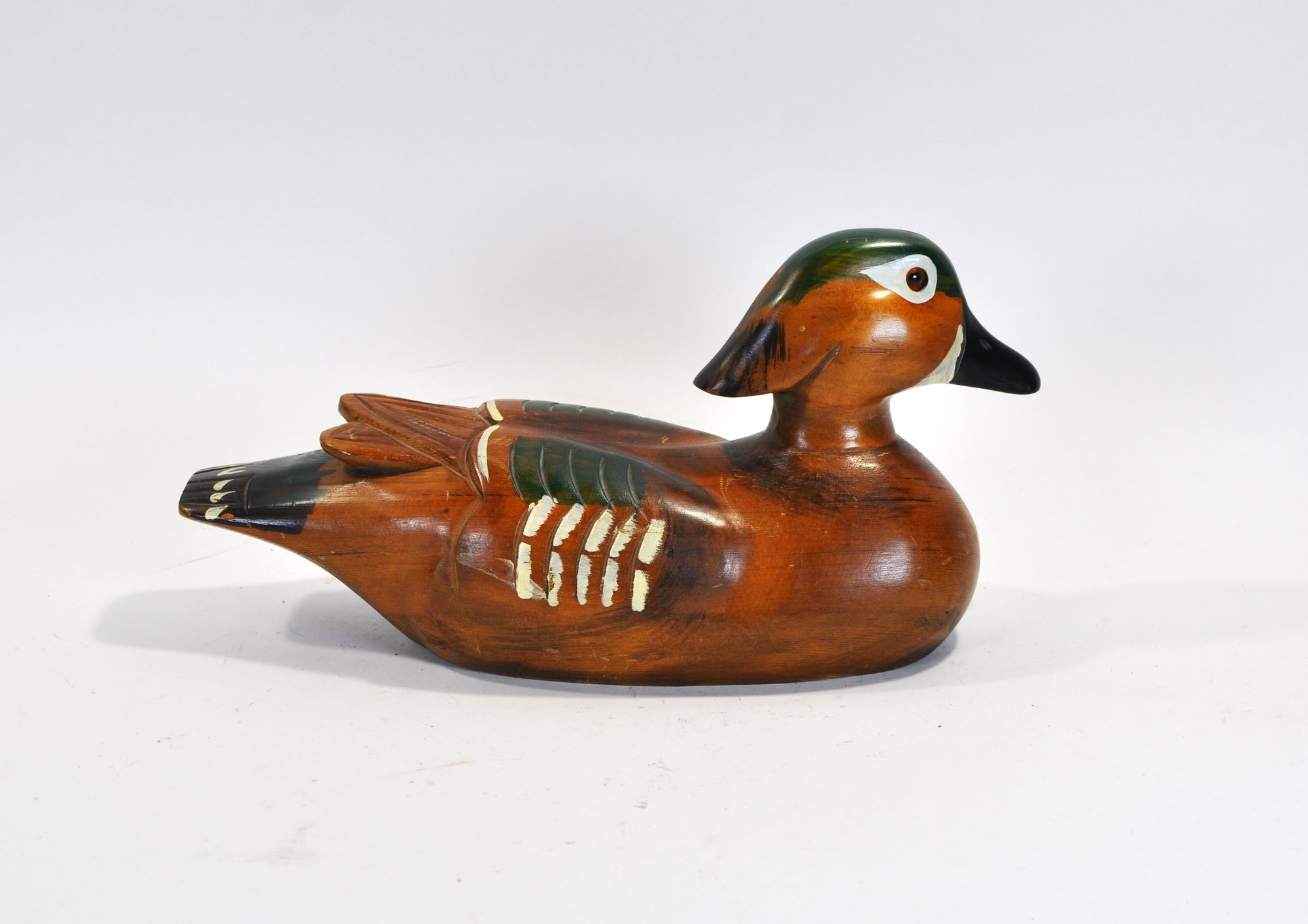 Attractive hand-carved and painted Wood Duck drake decoy, pen signed on the underside “Andy Anderson”. This decorative example features bold coloration with a deep chestnut body, green crown, white facial patch, and carved wing and tail detailing.