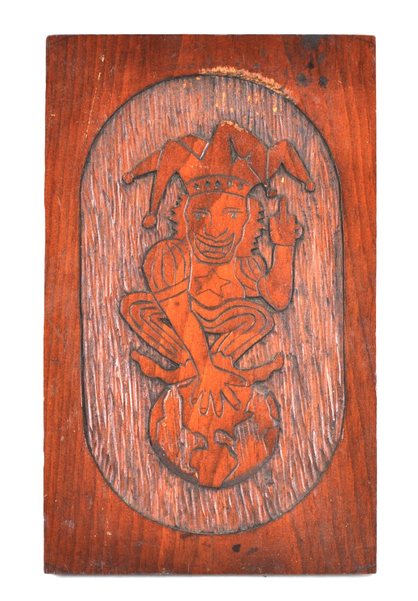 Unusual vintage hand-carved wooden plaque featuring a jester crouched atop a globe, rendered in a bold folk-art style.