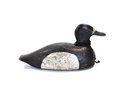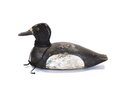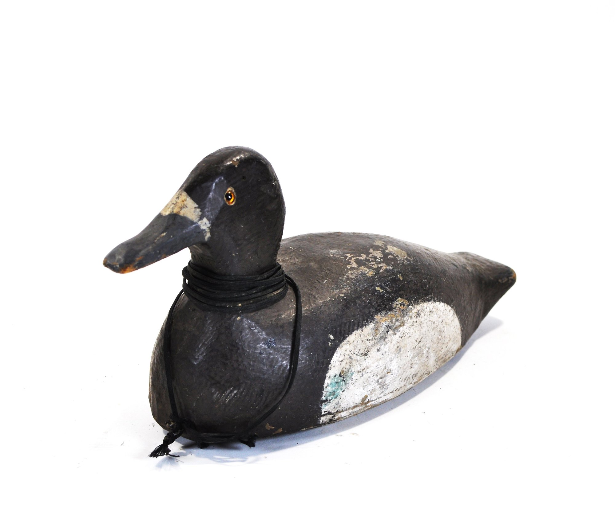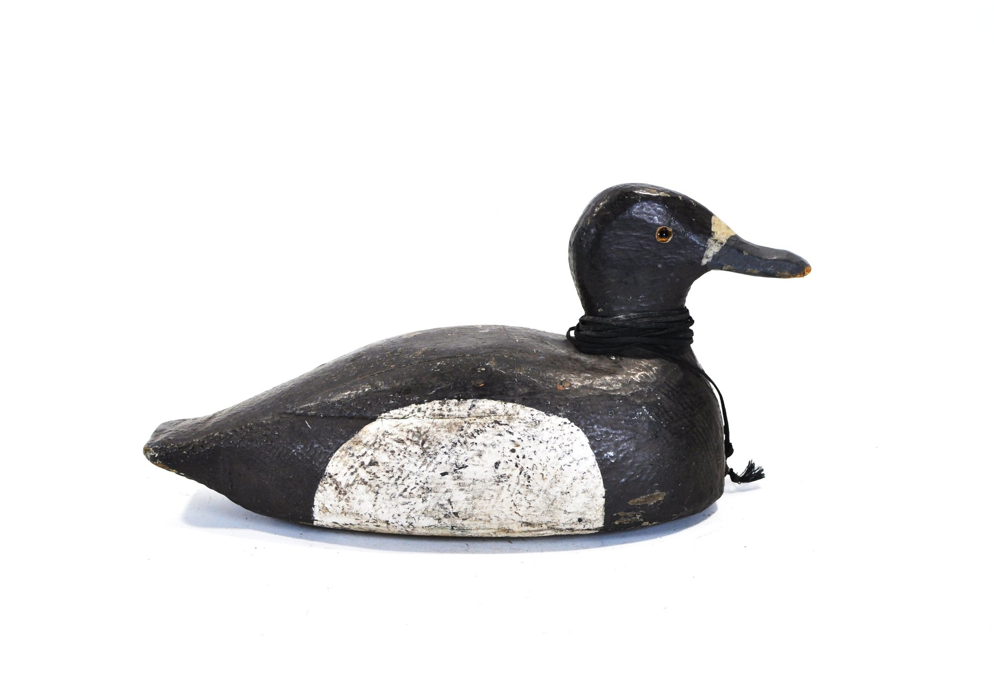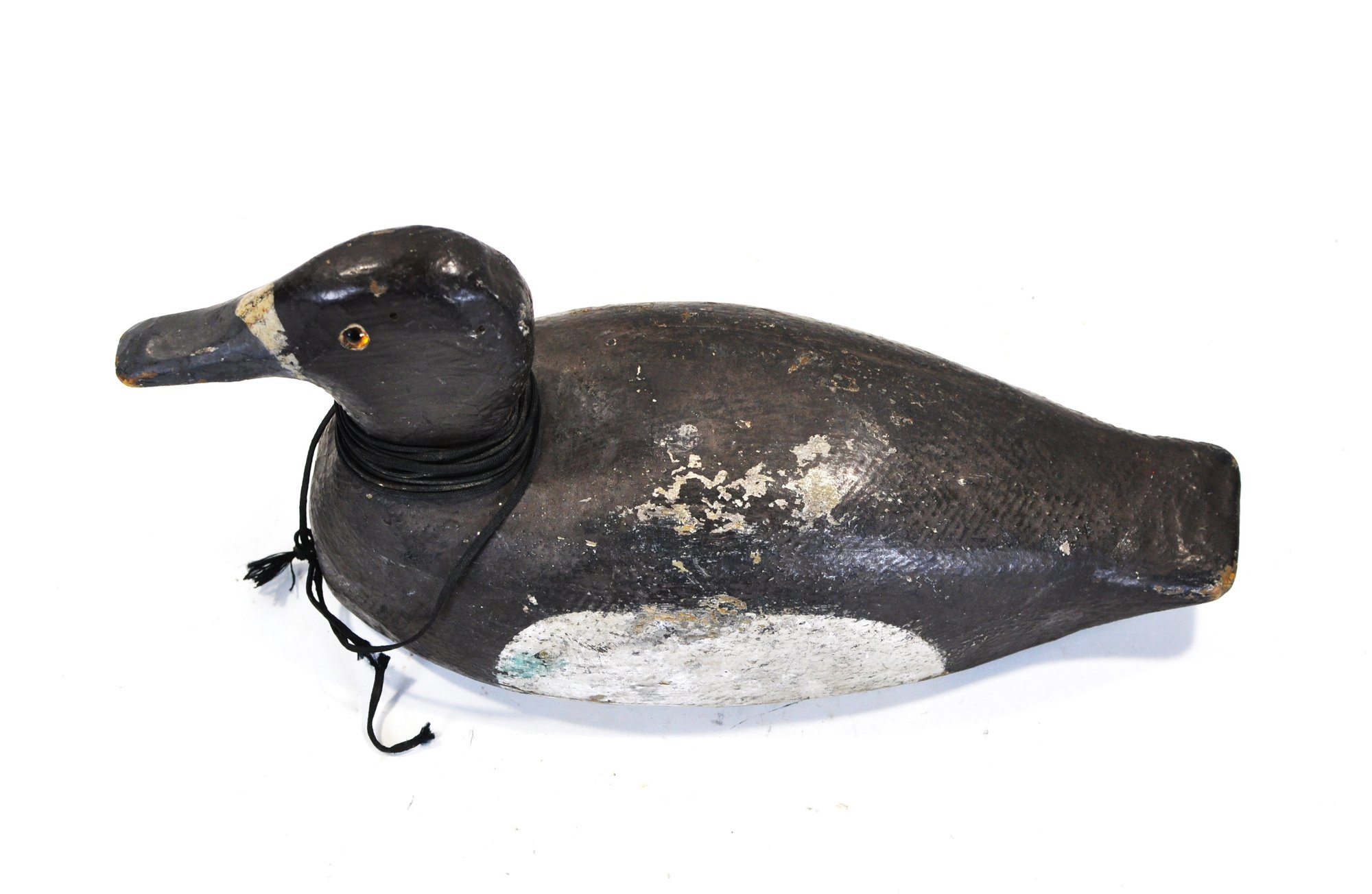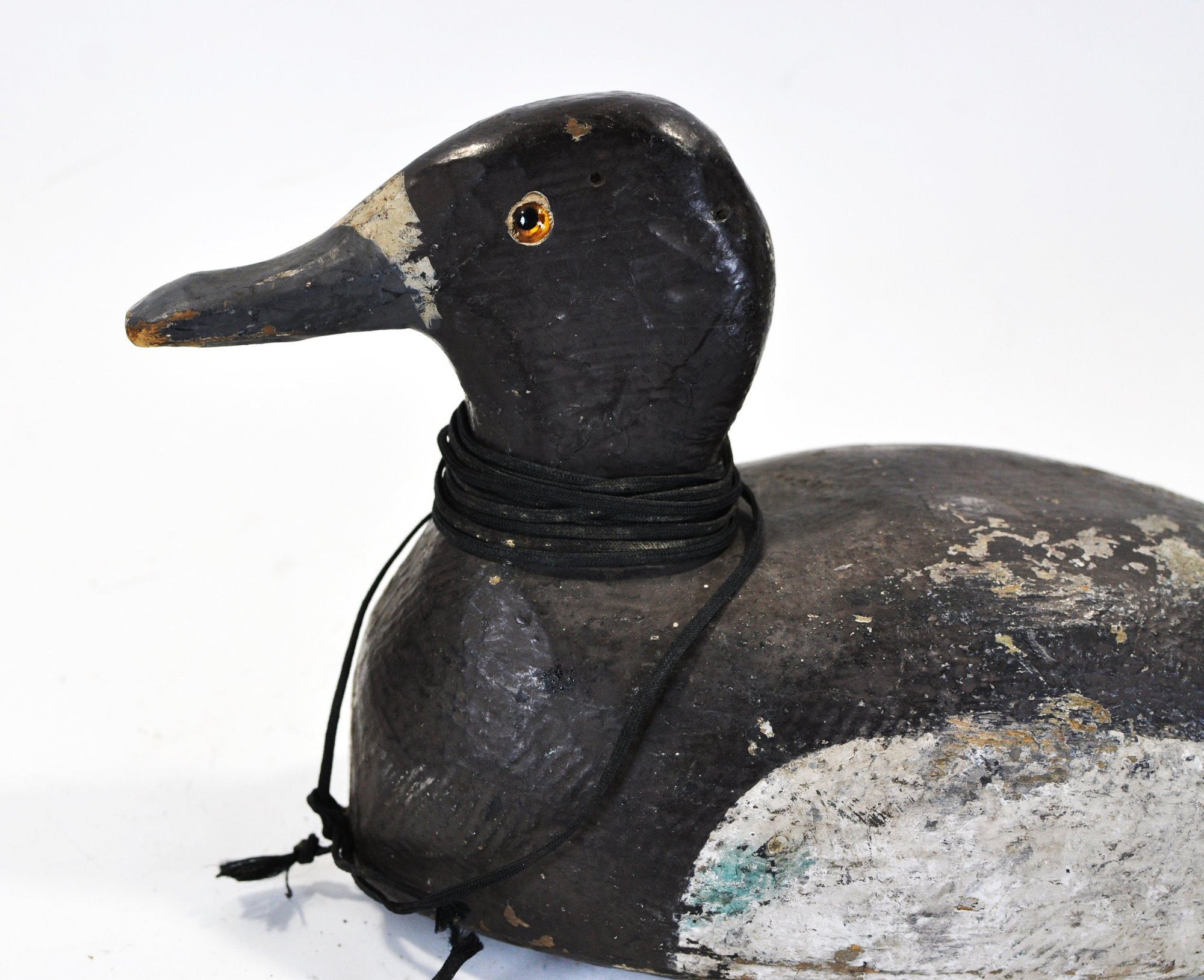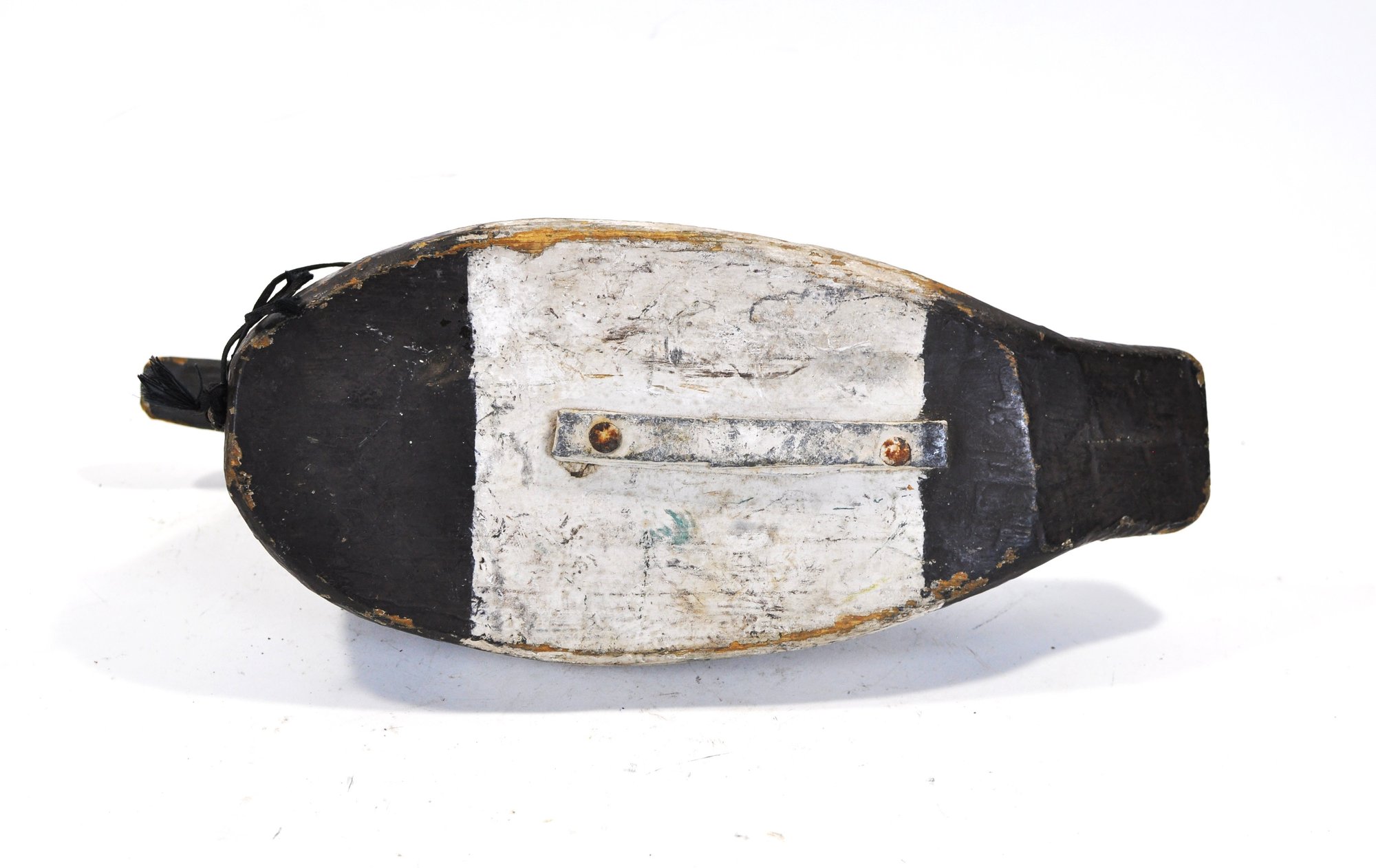 Early 20th century hand-carved wooden duck decoy with a low, elongated body and slightly raised tail, finished in a dark working paint scheme with a bold white side patch. Features inset glass eyes and a carved bill with traces of original paint. Retains an old cord around the neck, likely used for rigging.