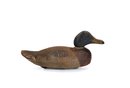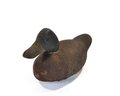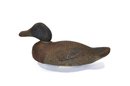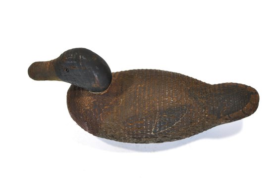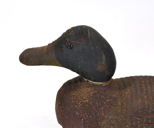 Early working-style hand-carved wooden duck decoy featuring a dark, naturally worn surface with visible tool marks throughout. The form is slightly elongated with a low head profile and simple carved bill, giving it a classic utilitarian look. Retains inset glass eyes and original aged paint remnants.