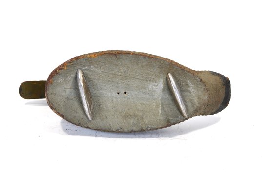 The underside is fitted with two metal keel weights, indicating use as a working hunting decoy. The surface shows a rich, untouched patina from years of handling and exposure.