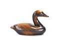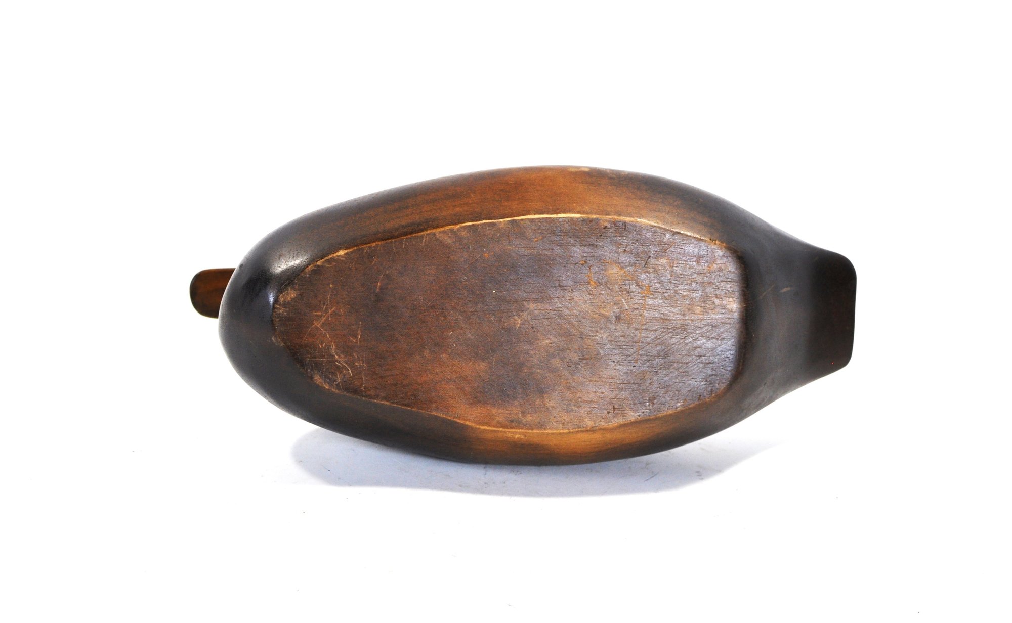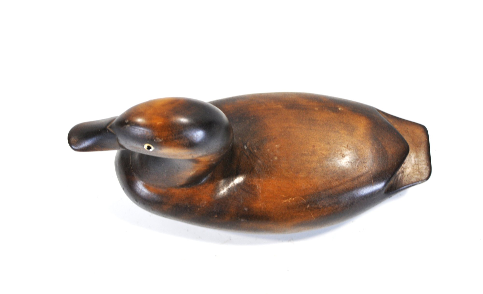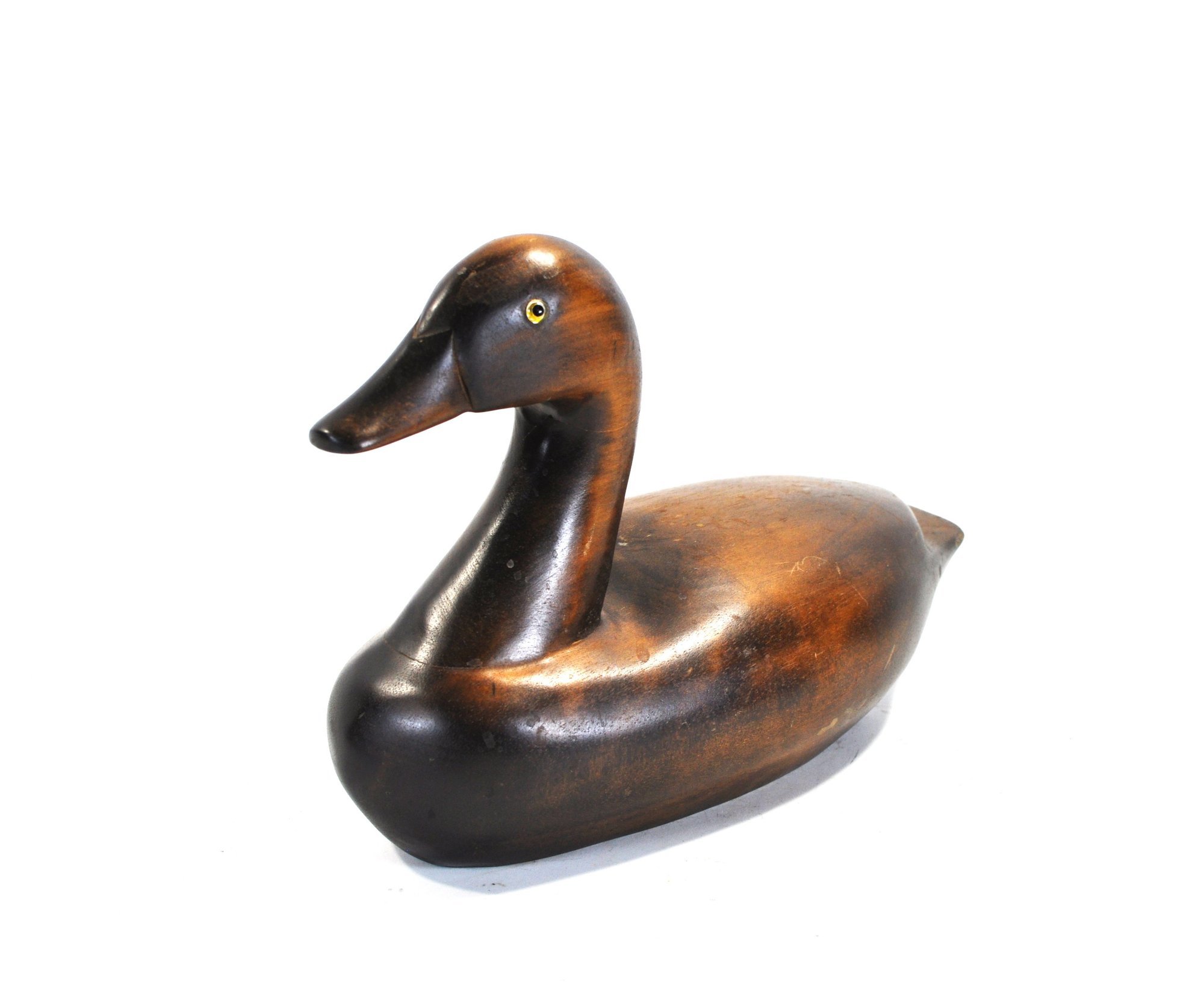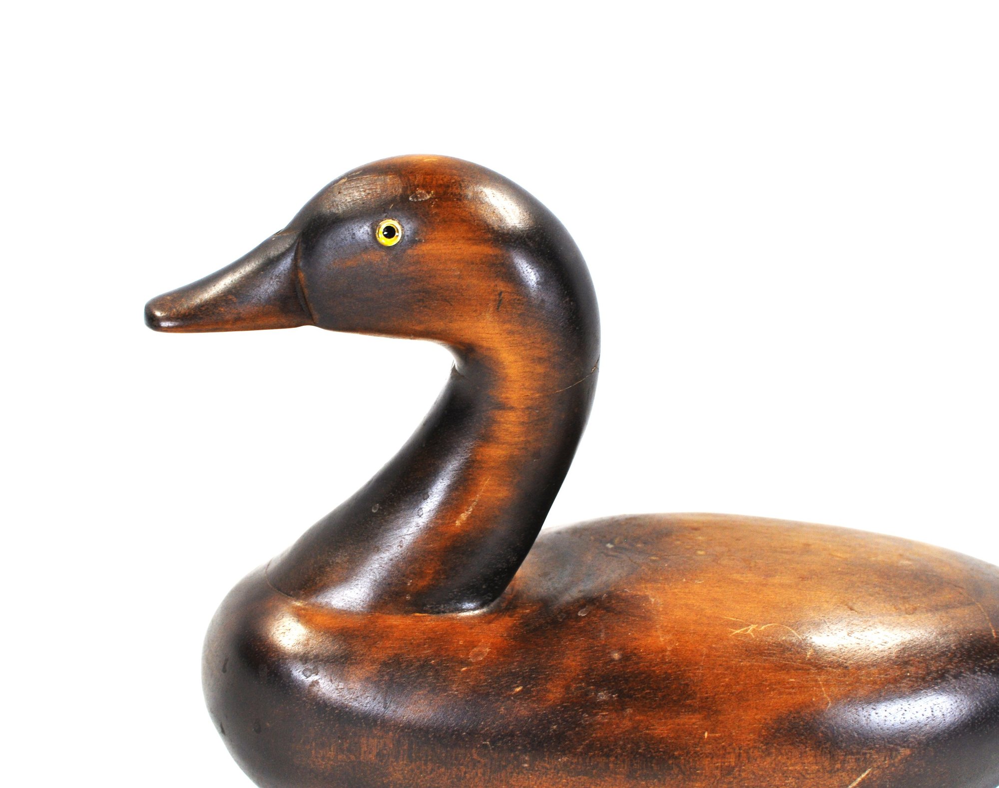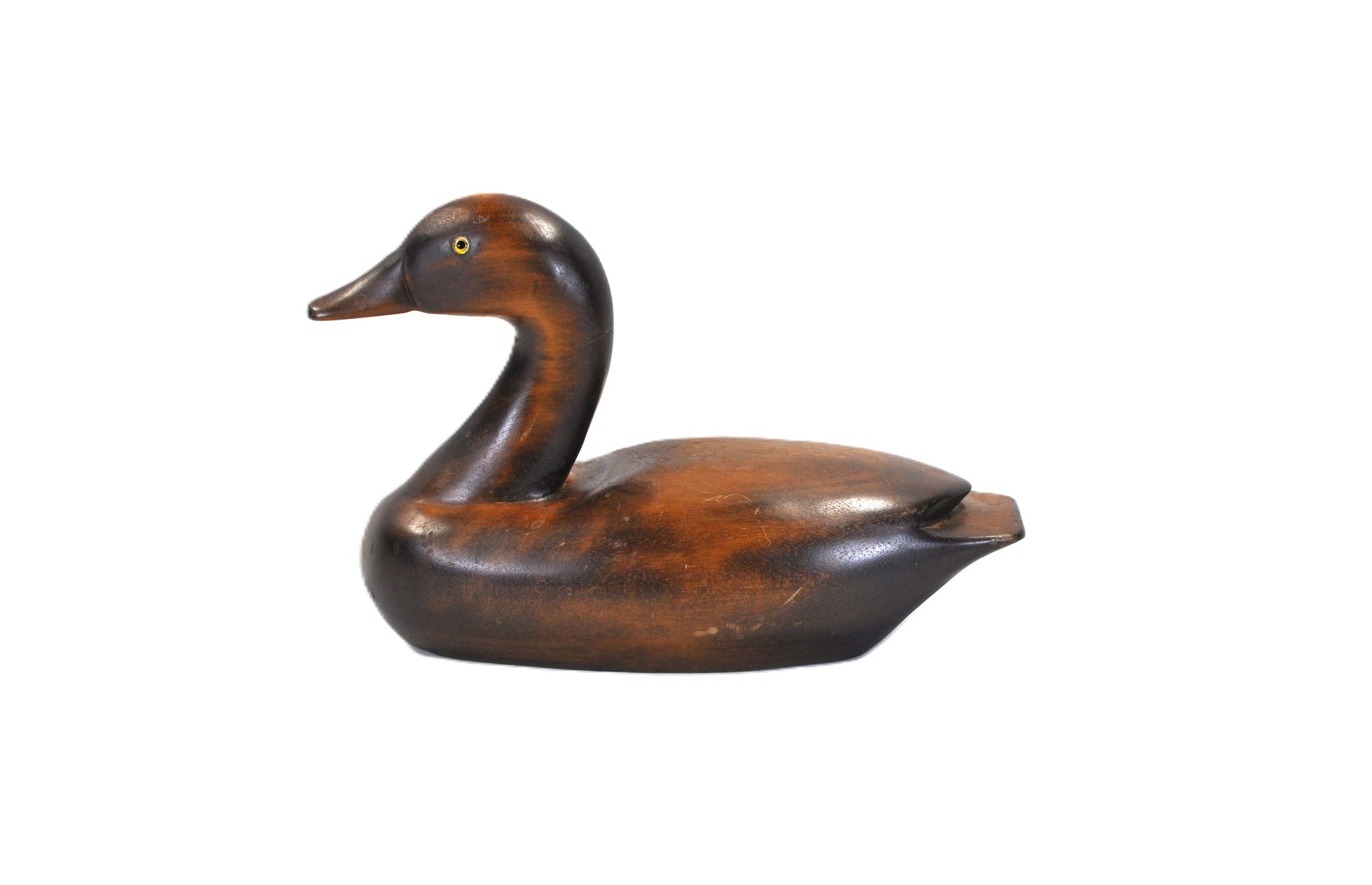 Elegant vintage duck decoy, hand-carved from solid wood with a refined, minimalist form. Unlike more heavily painted examples, this piece features a rich, burnished brown finish that highlights the natural grain and craftsmanship. The head is gracefully arched with a slender bill and small inset eyes, giving the decoy a lifelike yet sculptural presence.