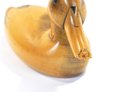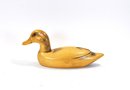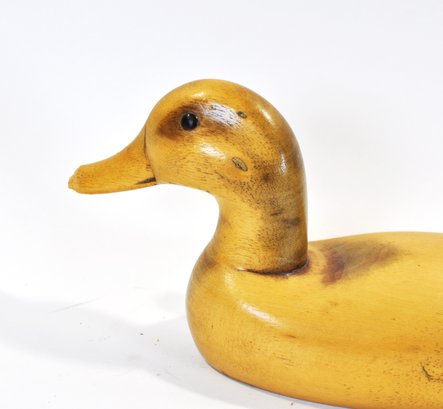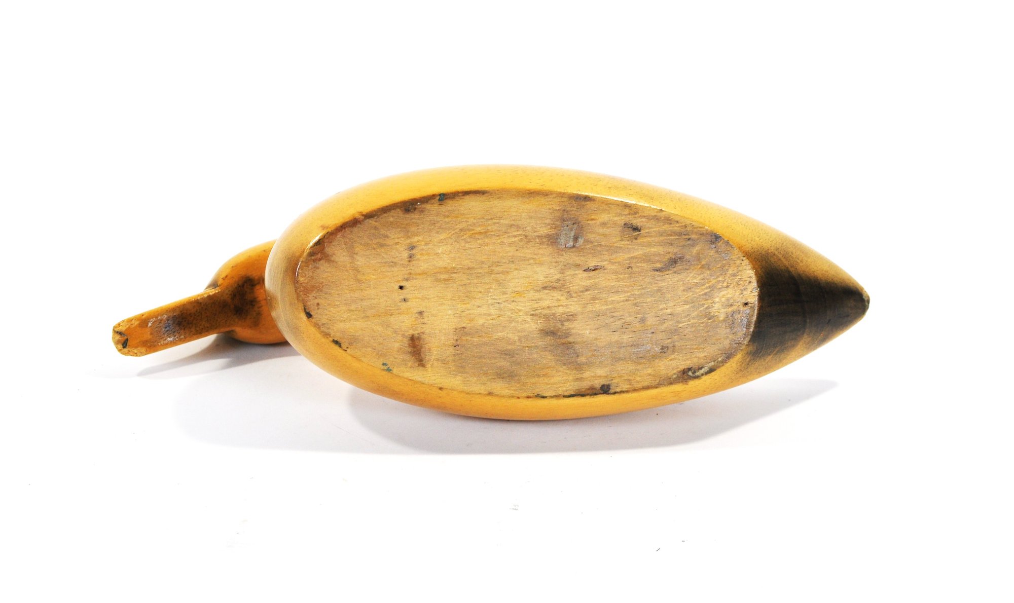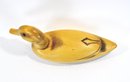 Hand-carved wooden duck hunting decoy featuring a sleek, stylized form with elongated neck and smooth, streamlined body. The decoy is finished in warm yellow-ochre paint with shaded airbrushed details and a carved wing motif on the back, giving it a distinctive decorative look.