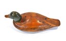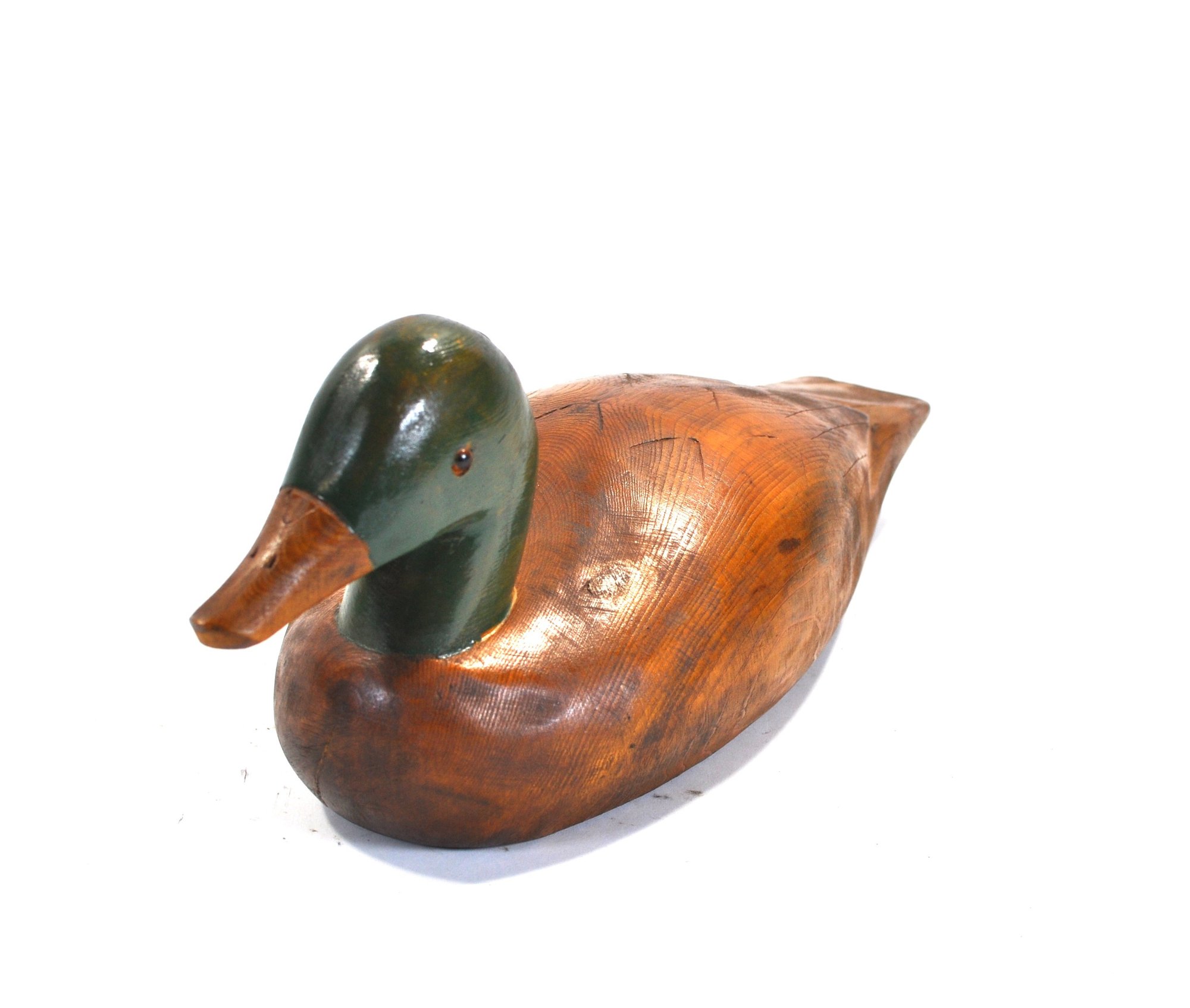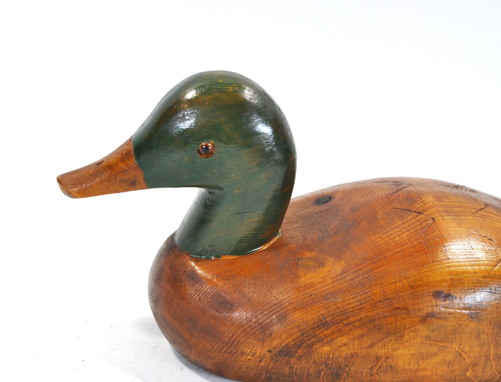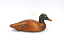 Well-carved wooden mallard decoy with smooth, polished body and painted green head. and glass eyes.