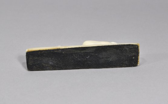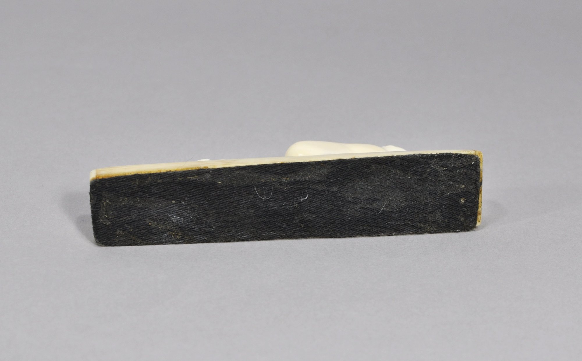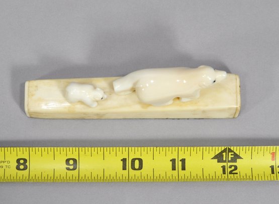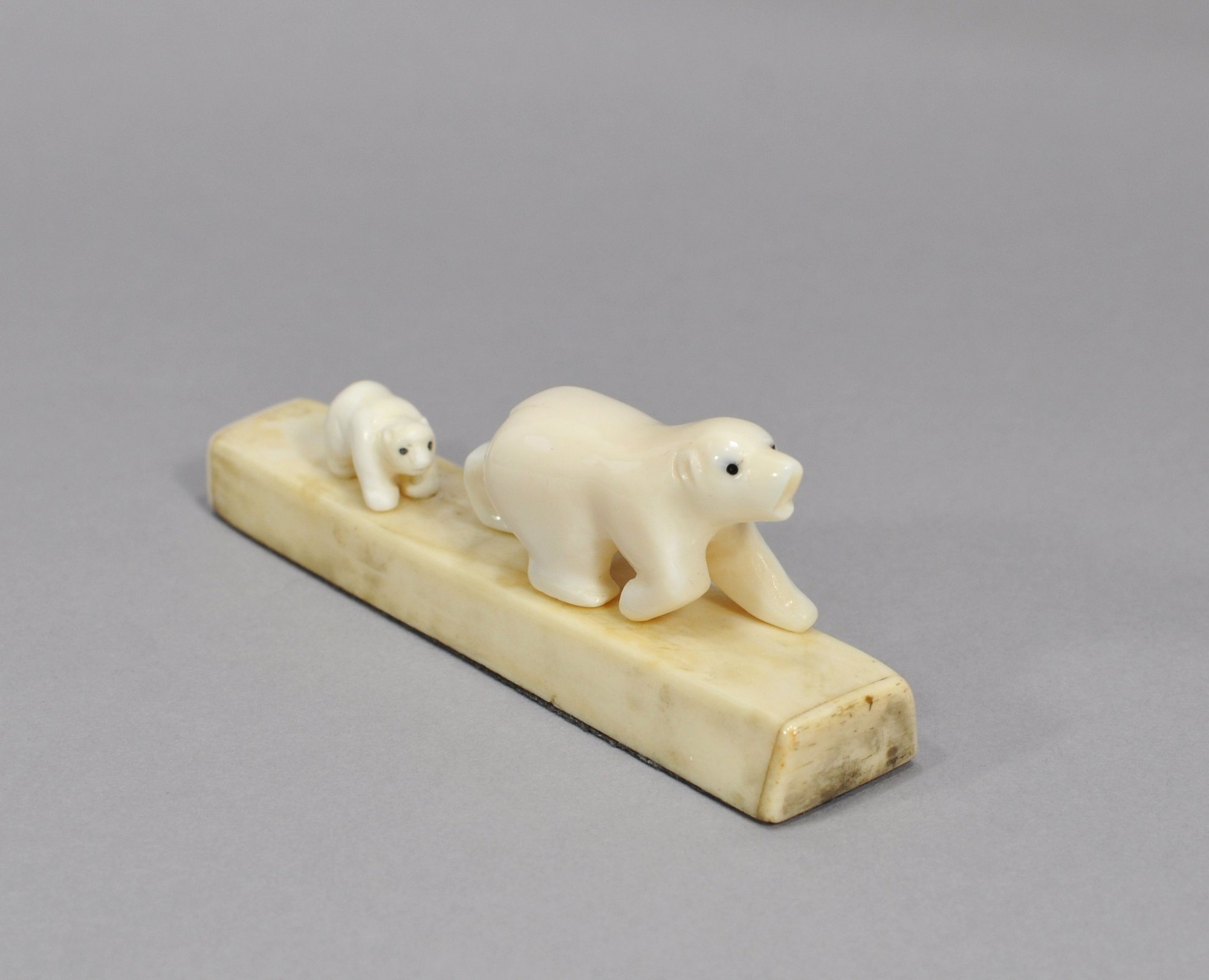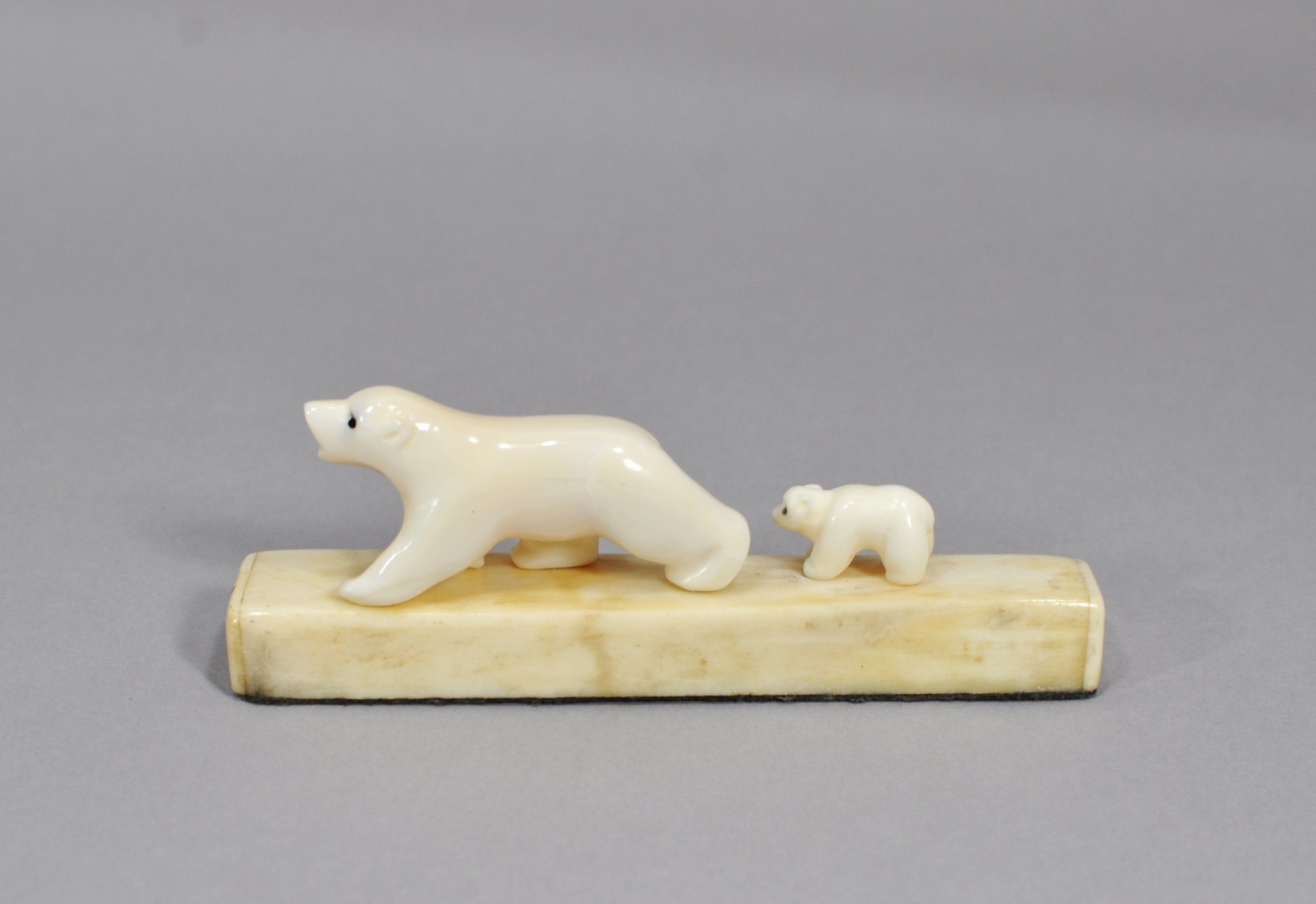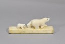 Charming carved figural group depicting a polar bear followed by its cub, carved in a creamy white bone. The bears are finely modeled with simple, expressive forms and inset dark eyes, mounted on a rectangular carved base with felt underside. Likely Inuit or Arctic-inspired decorative carving, mid-20th century.