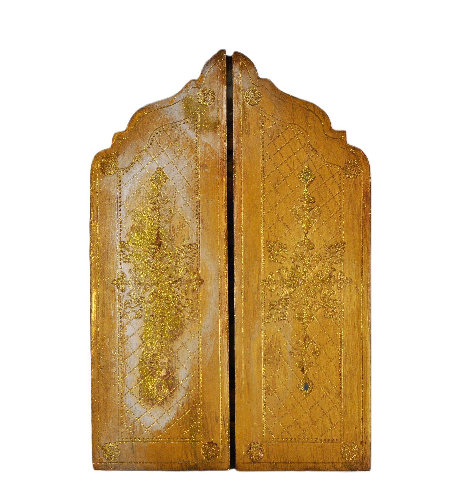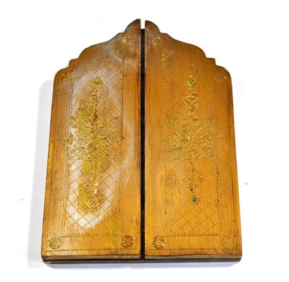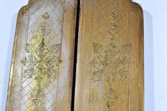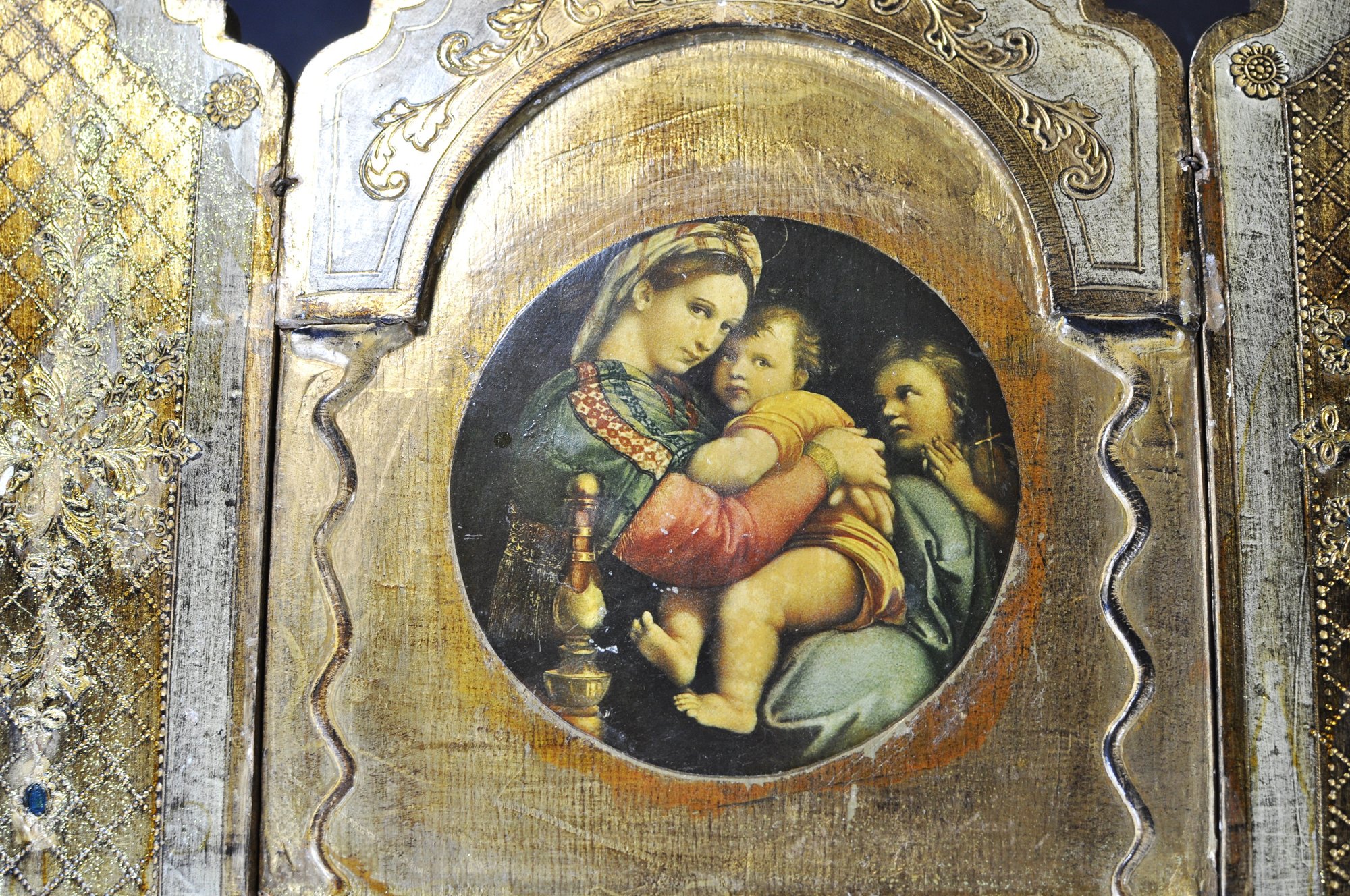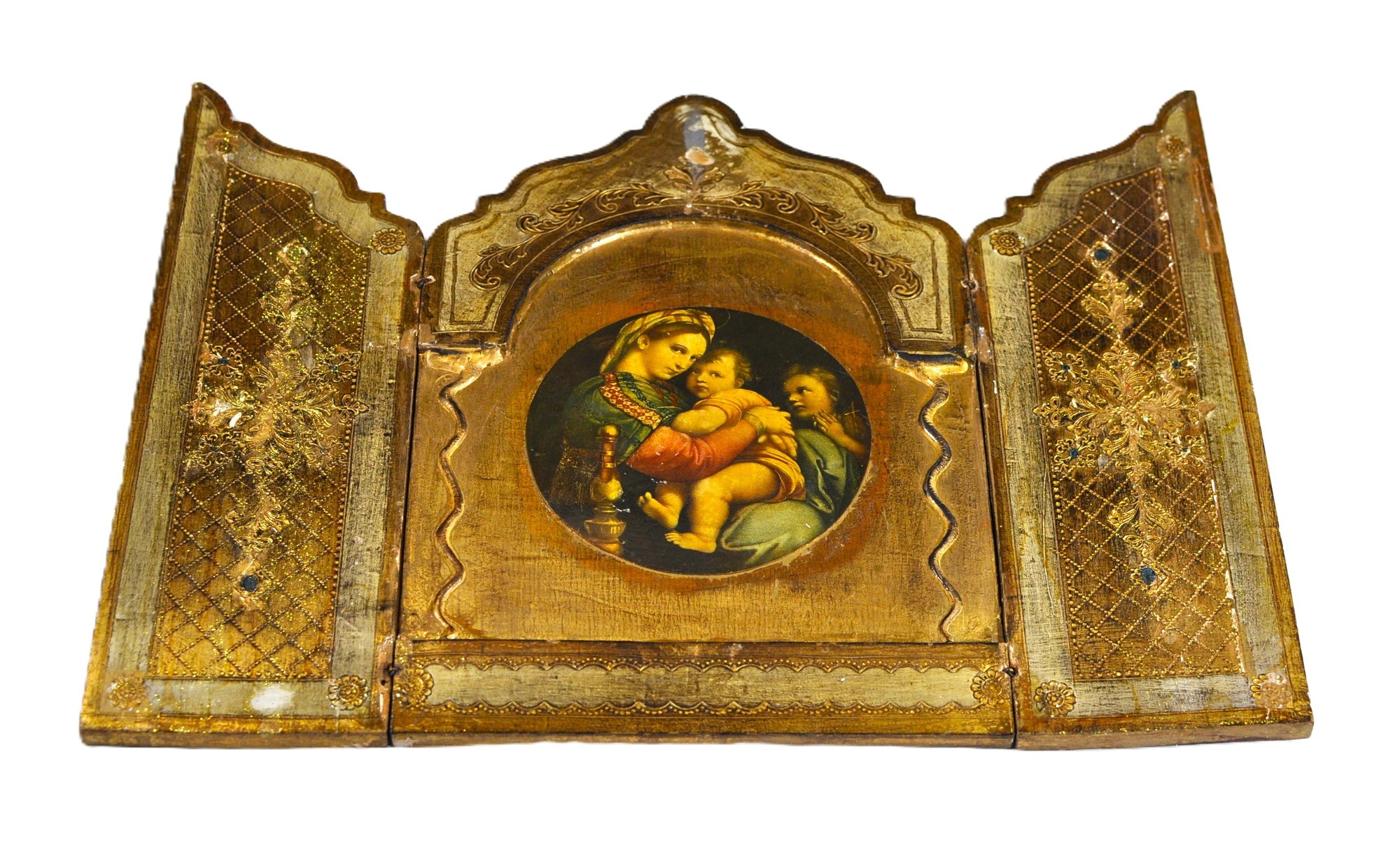 Vintage Italian giltwood folding triptych featuring a central roundel depicting the Madonna and Child with Saint John the Baptist, after a Renaissance master. The flanking panels are richly decorated with incised and gilt geometric and floral motifs, with shaped tops and hinged construction allowing the piece to fold closed.