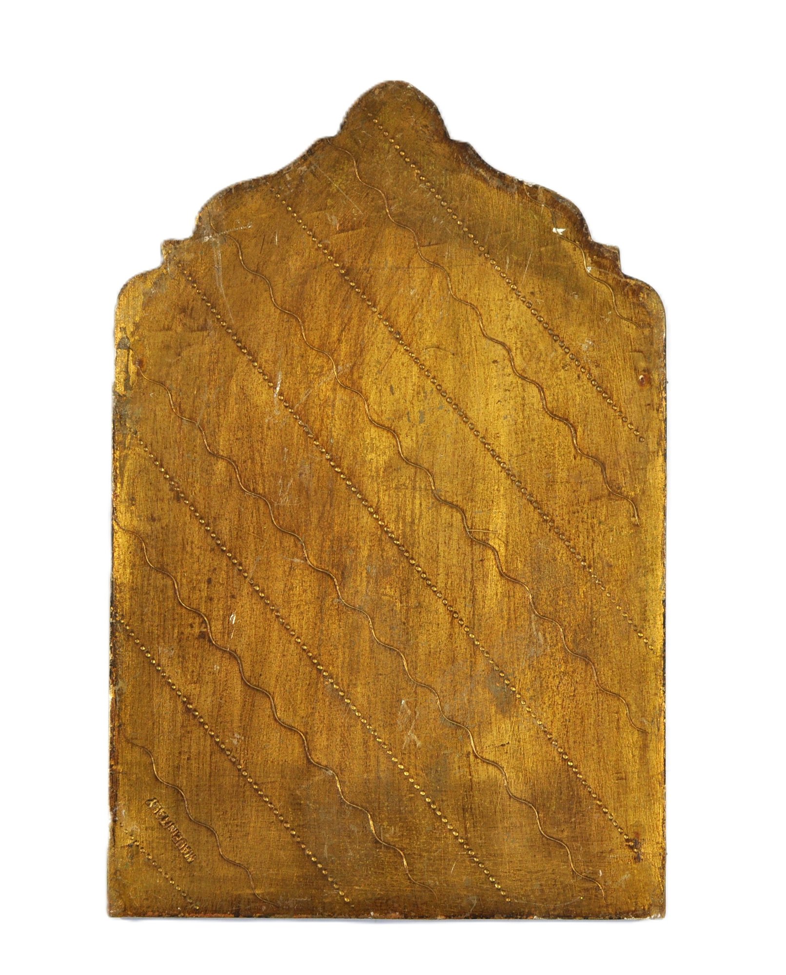 The reverse is stamped “MADE IN ITALY,” consistent with mid-20th-century Italian devotional or decorative export pieces. Finished in warm gilt and bronze tones.