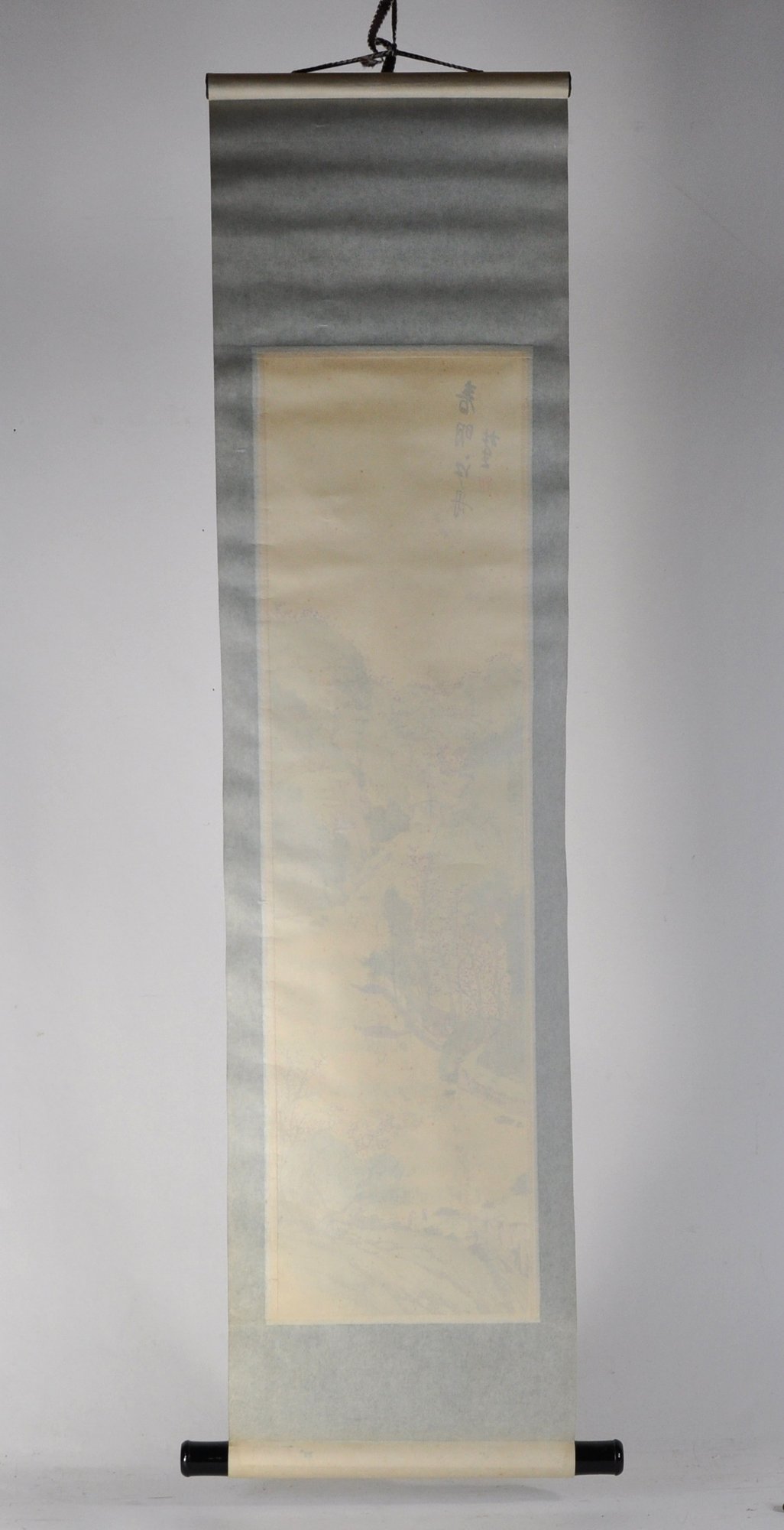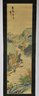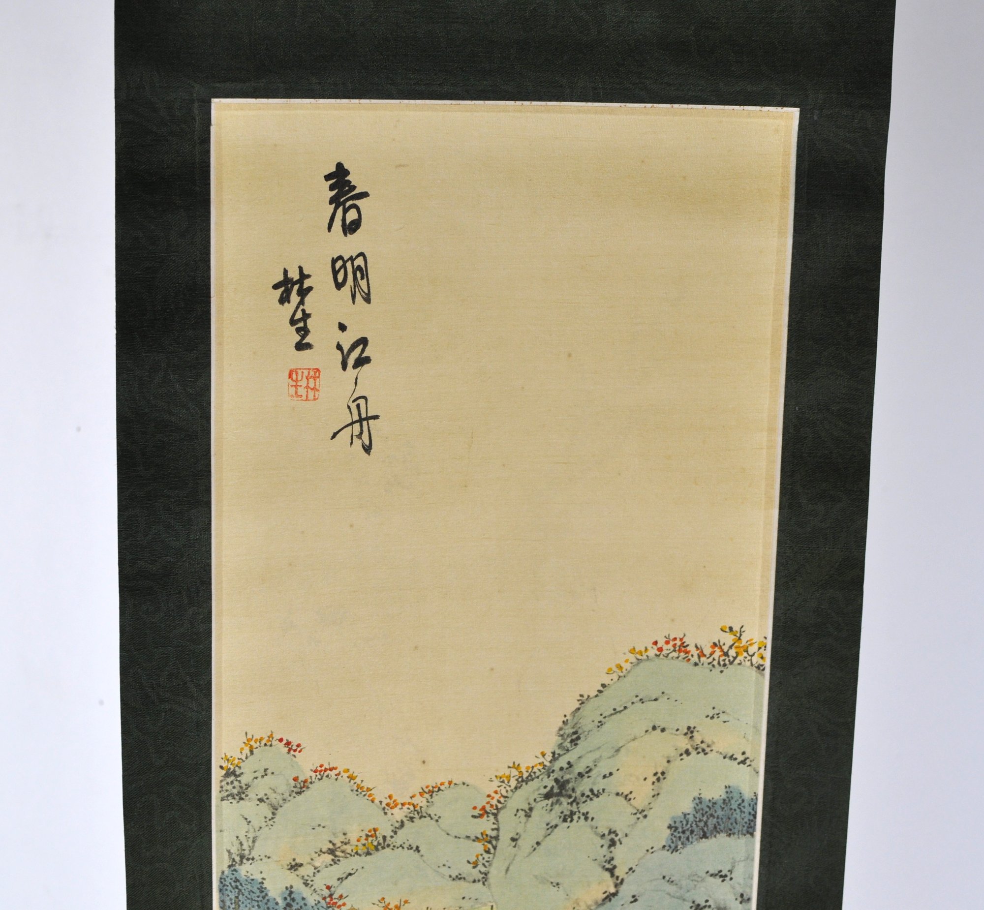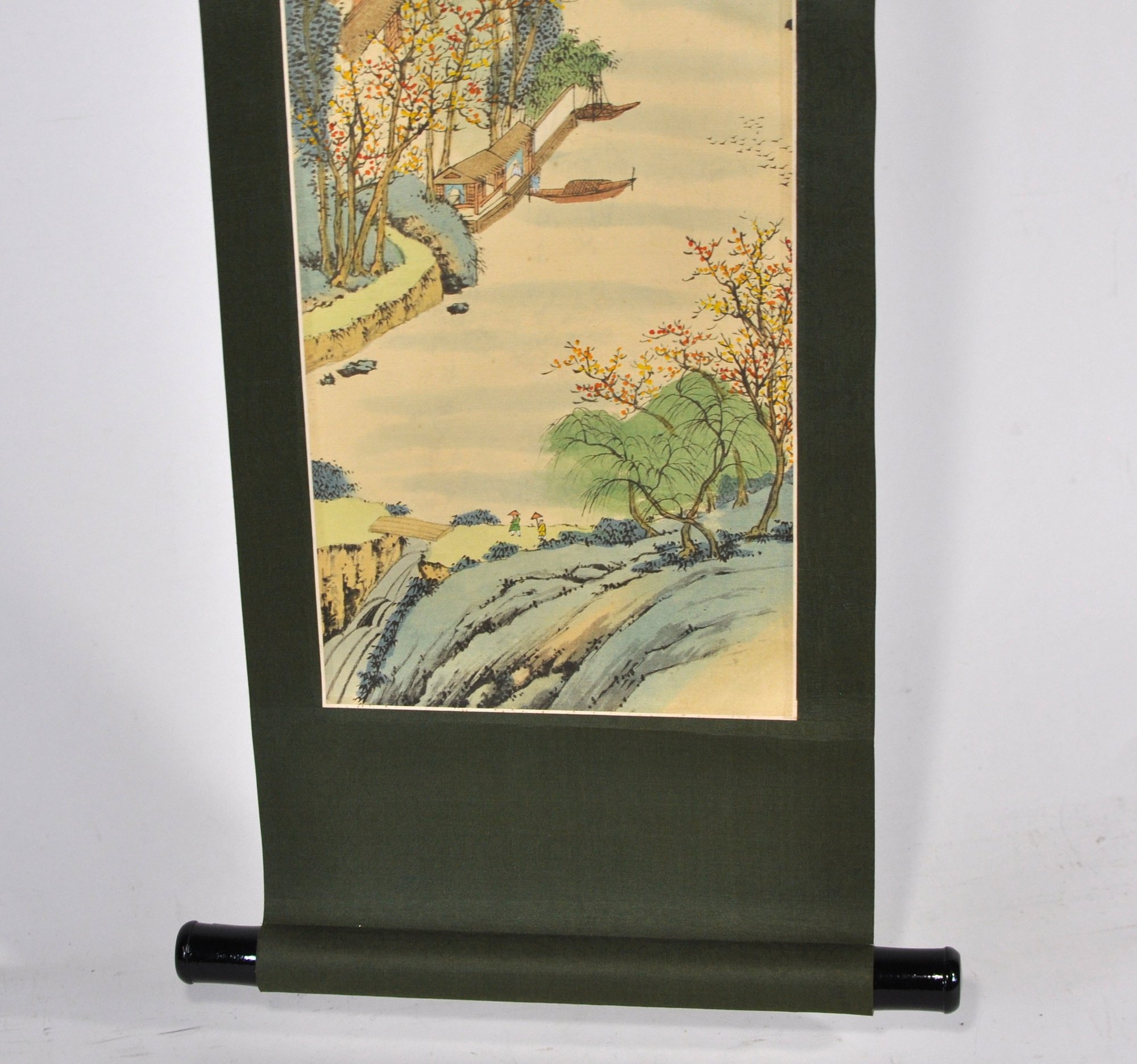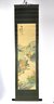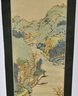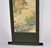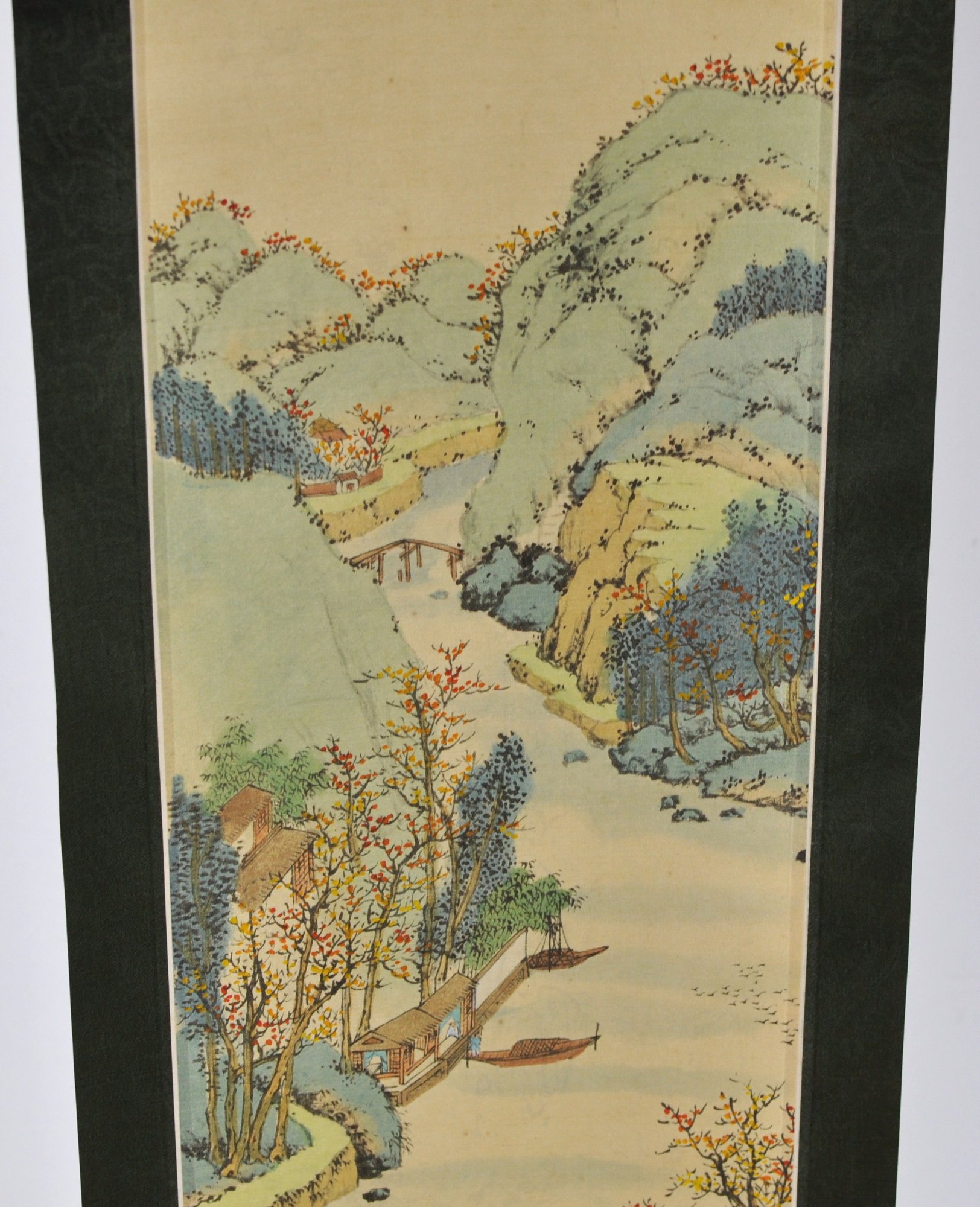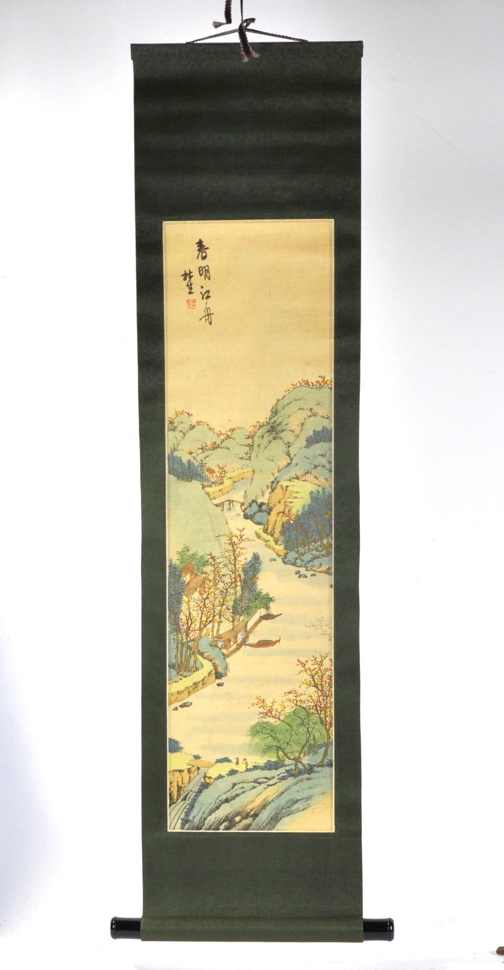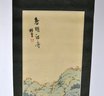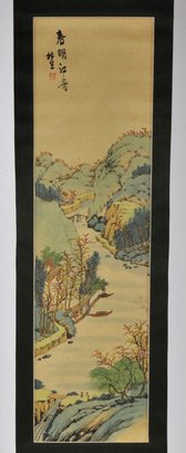 Vertical Japanese hanging scroll featuring a finely detailed landscape scene with rolling mountains, river, boats, bridges, and figures, rendered in soft polychrome tones. The composition is accompanied by Japanese calligraphy and a red seal mark at the upper portion of the image.