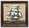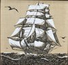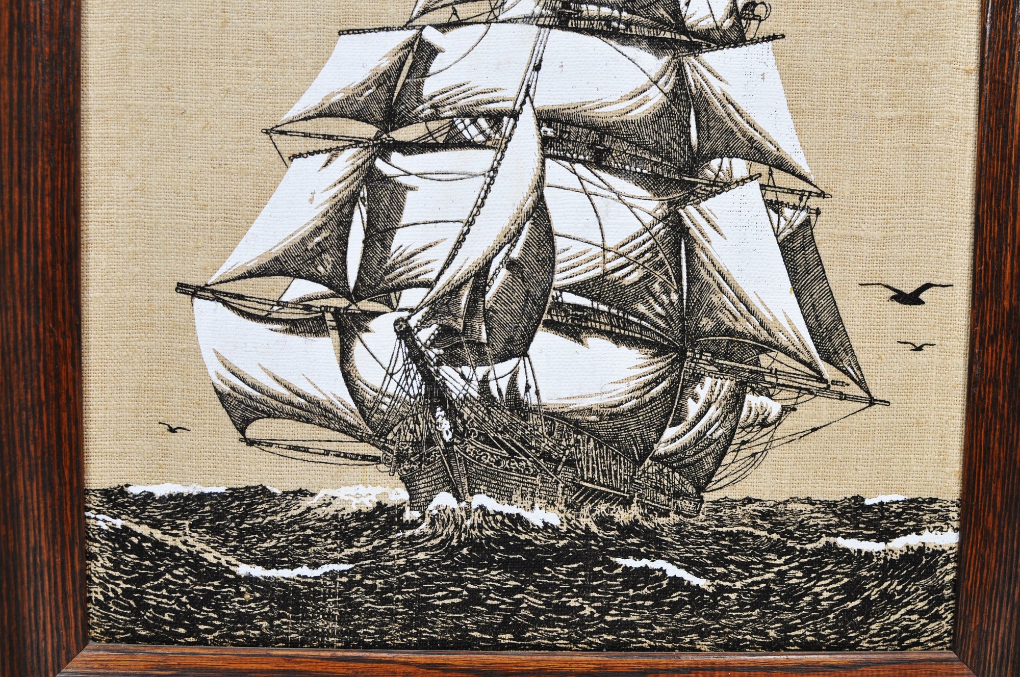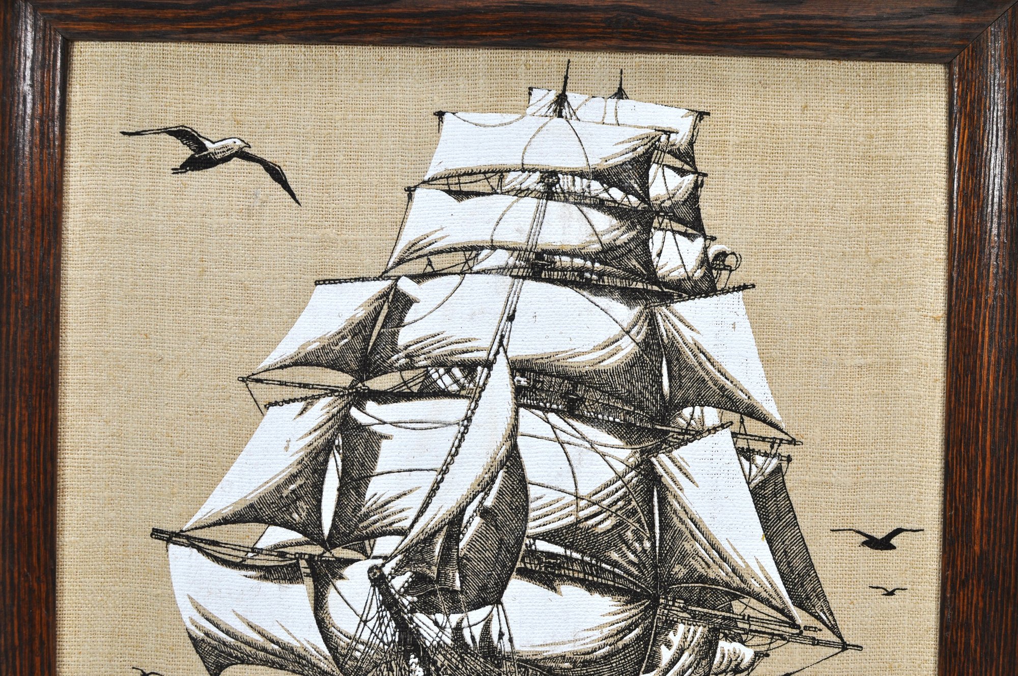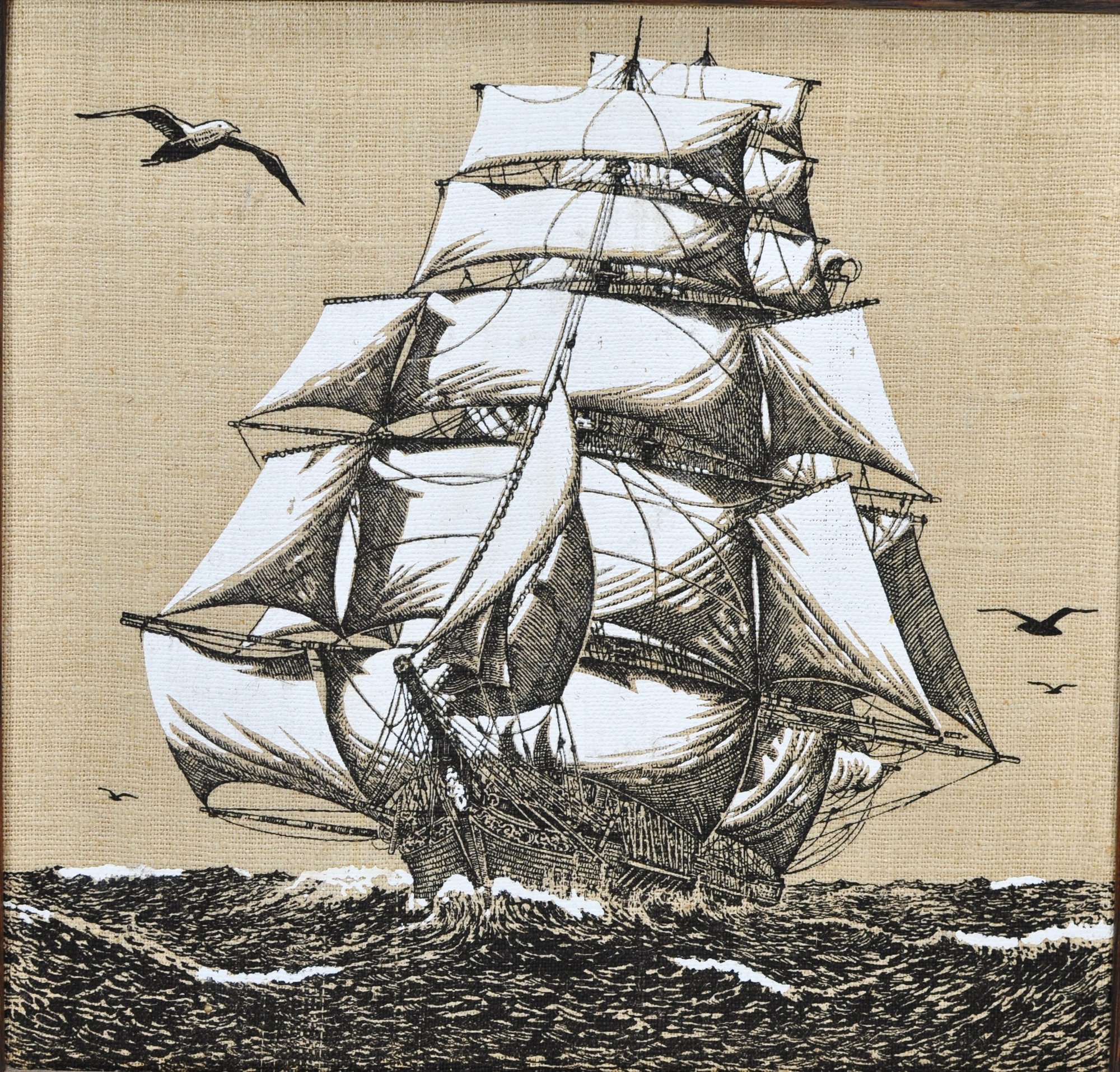 Vintage decorative linen wall art featuring a detailed clipper ship under full sail, executed in black linework on a natural linen ground. The composition shows the vessel cutting through choppy waters with seabirds overhead, executed in a fine, illustrative style reminiscent of maritime engravings.