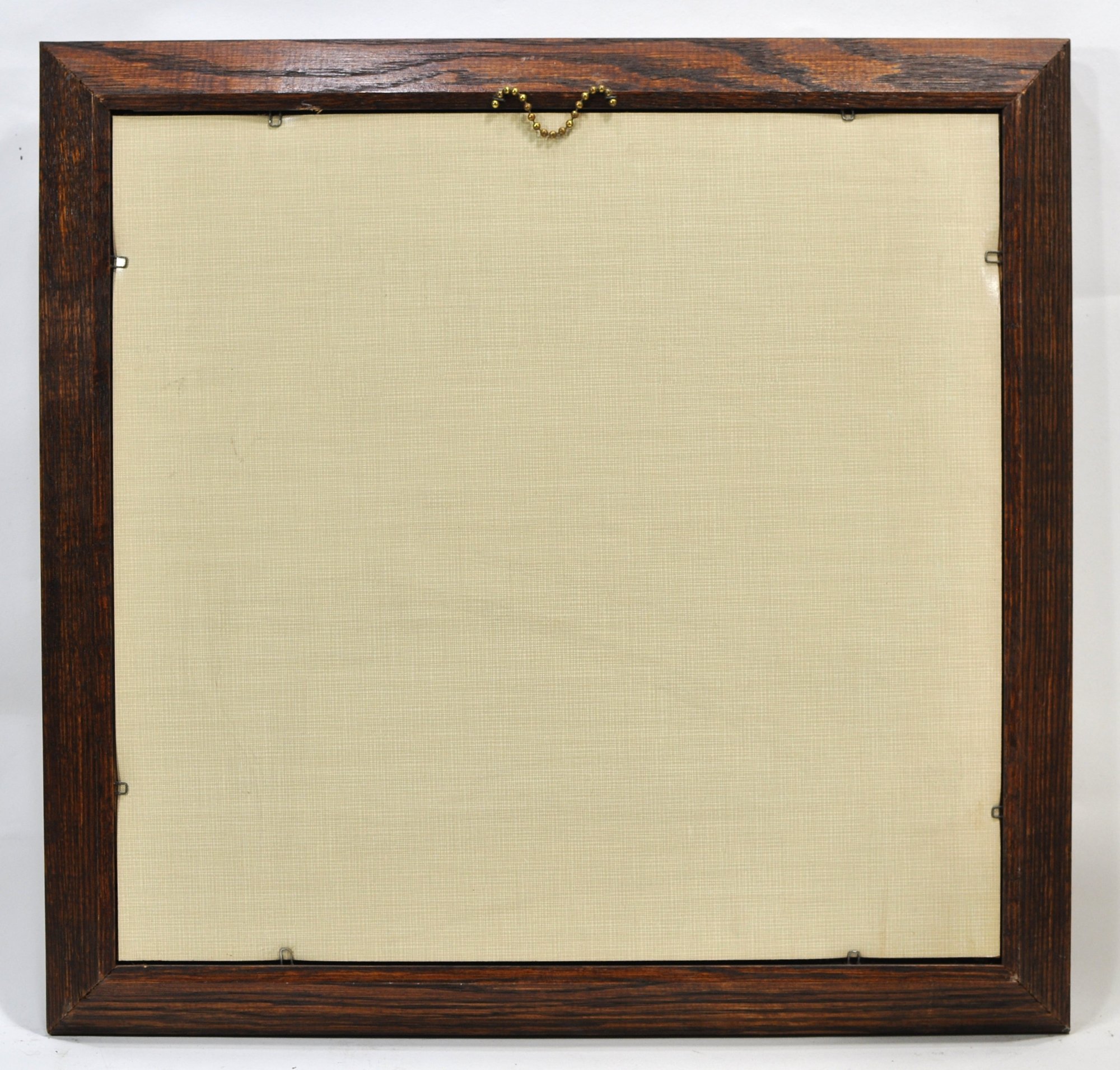 This is a printed textile, typical of mid-20th century Kay Dee Designs, known for producing decorative linen panels and wall hangings. Mounted and presented in oak frame.