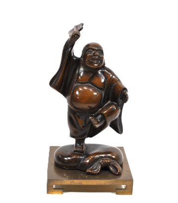 Charming vintage bronzed metal sculpture of Budai, also known as the Laughing Buddha, depicted in a jubilant pose with one foot raised and a fan held aloft. The figure symbolizes joy, prosperity, and abundance, capturing Budai’s playful spirit and uplifting presence. Finely cast with warm bronze patina and expressive detail throughout. Mounted on an elegant square solid brass base with stylized feet.