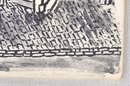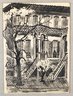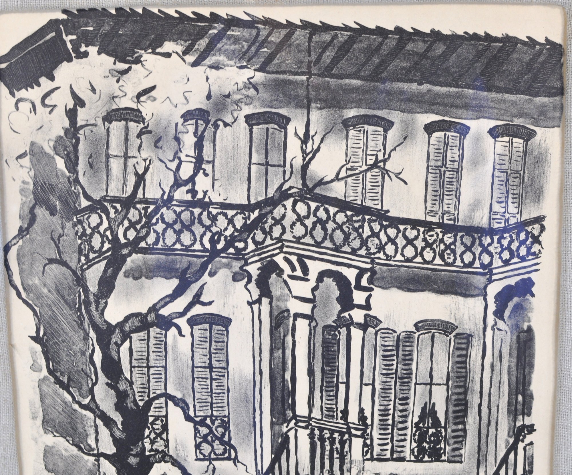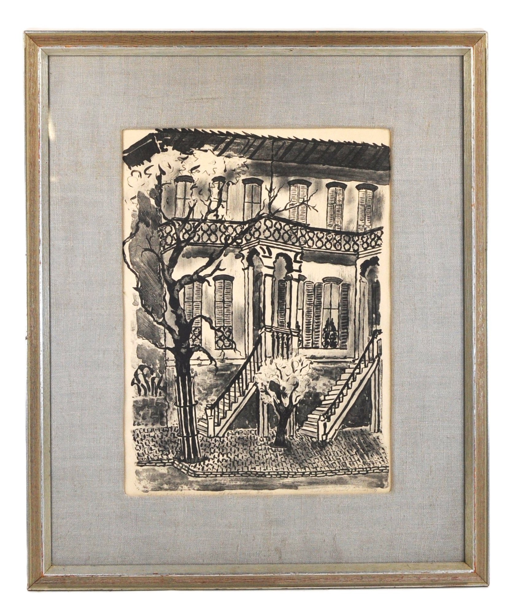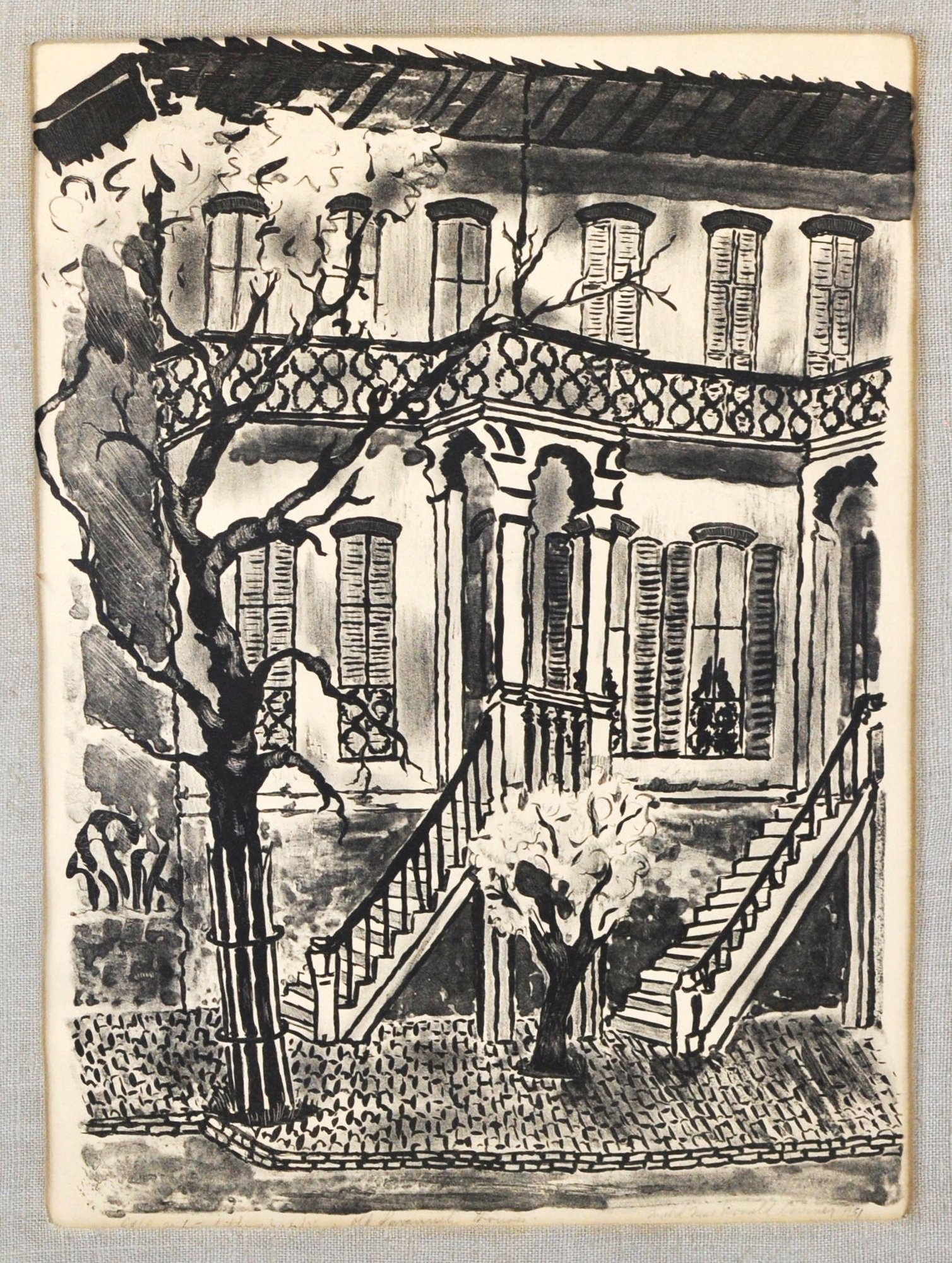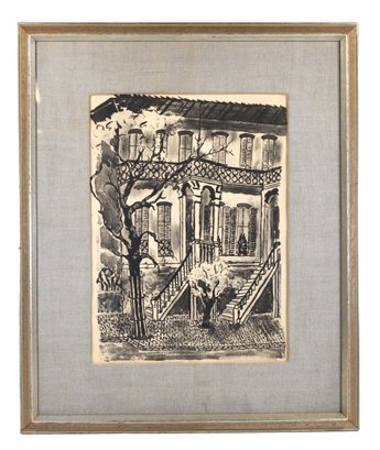 Original vintage lithograph or wash drawing depicting a classic New Orleans French Quarter townhouse with wrought-iron balcony and exterior staircase. Nicely executed in bold black linework with architectural detail and tree foreground.