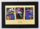 Officially licensed Star Wars color art print featuring a dynamic triptych-style montage of iconic spacecraft and characters, including the Millennium Falcon, TIE fighter schematics, and Rebel pilots. The imagery combines cinematic scenes with technical blueprint-style elements, creating a bold, graphic sci-fi composition.