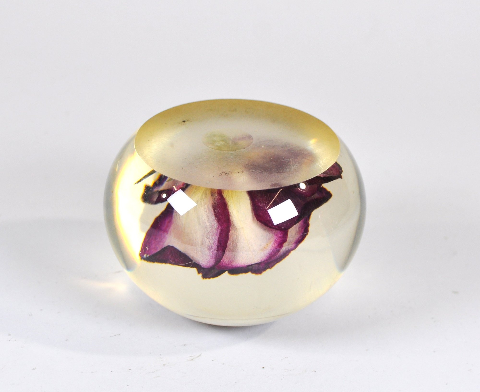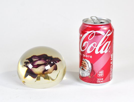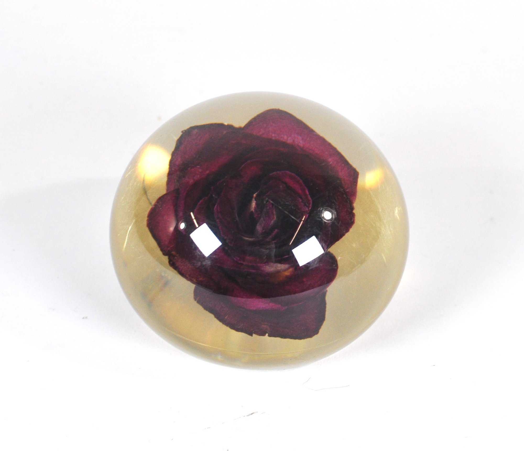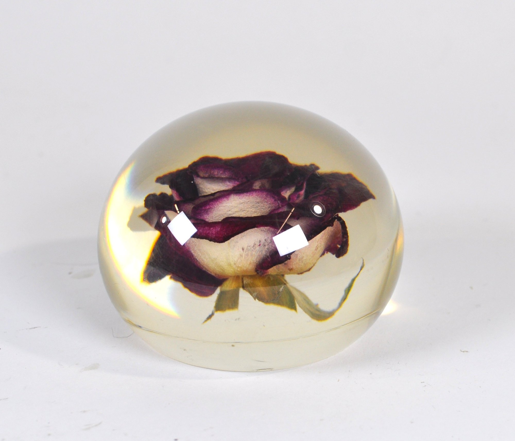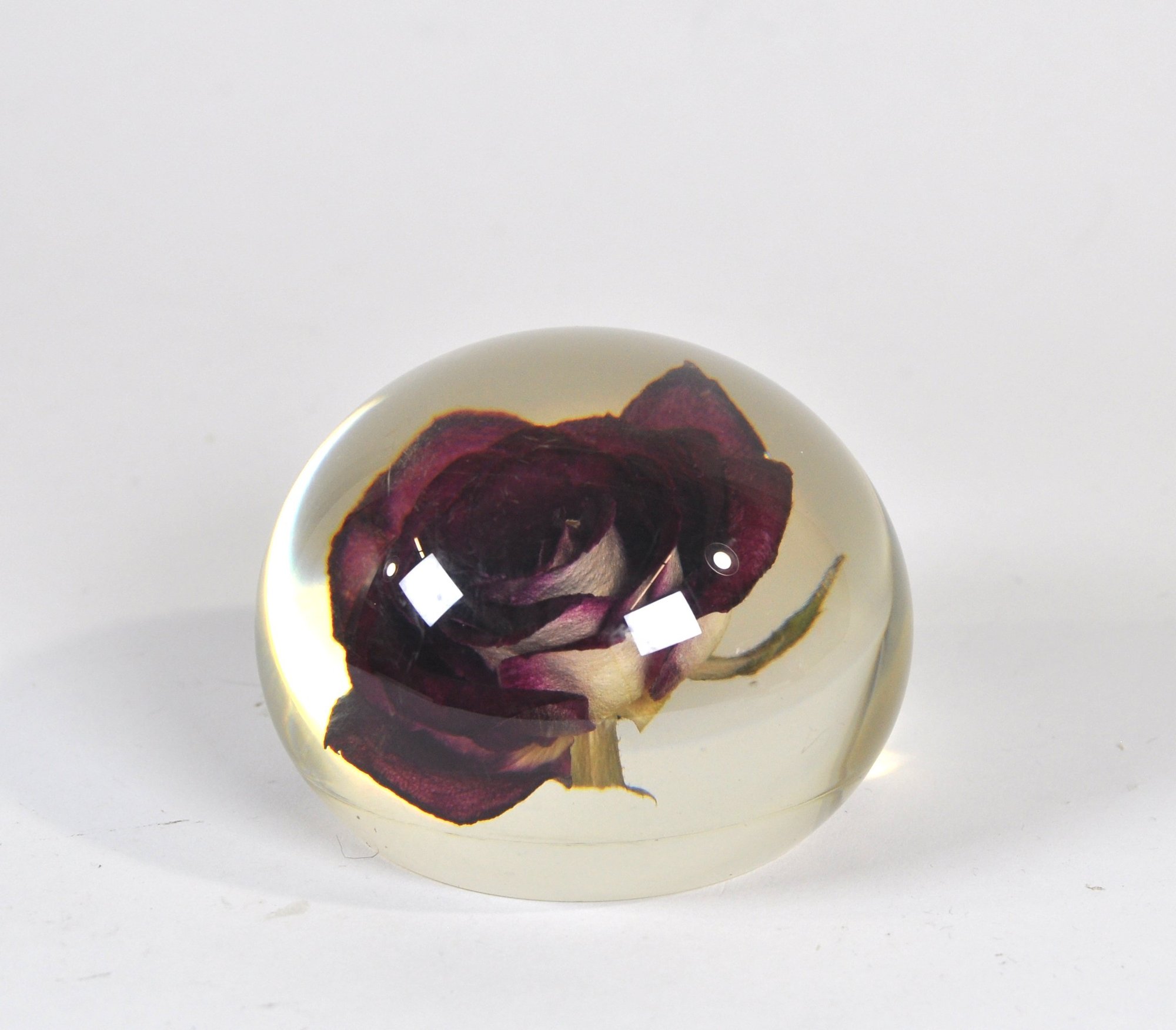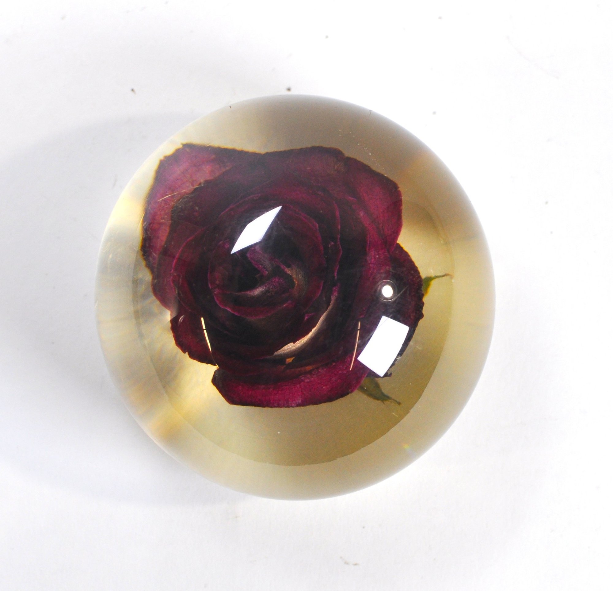 Decorative vintage lucite / resin paperweight featuring a real dried rose flower fully encased within a clear, domed form. The deep burgundy rose is preserved with stem and petals visible, creating a striking botanical display.