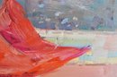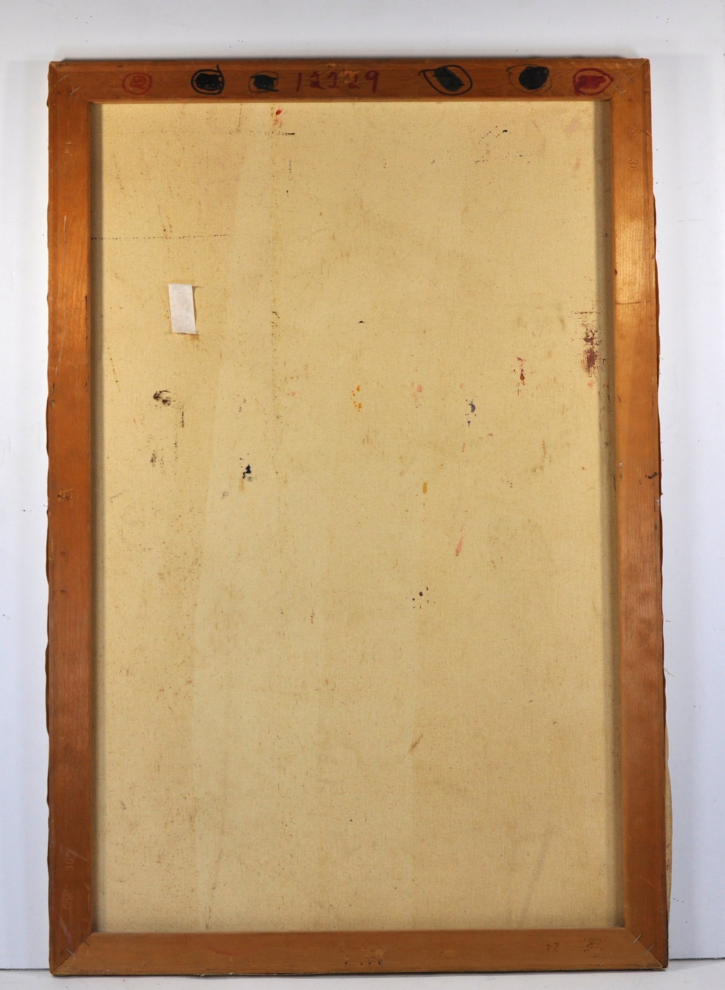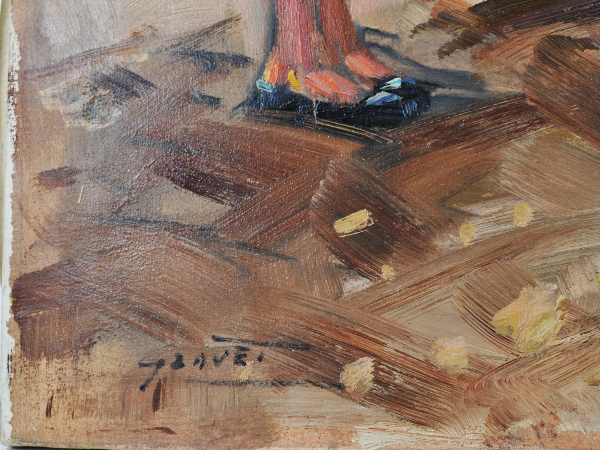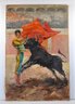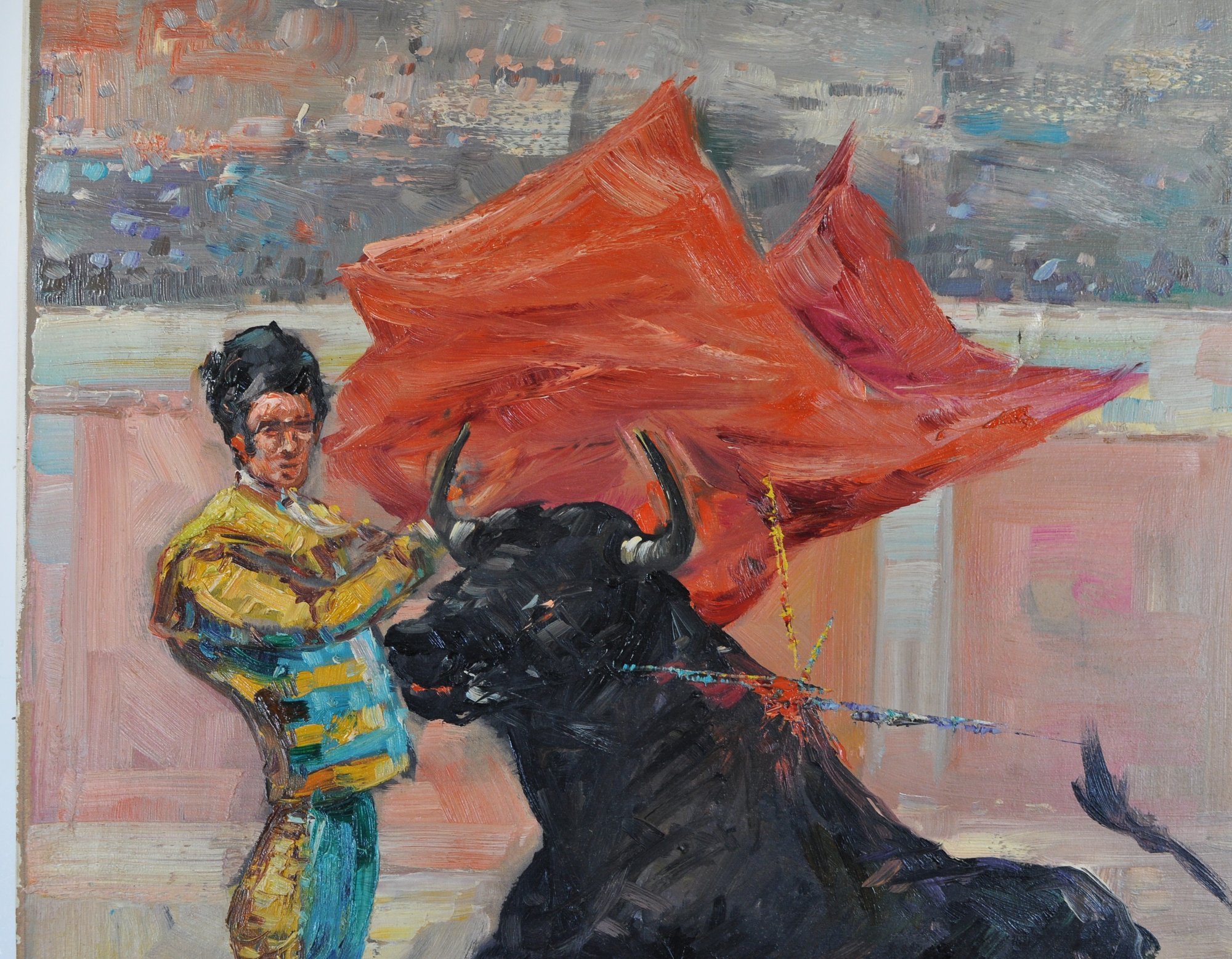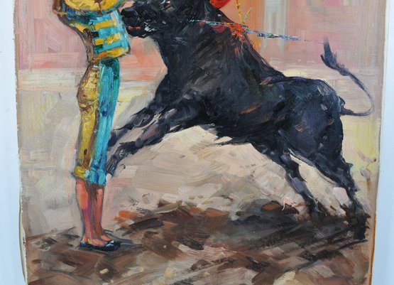 Original oil painting on canvas depicting a dramatic bullfighting scene, showing a matador confronting a charging bull with a sweeping red cape. Illegibly signed lower left.