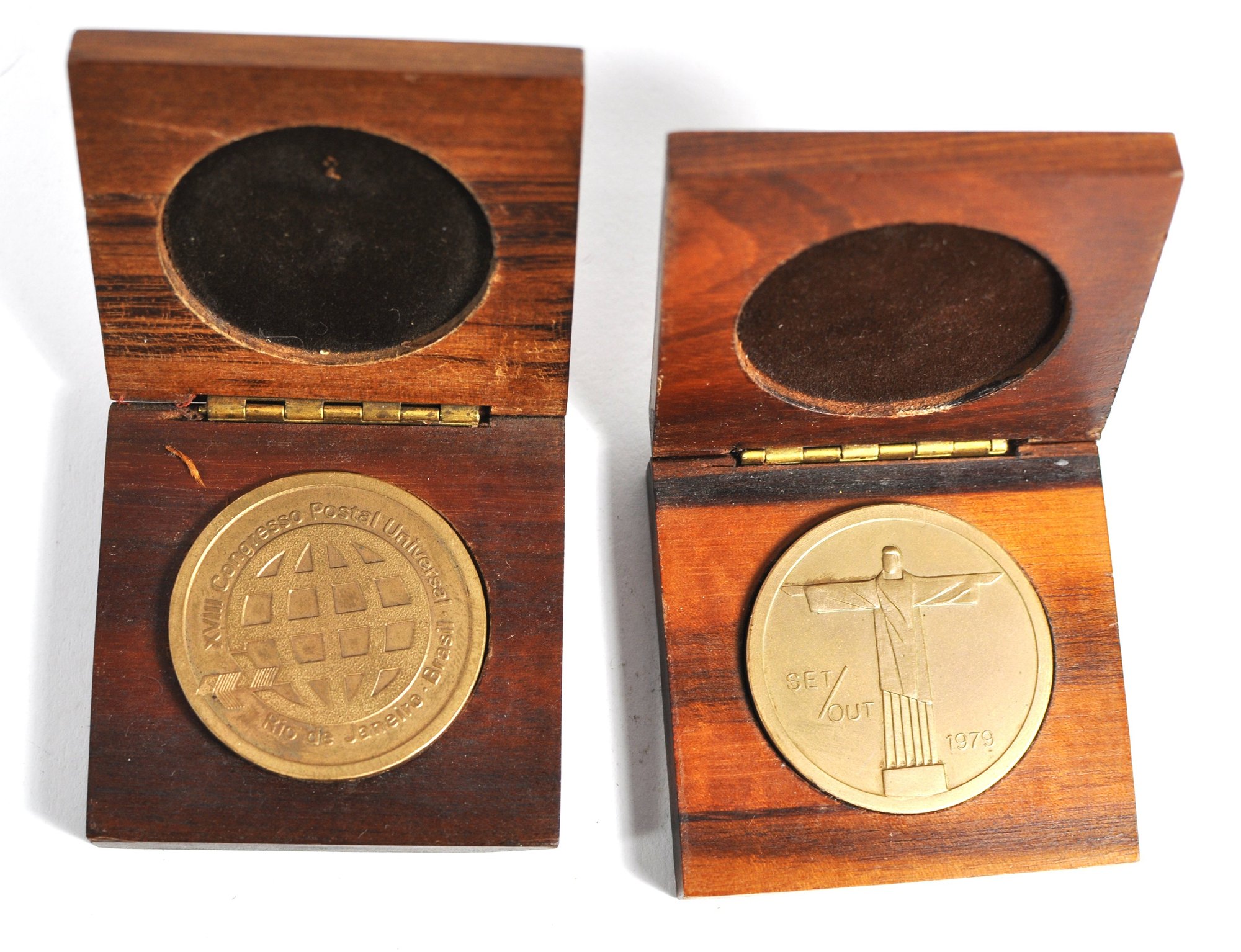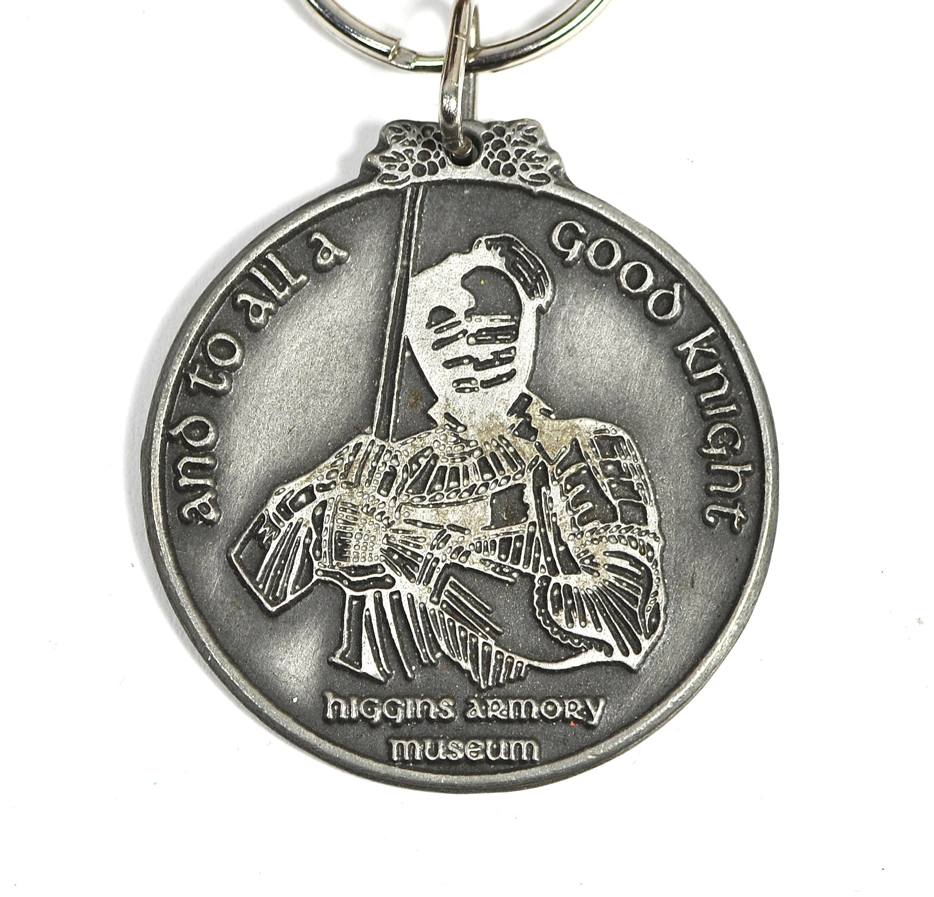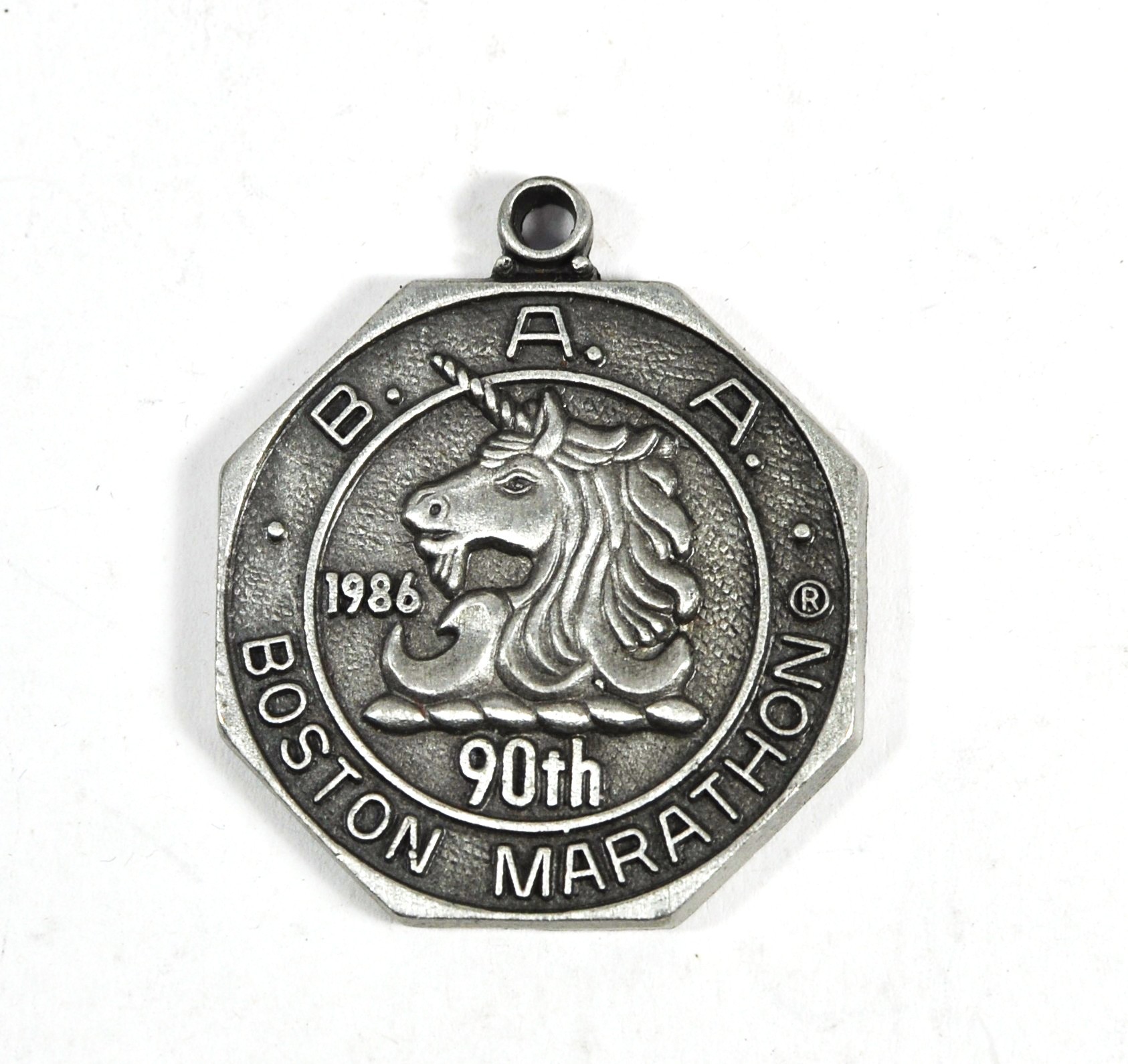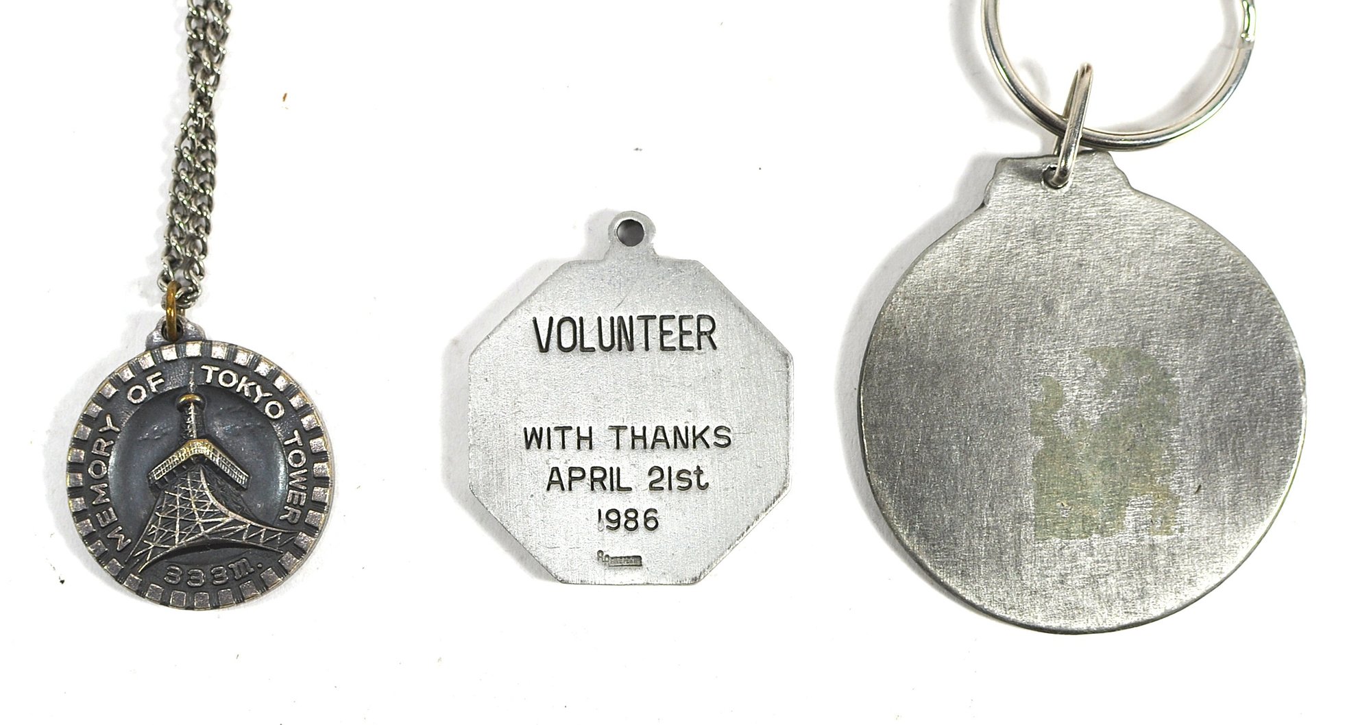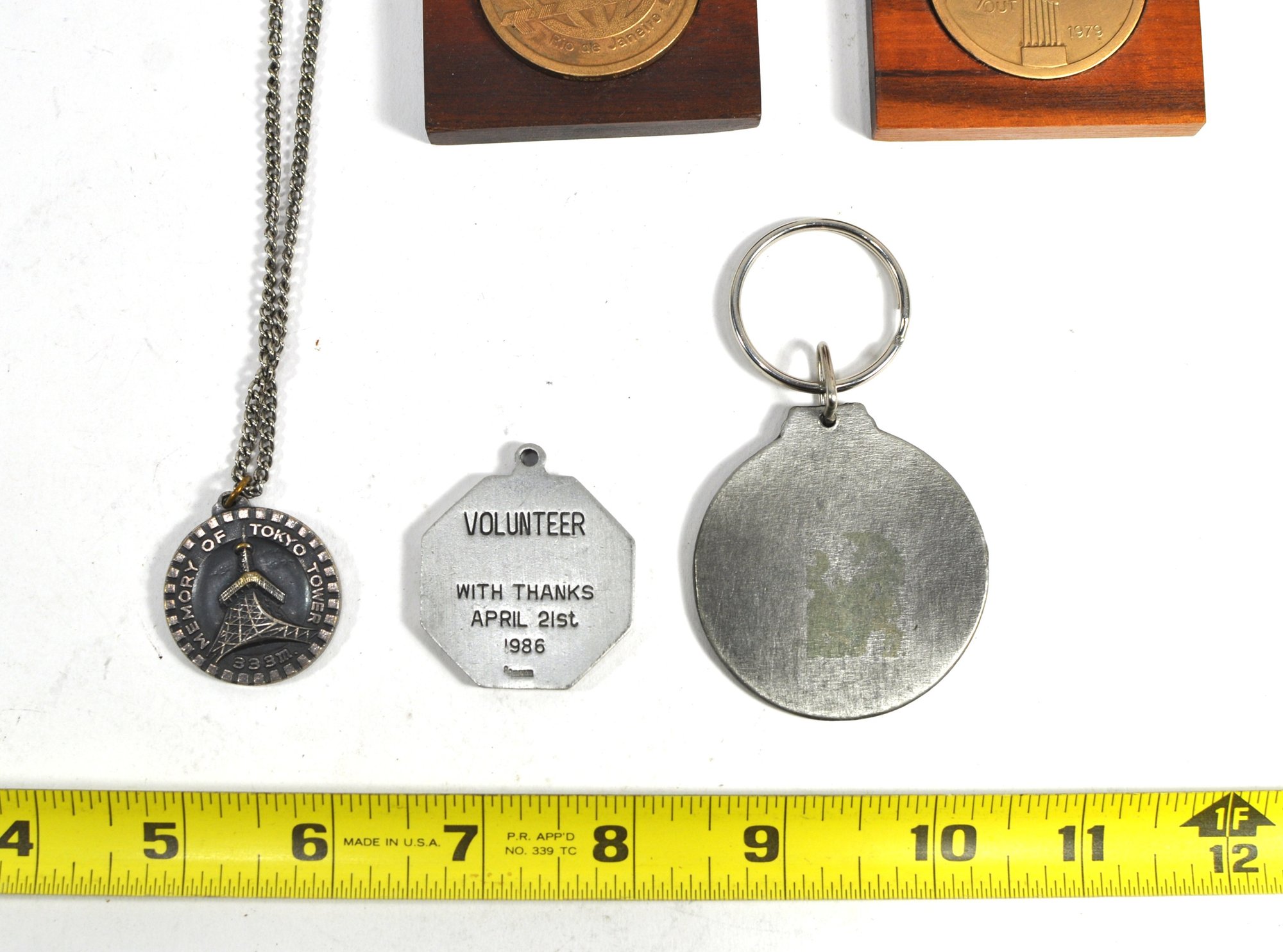 Group of vintage commemorative medals and medallions, including a Tokyo Tower souvenir medallion on chain, a 1986 Boston Marathon 90th anniversary medal, a Higgins Armory Museum “To All a Good Knight” keychain medallion, and two brass medallions housed in hinged wooden presentation cases (one dated 1979).