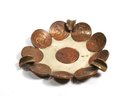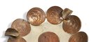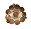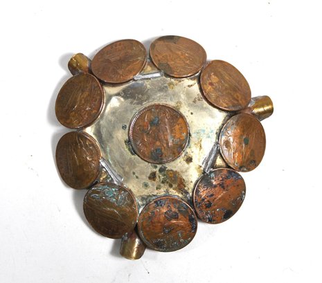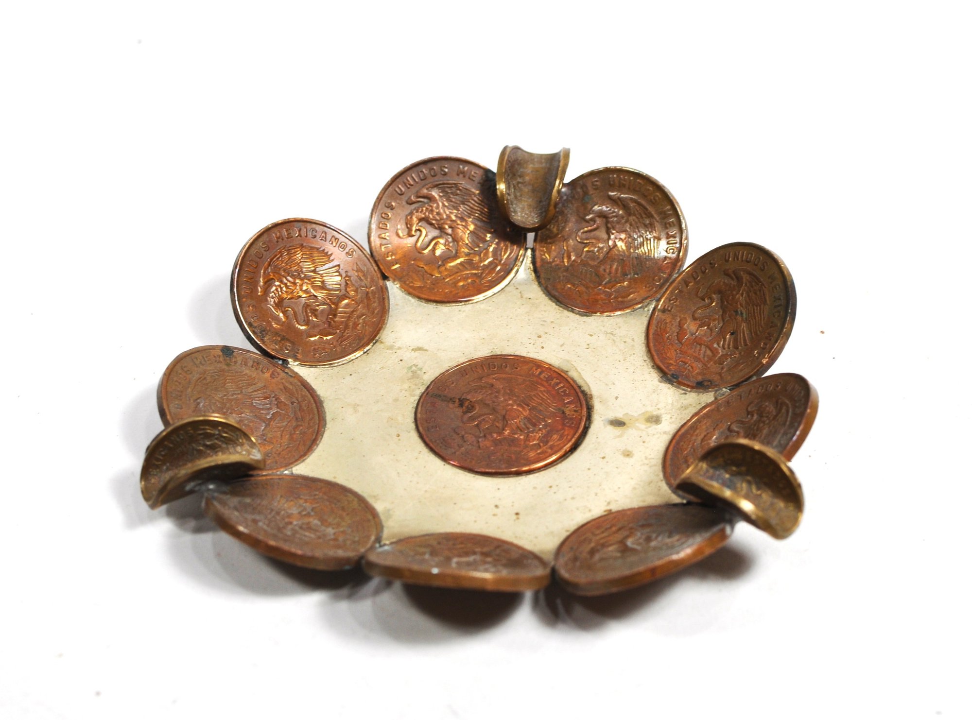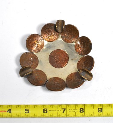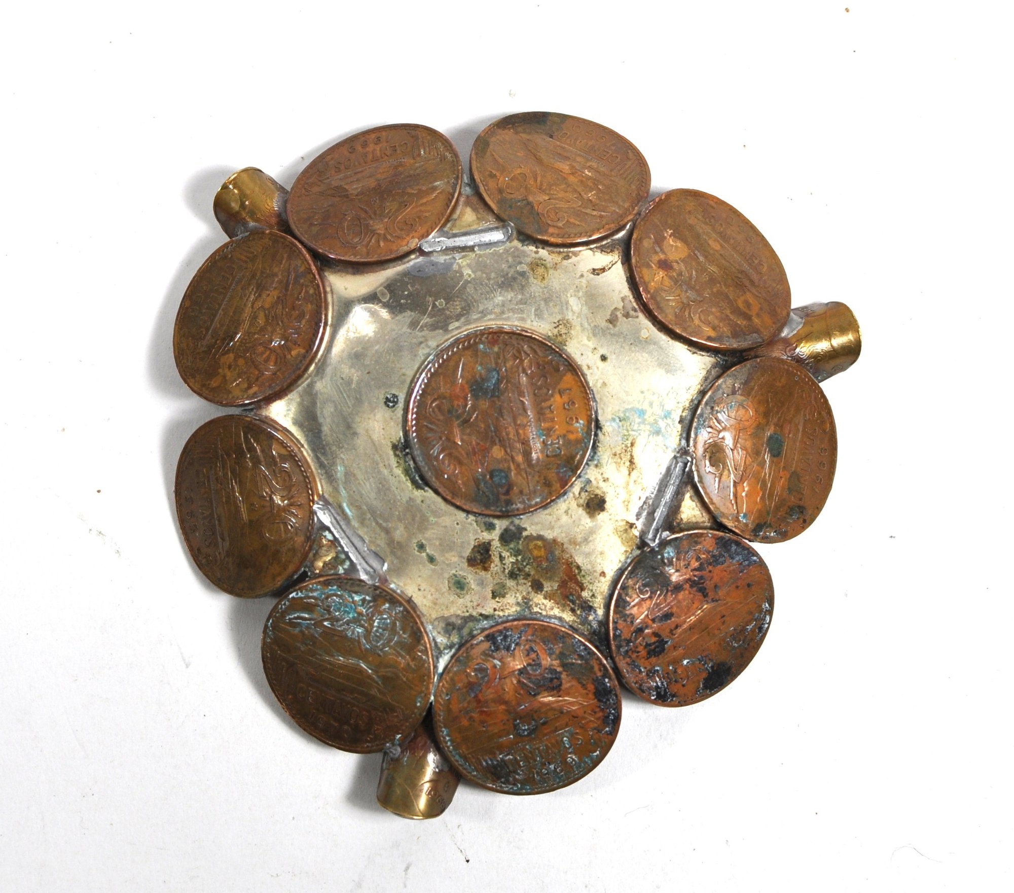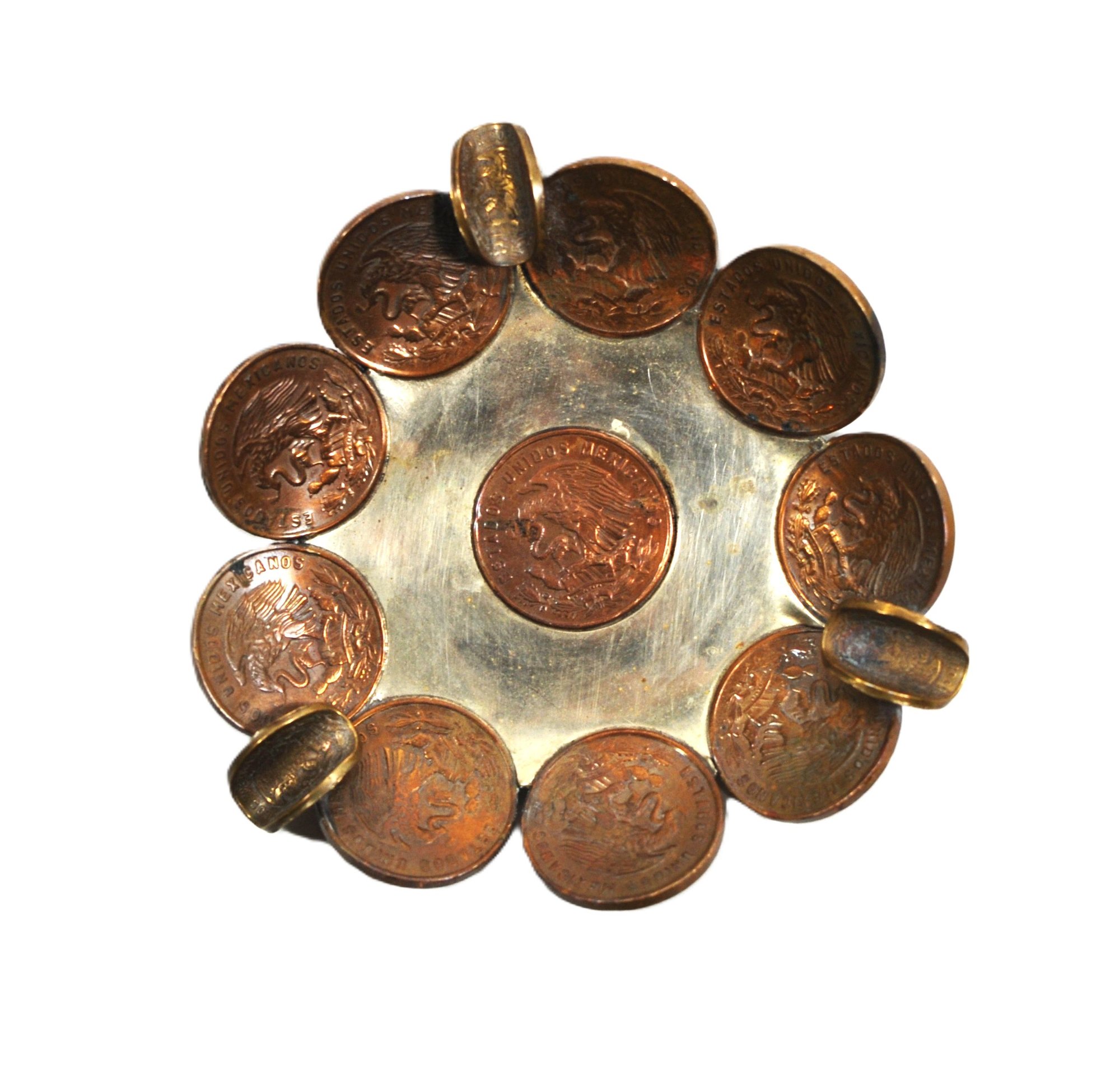 Handmade metal ashtray constructed from a circular arrangement of copper coins mounted to a metal base, with folded brass elements forming cigarette rests. The coins appear to be Mexican centavos, each soldered individually, creating a decorative and functional folk-art object.