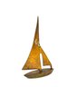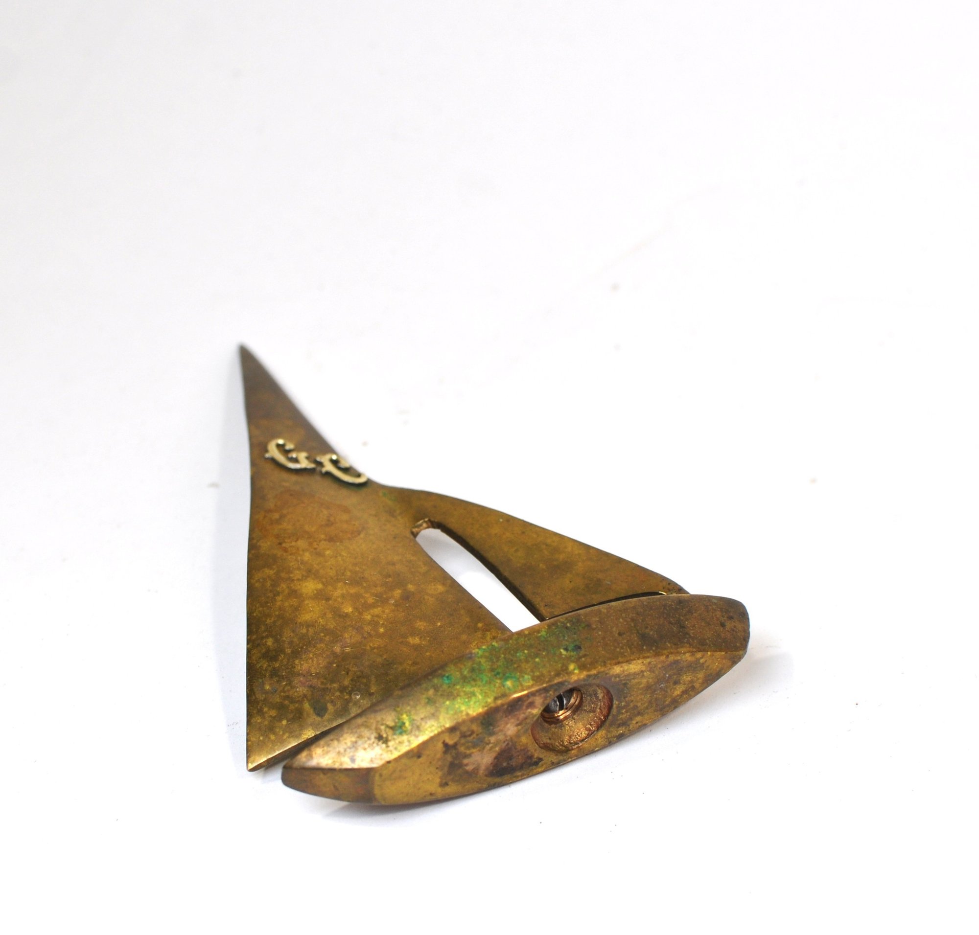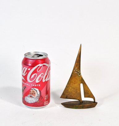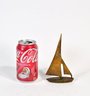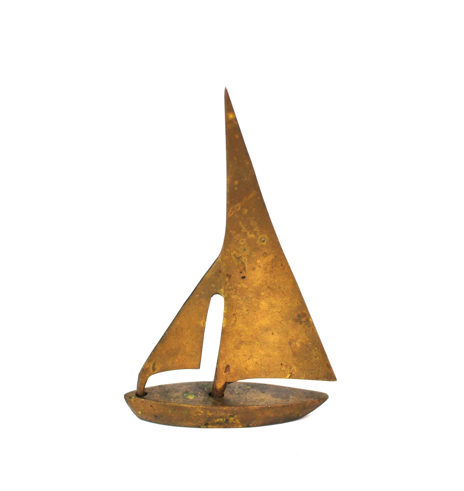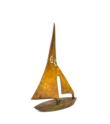 Stylized modernist brass sailboat sculpture in a mid-century style, featuring an abstract sail form and boat hull with applied “C R” monogram. Warm aged patina. Attractive nautical-themed decorative piece.