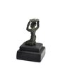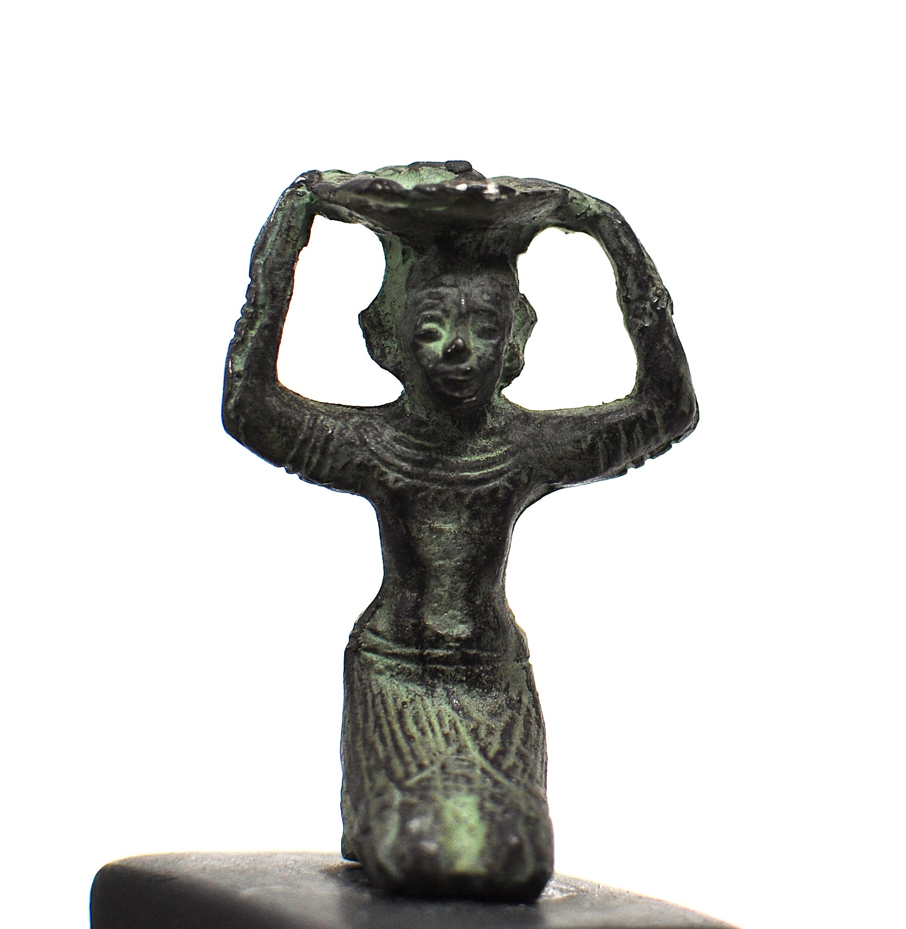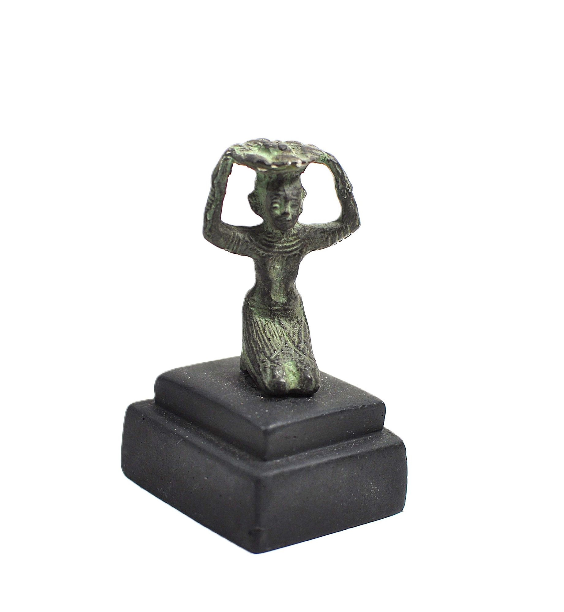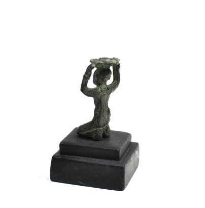 Offered is a vintage miniature bronze sculpture depicting a kneeling female figure holding a shallow tray or platter raised above her head. The figure is executed in a stylized, simplified form with incised facial features and garment details. The surface exhibits a dark bronze tone with areas of green patina consistent with age and oxidation. Likely mid-century in period.