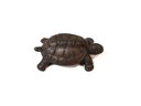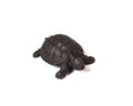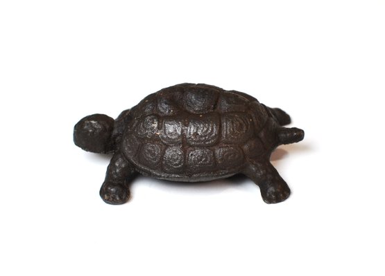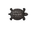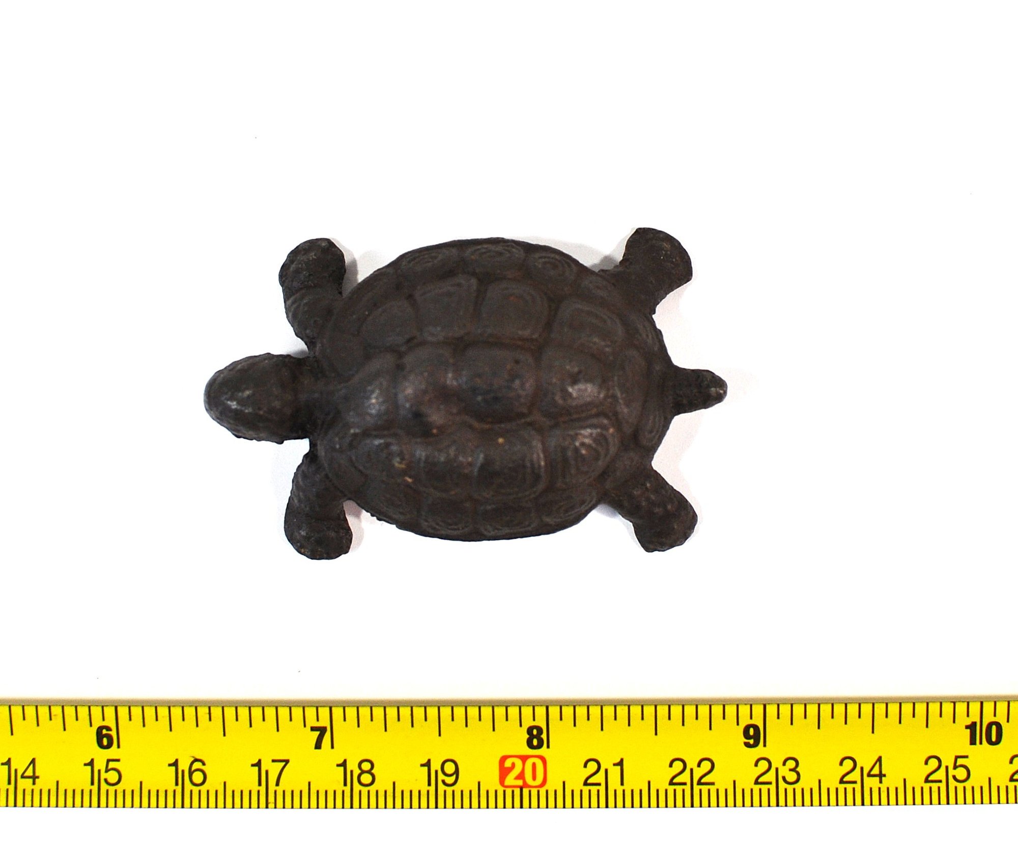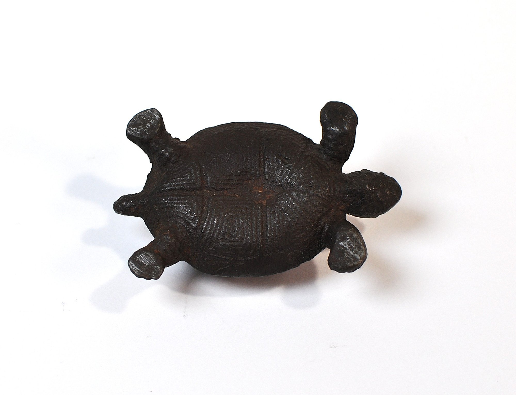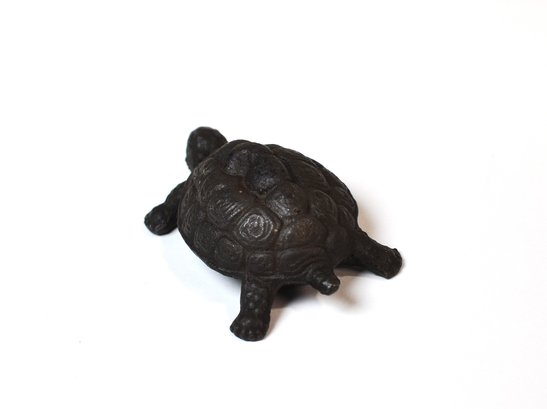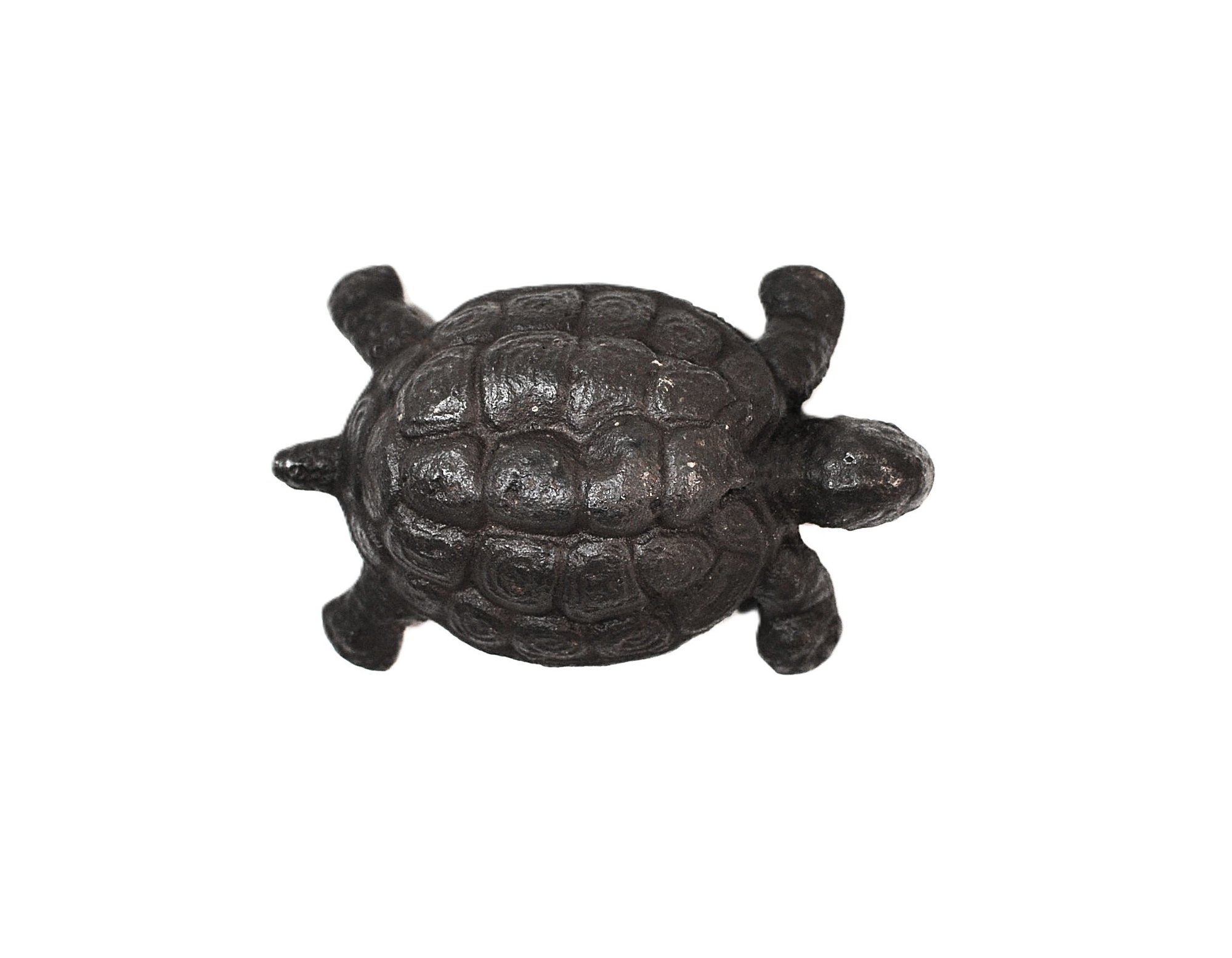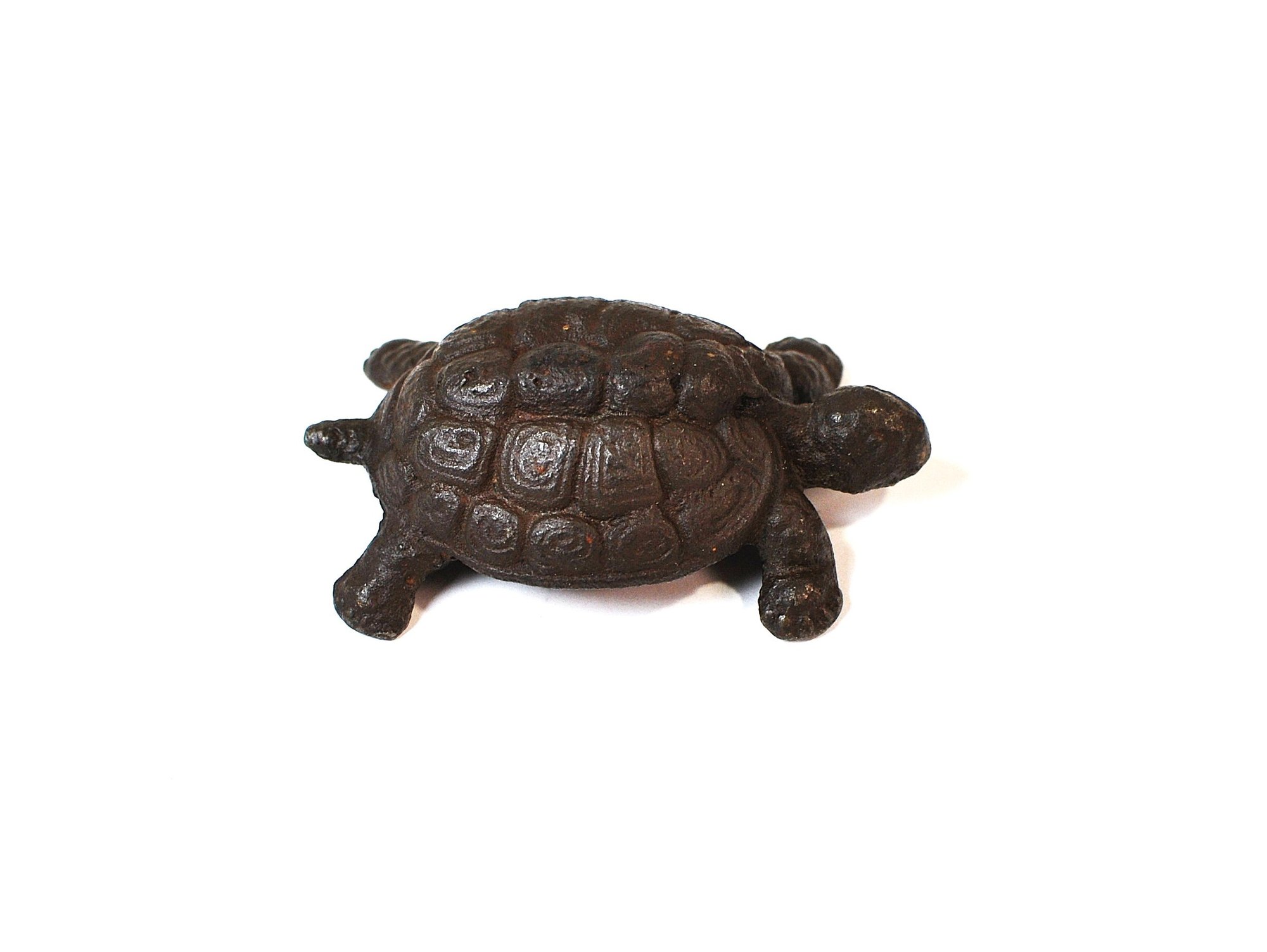 Solid cast iron turtle figurine with textured shell and dark, aged surface. Heavy for its size, suitable as a paperweight or decorative object.