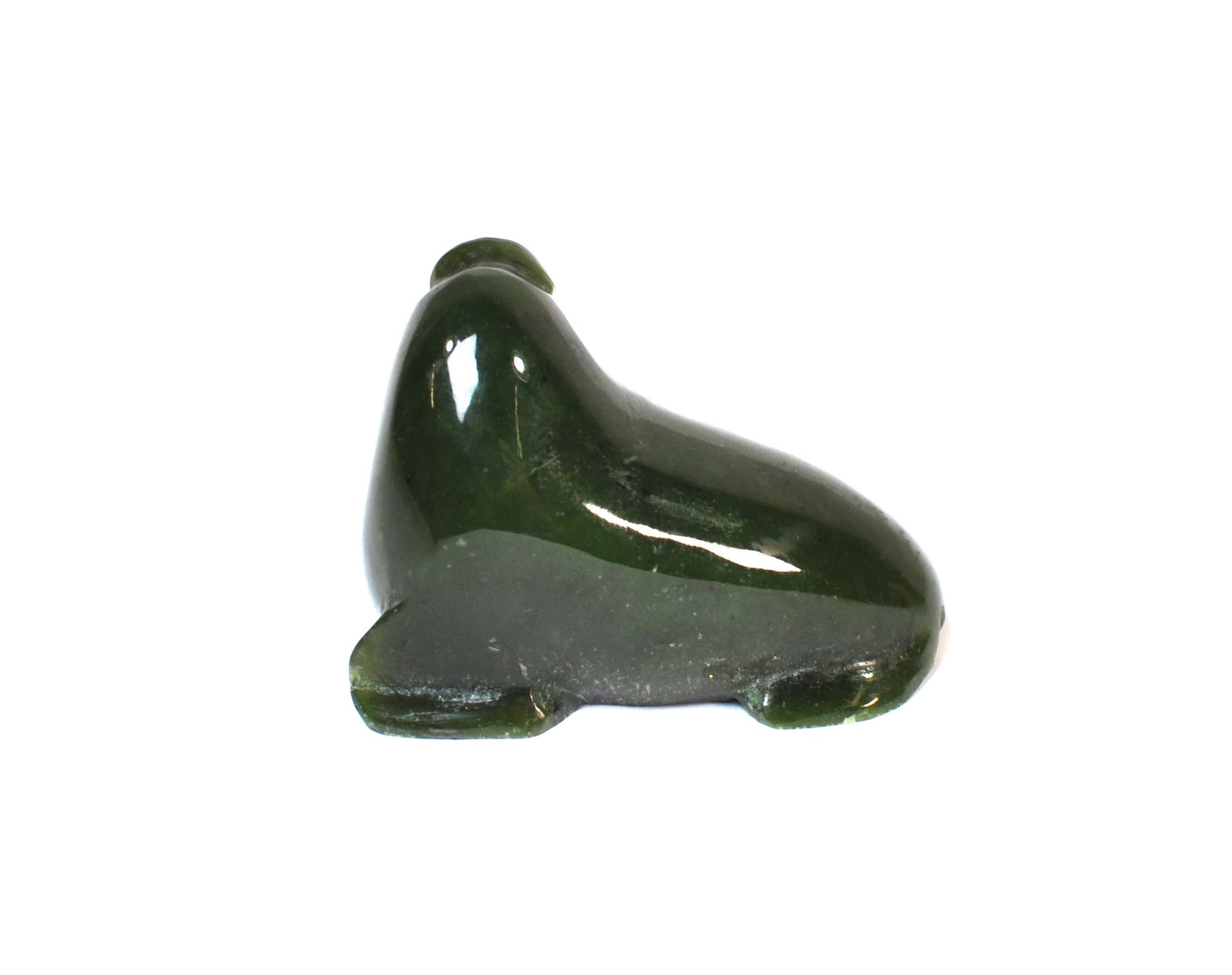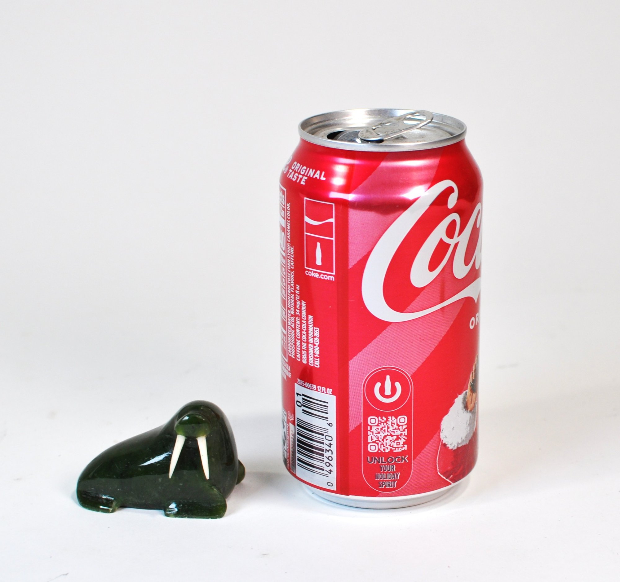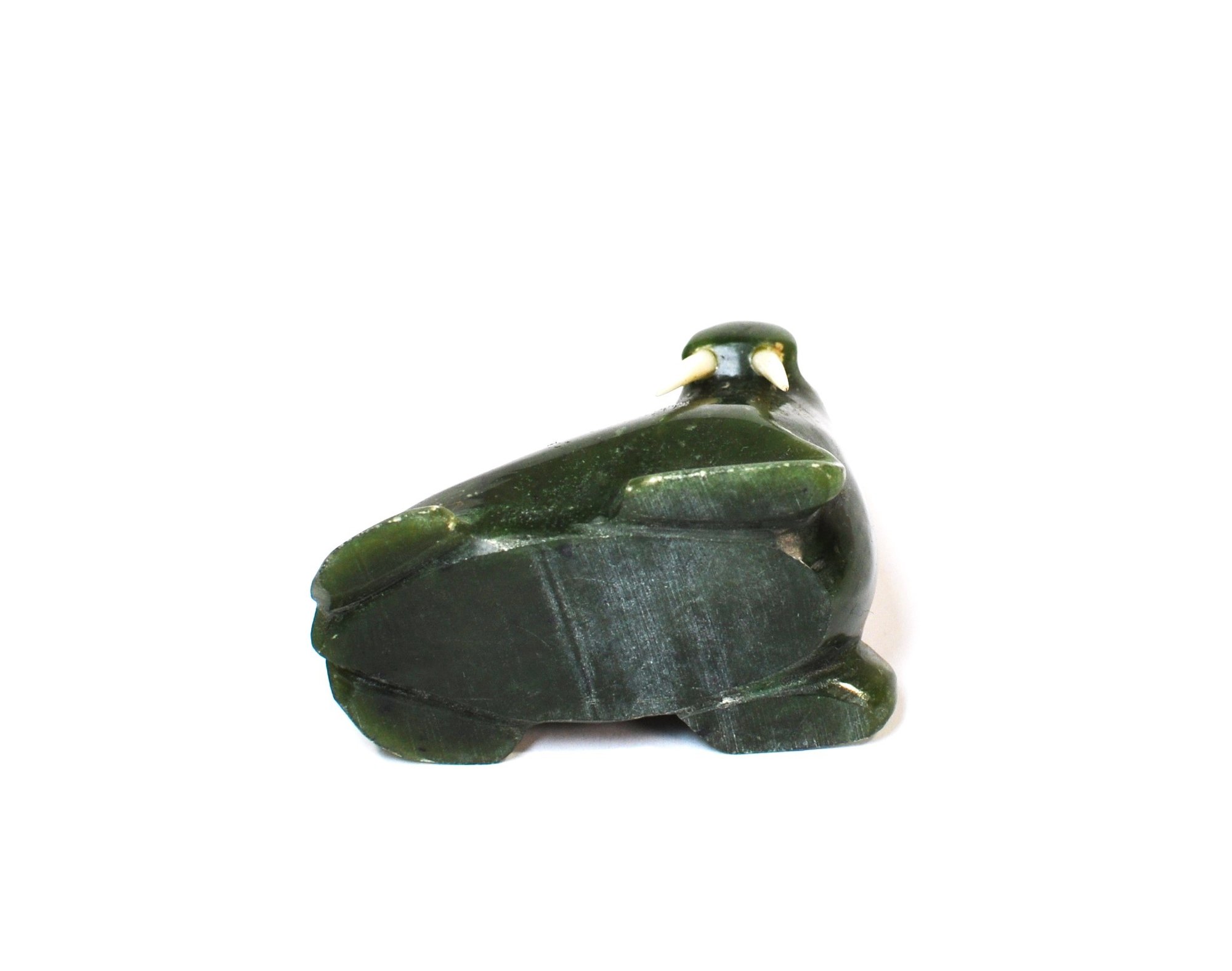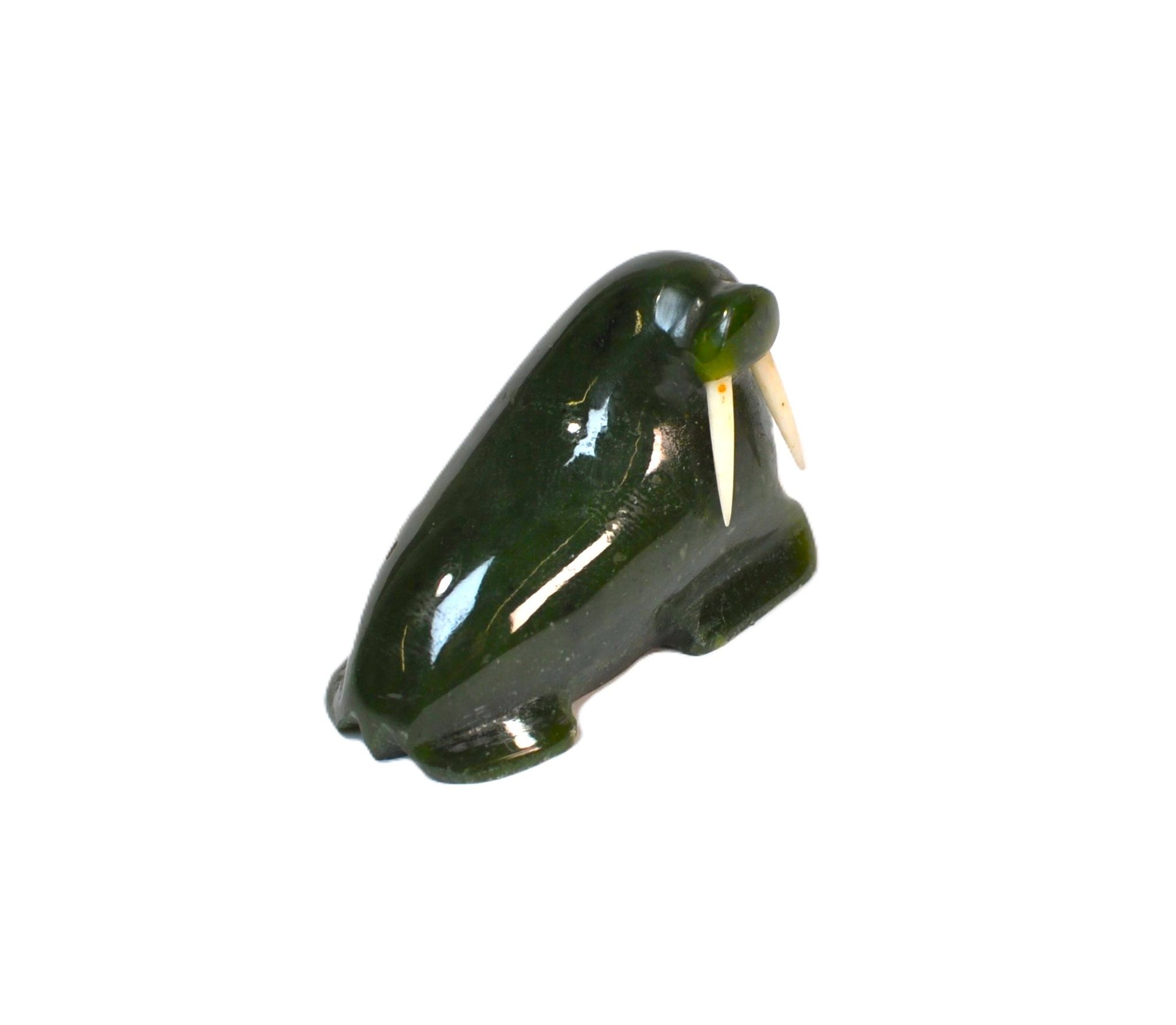 Carved green stone walrus figurine in the Inuit / Arctic folk art tradition, featuring a compact stylized form and applied ivory-tone tusks. The smooth polishing, simplified anatomy, and subject matter are characteristic of mid-century Inuit carvings.