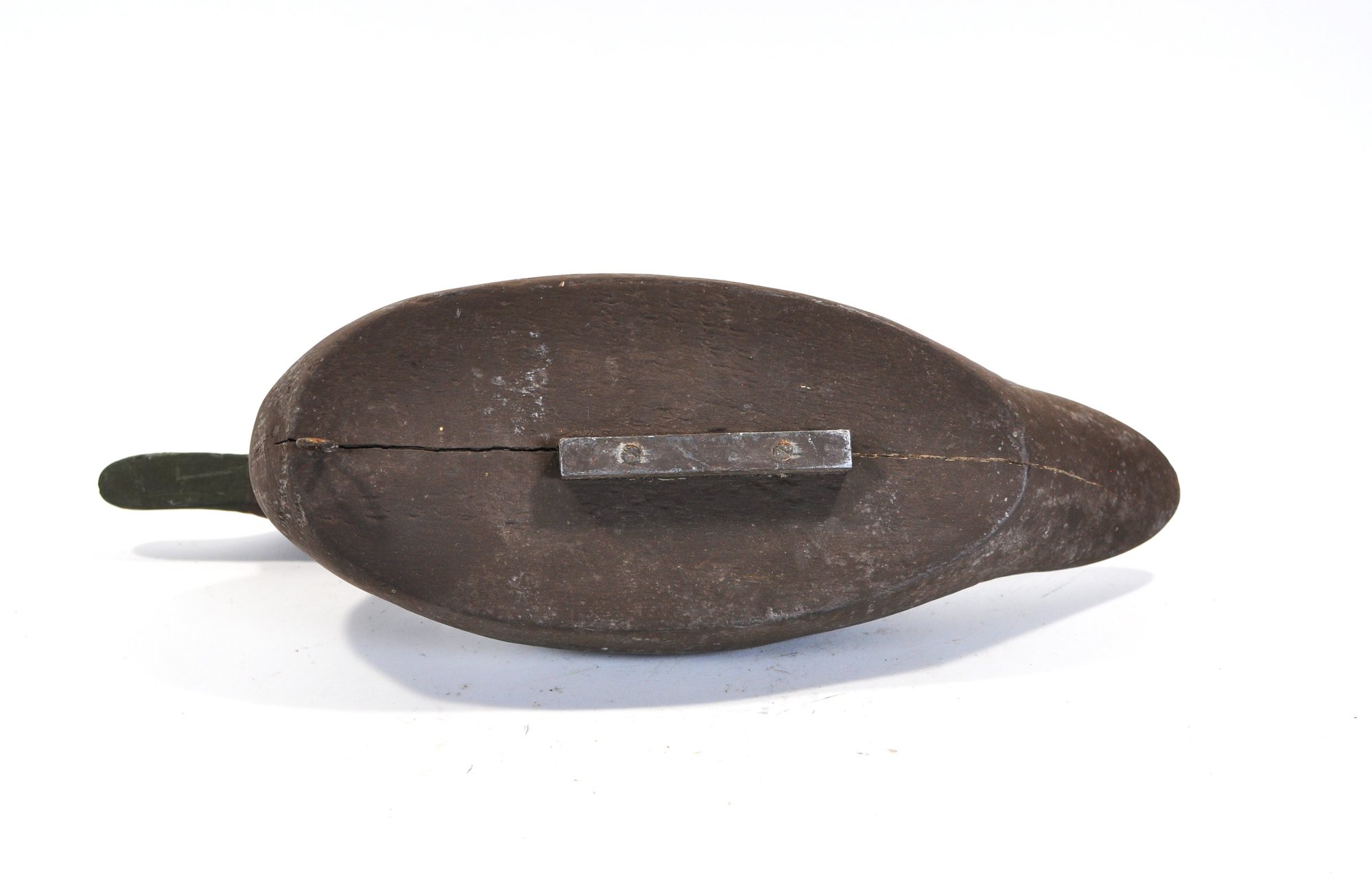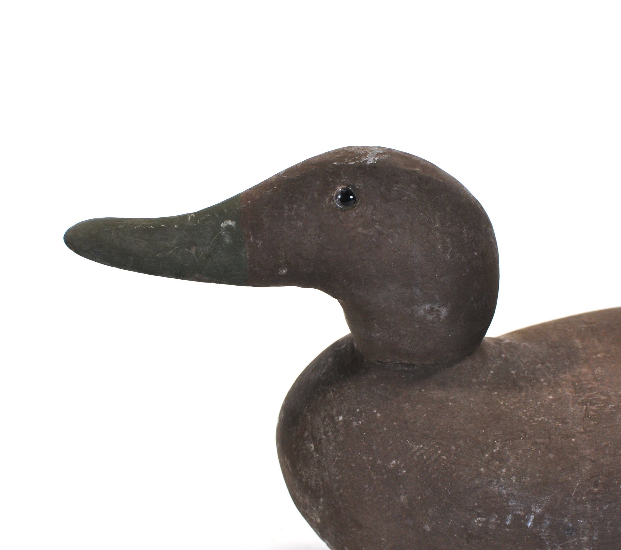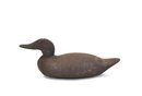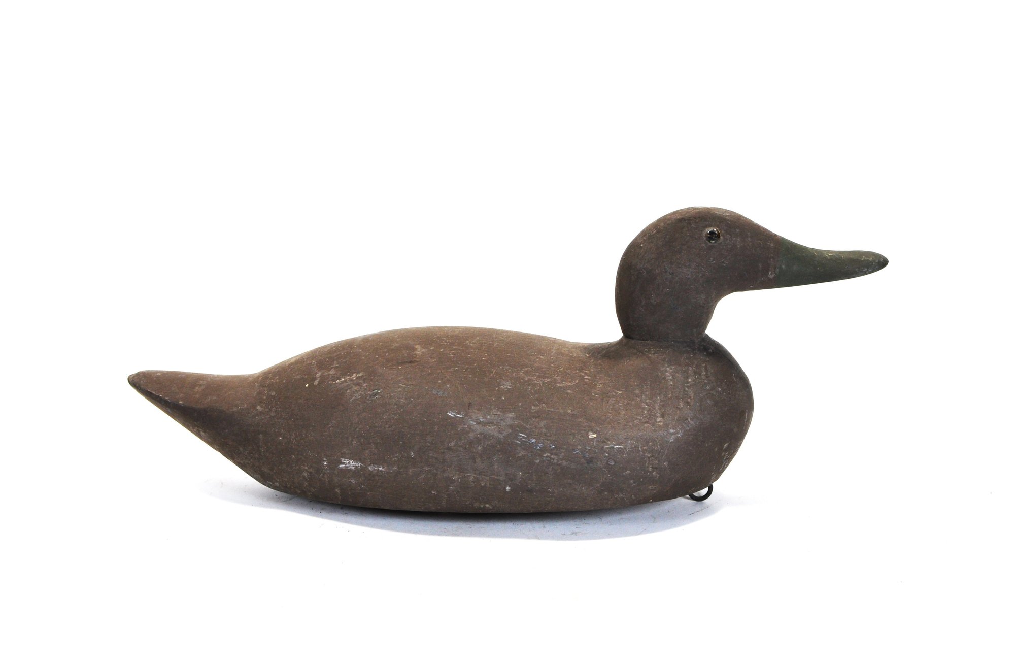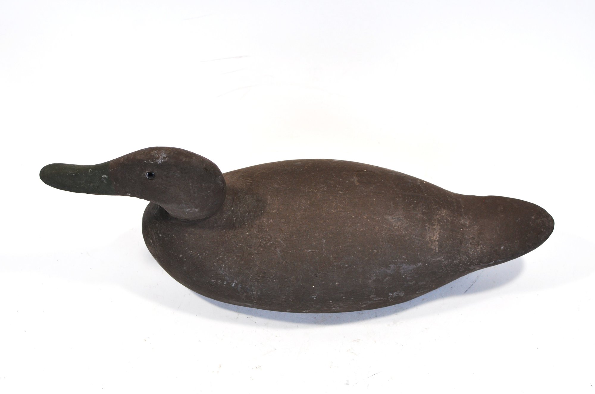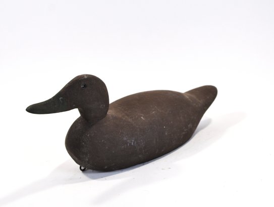 Vintage hand-carved wooden duck decoy in a classic, minimally detailed form. Finished in a dark, time-worn surface with subtle shaping to the body and head. Fitted with glass eyes and a lead weight on the underside for balance. Displays an honest, well-used patina consistent with working decoys.