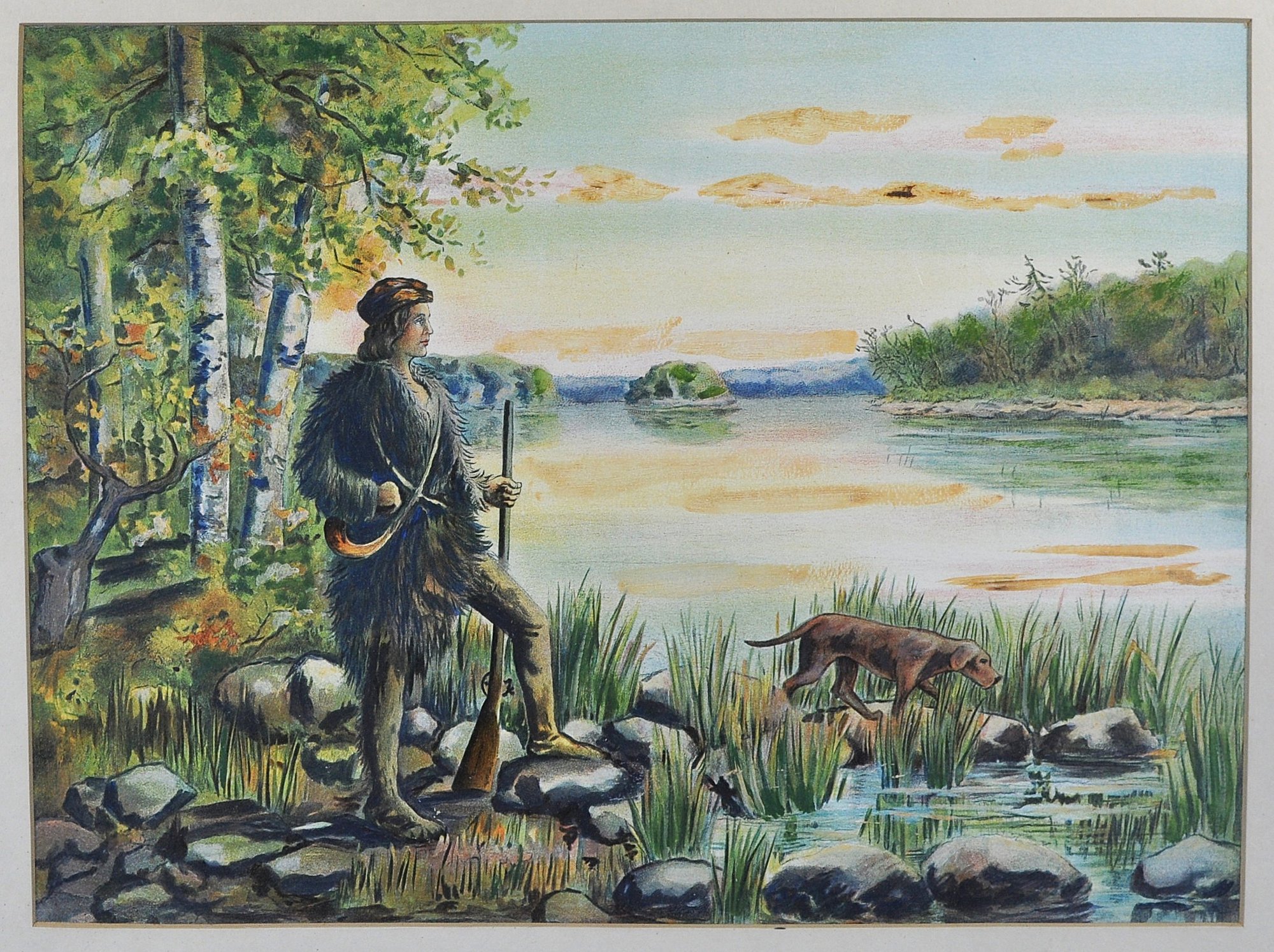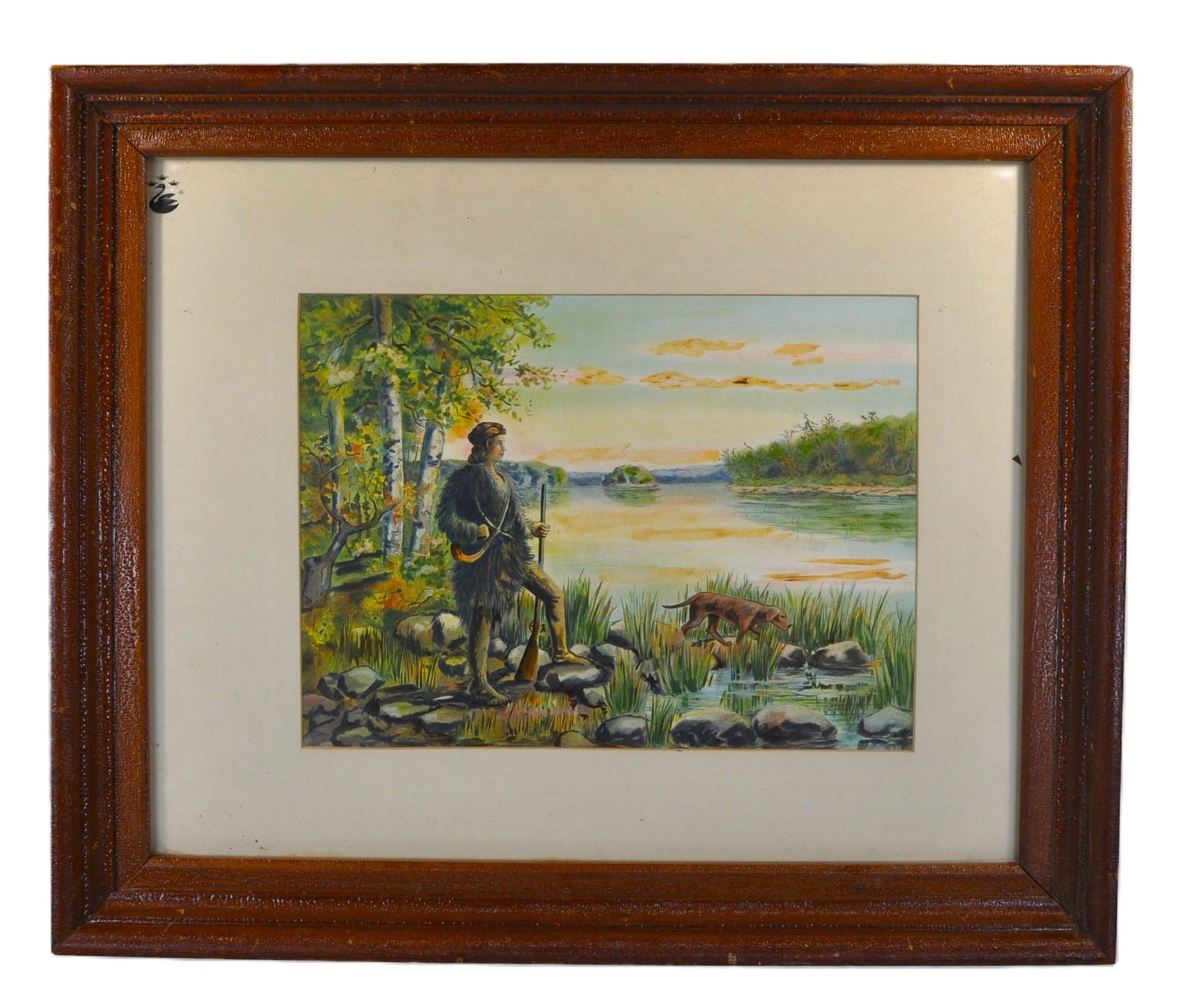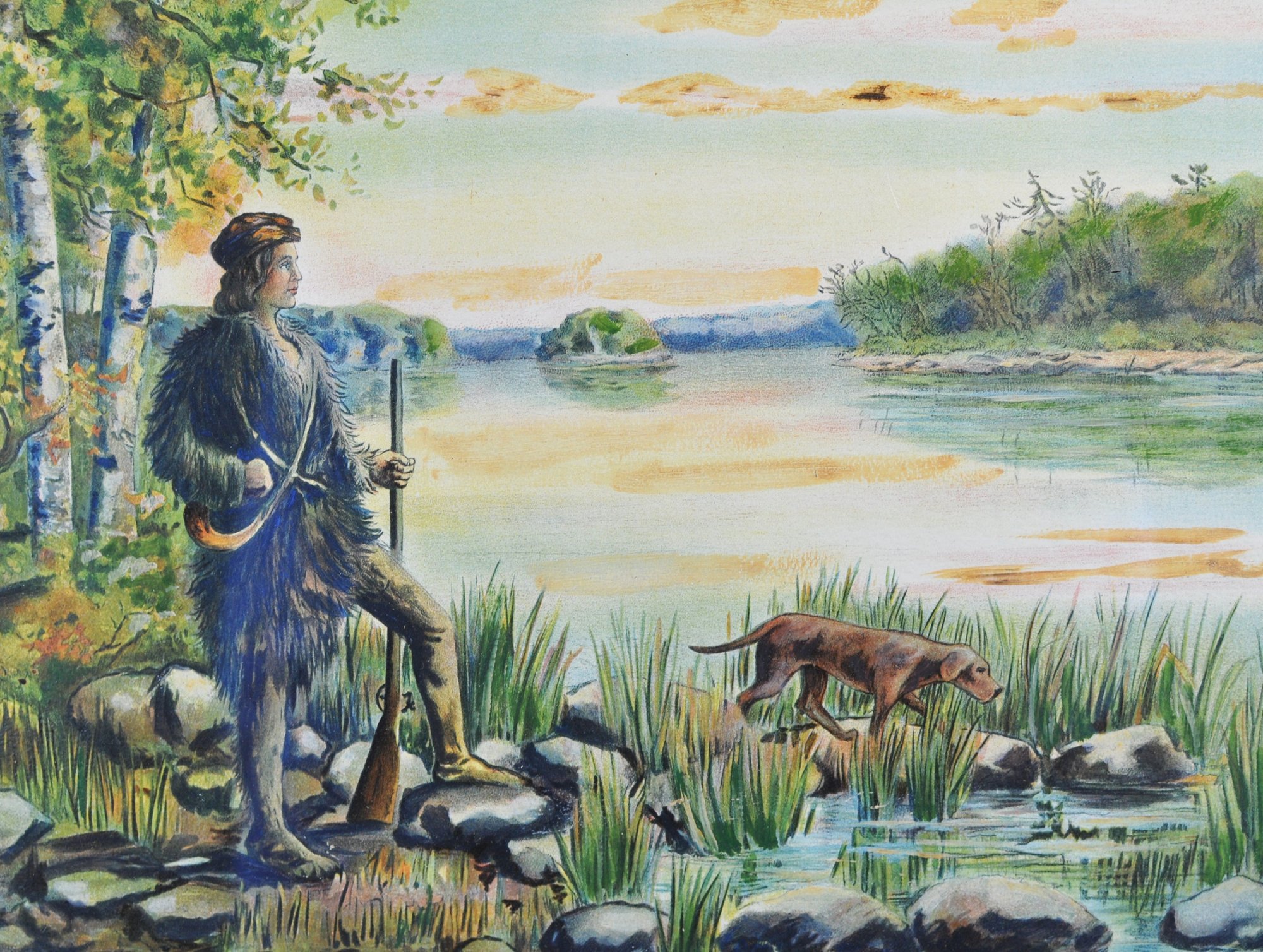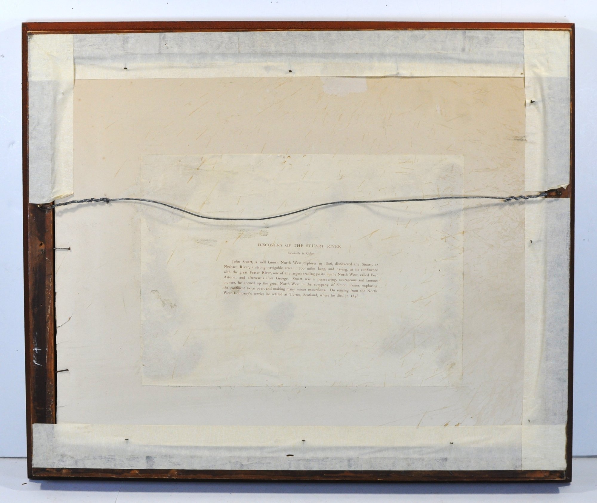 Vintage color facsimile print titled “Discovery of the Stuart River,” depicting an early North West explorer standing along a riverbank with dog and rifle.