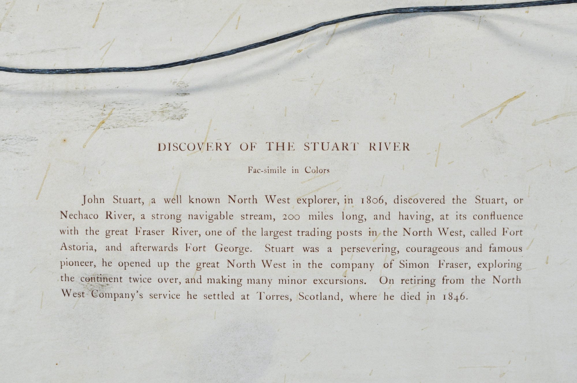 The reverse retains printed historical text describing John Stuart’s 1806 discovery of the Stuart (Nechaco) River, a tributary of the Fraser River in western Canada.