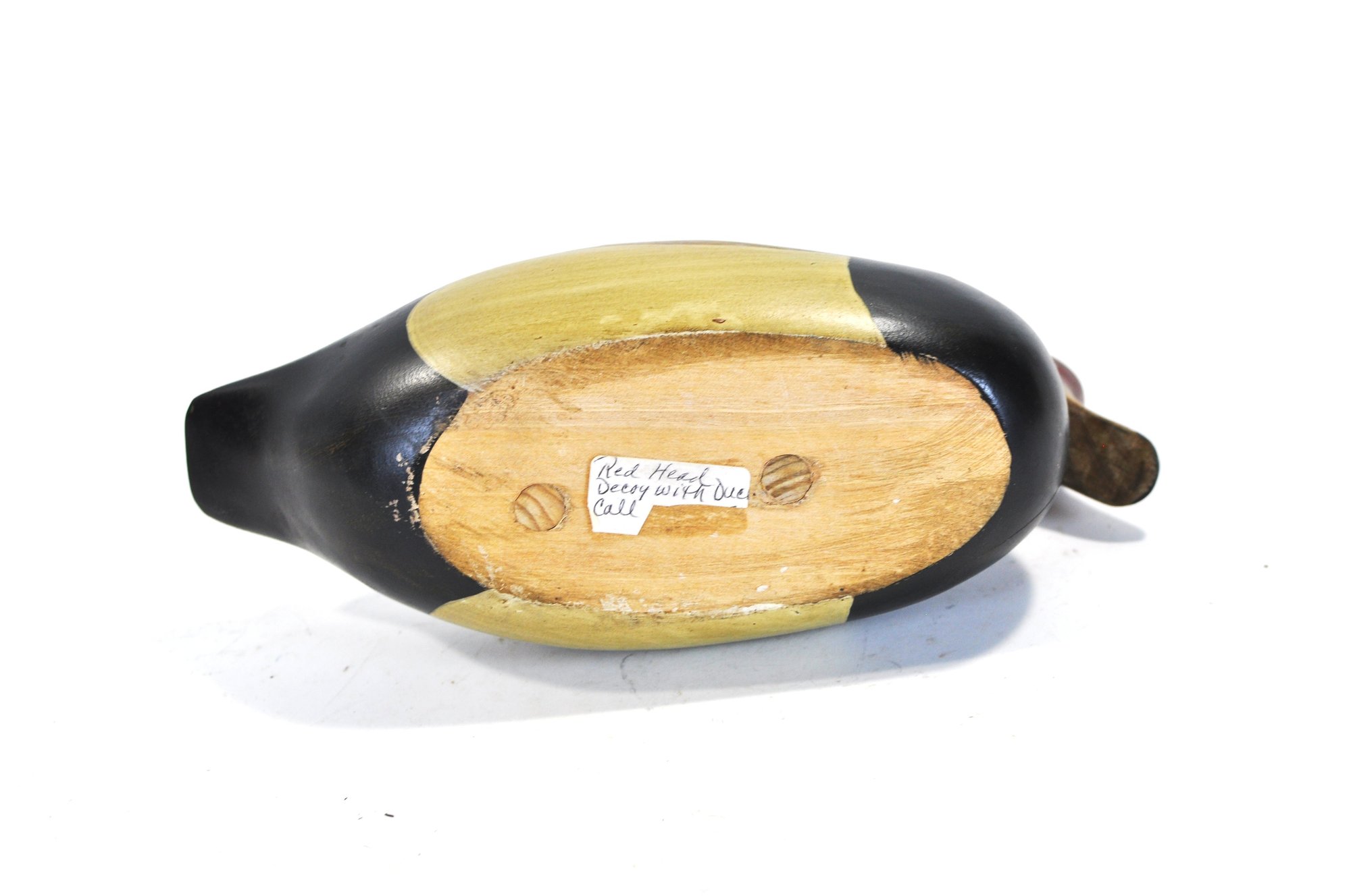Underside retains a small label noting “Red Head Decoy with Duck Call,” suggesting use with a call or as part of a display grouping. A nicely executed decorative decoy with strong shelf presence.