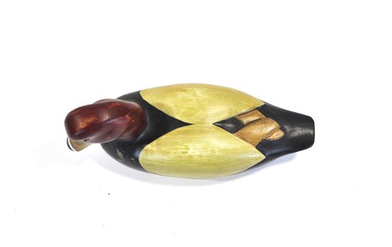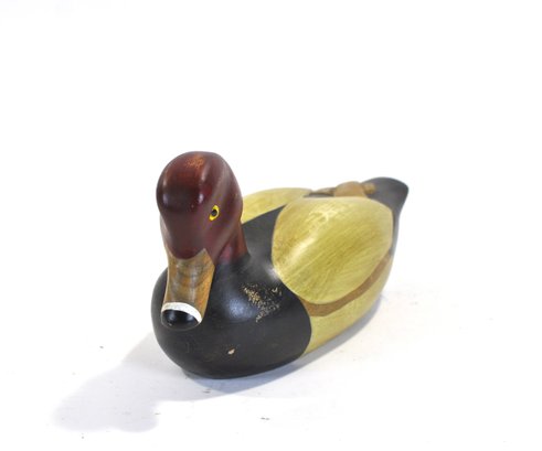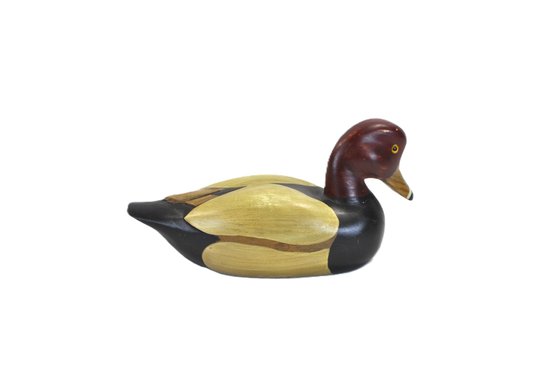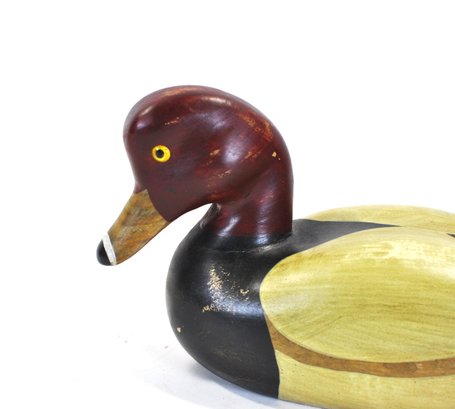 Smaller hand-carved redhead drake duck decoy featuring a rich chestnut head, black breast, and warm buff-toned sides. The form is clean and slightly stylized, with smooth carving and subtle wing delineation. Glass eyes and a naturalistic bill add to its lifelike character.