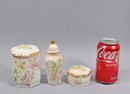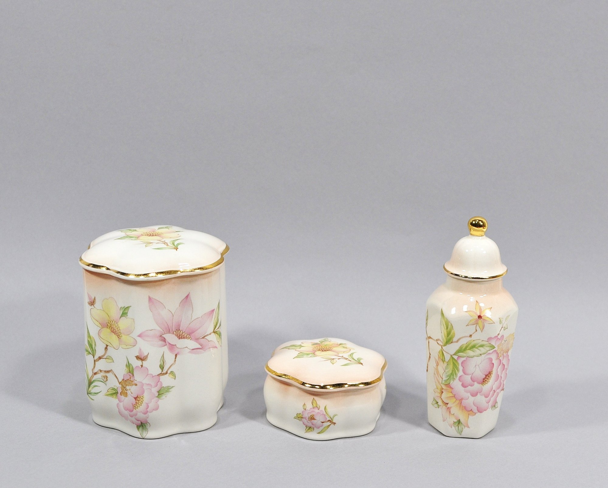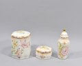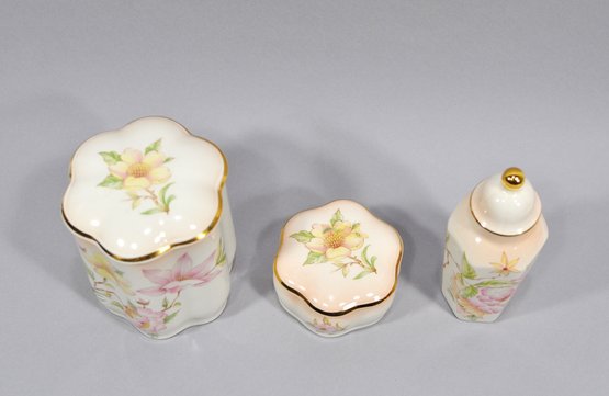 Elegant three-piece porcelain vanity or dresser set by Royal Worcester, England, in the Palissy line (est. 1853). The set includes a covered jar, a small lidded trinket box, and a tall bottle with stopper. Each piece is decorated with soft hand-painted style floral motifs in pastel tones, complemented by gilt accents along the rims and finial.