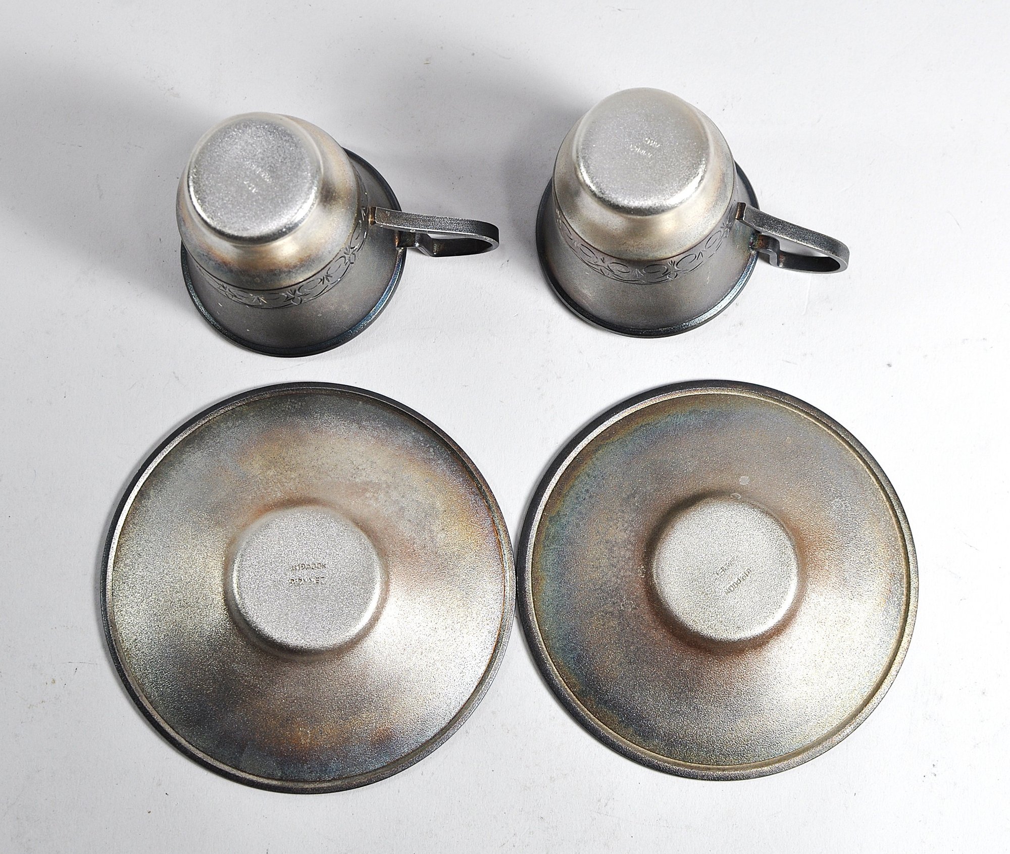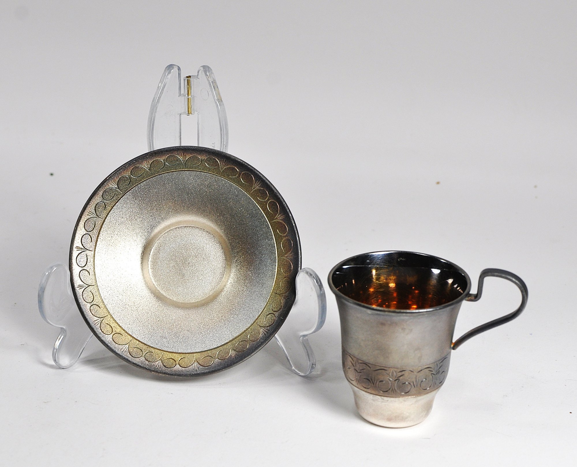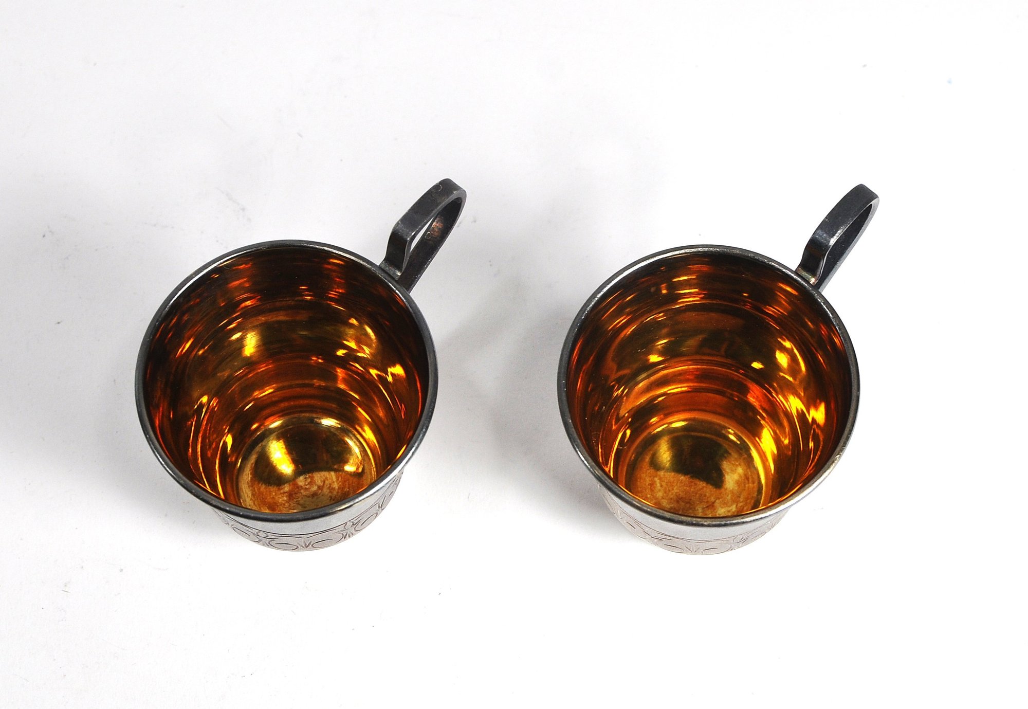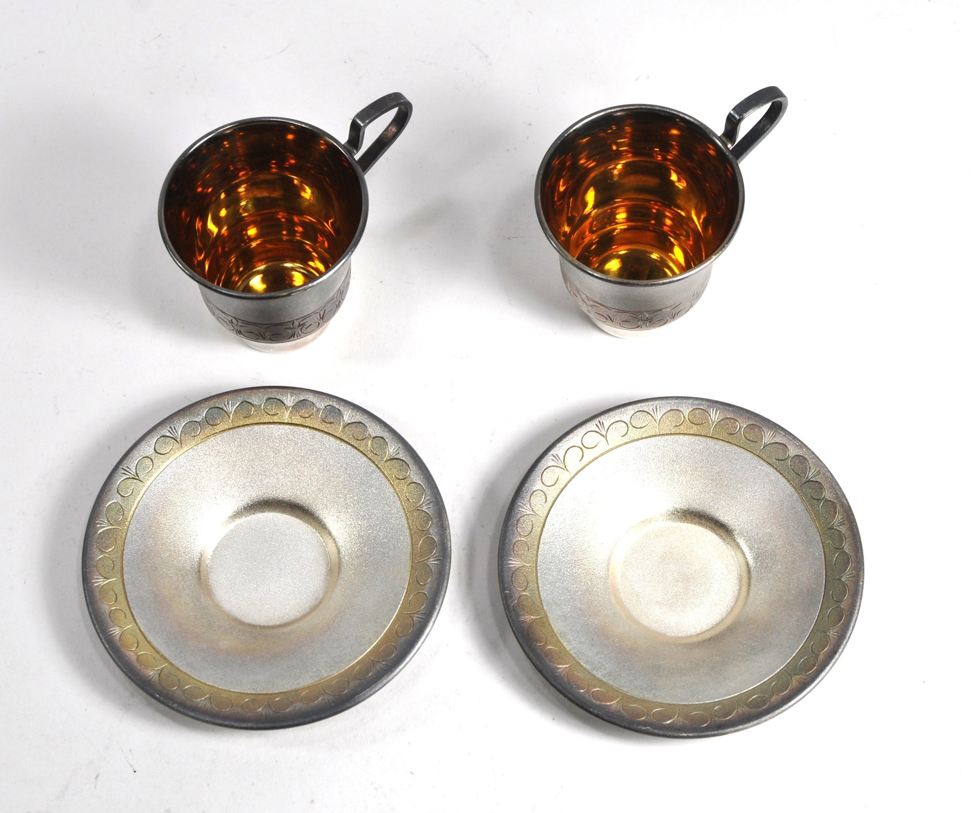 Set 2 vintage Russian/USSR melchior silver-plated coffee cups and saucers with a gold-washed interior.