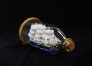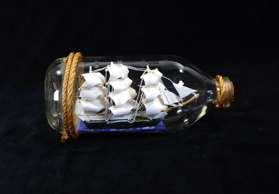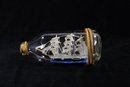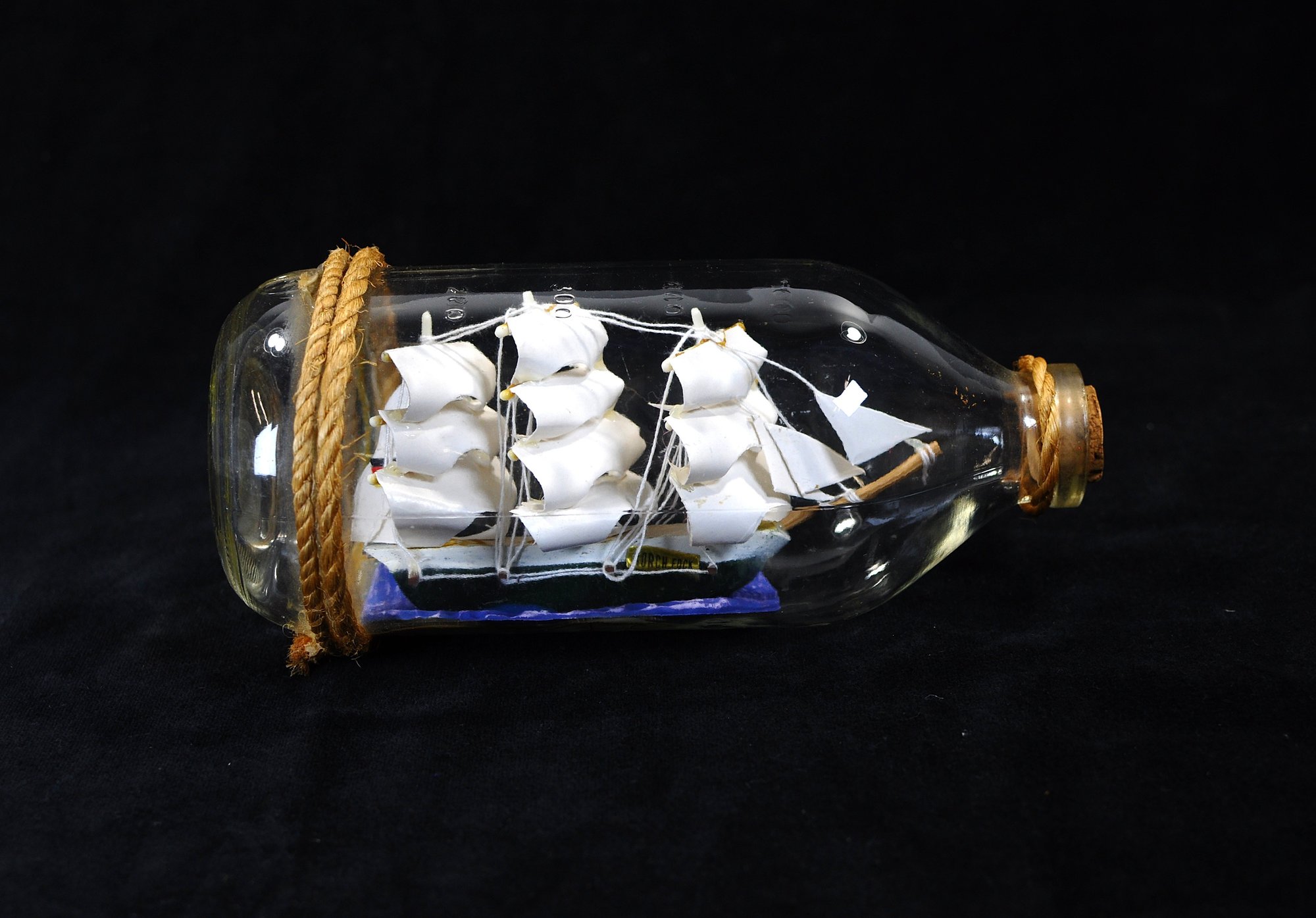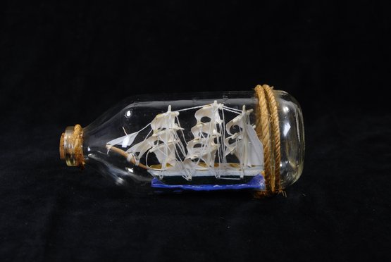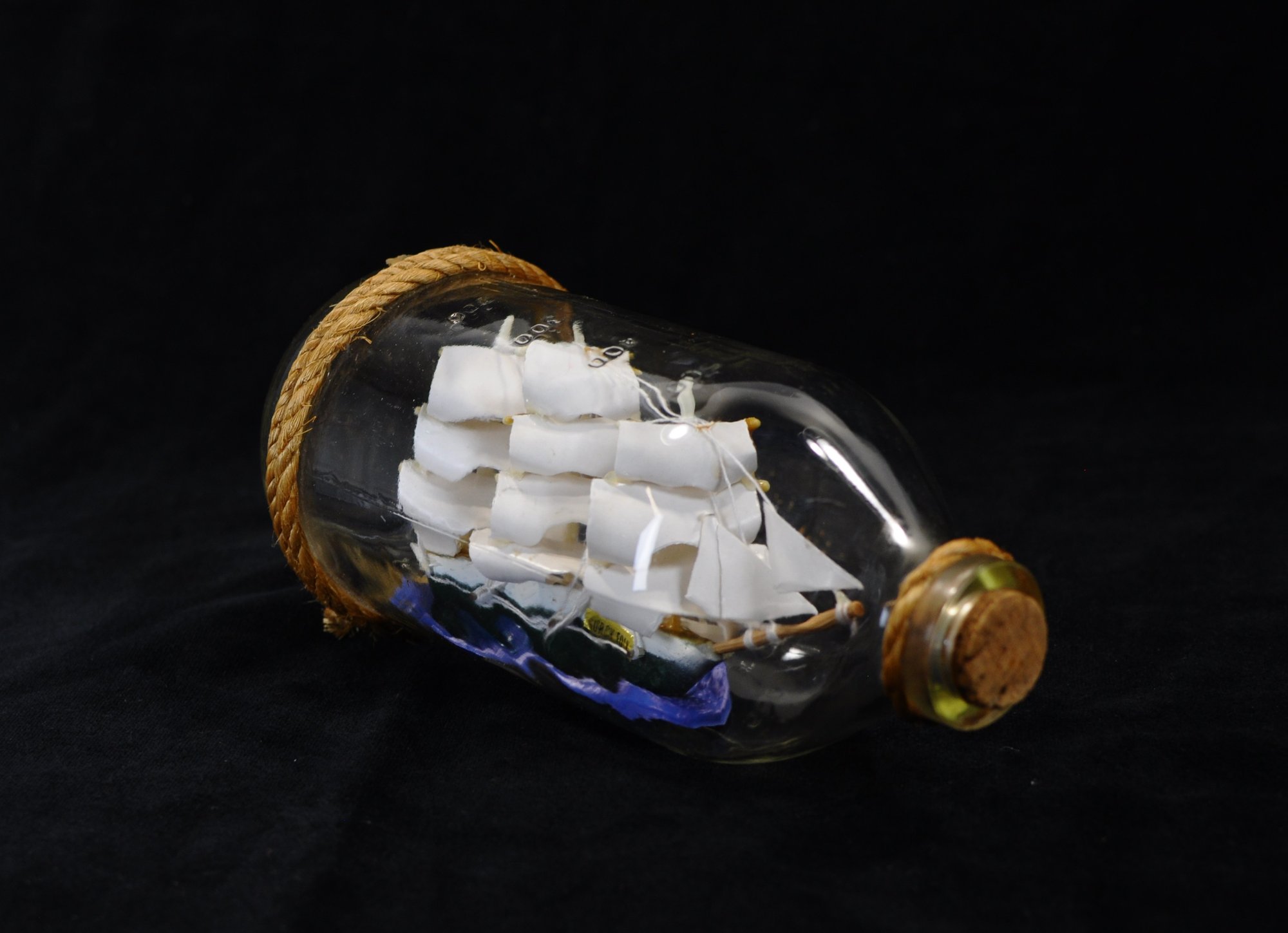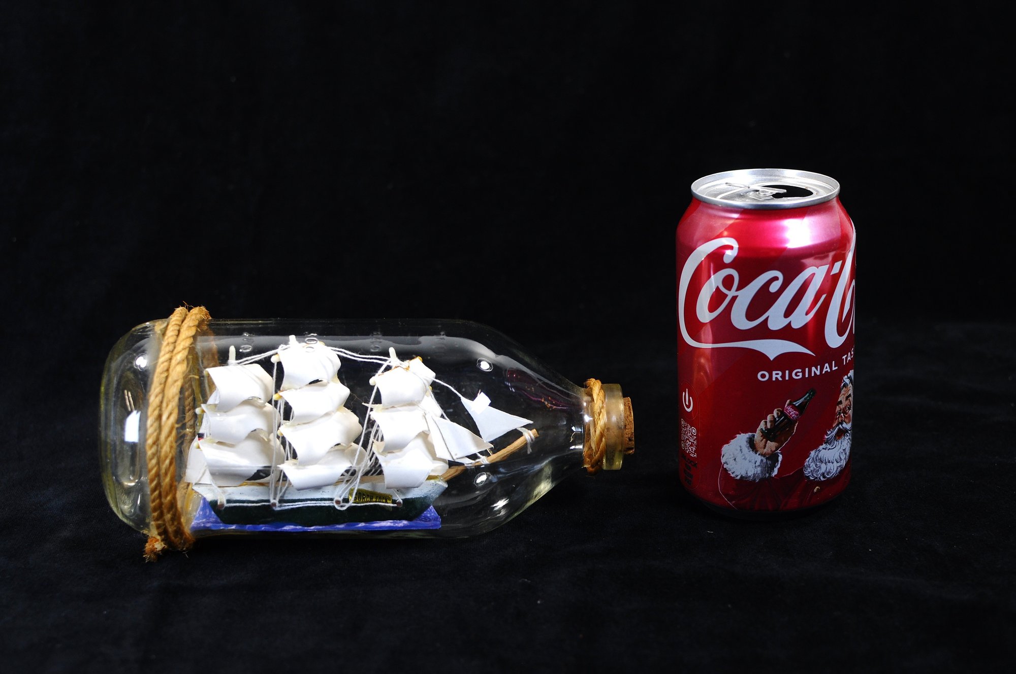 A classic piece of nautical decor, appreciated for its remarkable craftsmanship and the mystery of how the ship was assembled inside the narrow-necked bottle.