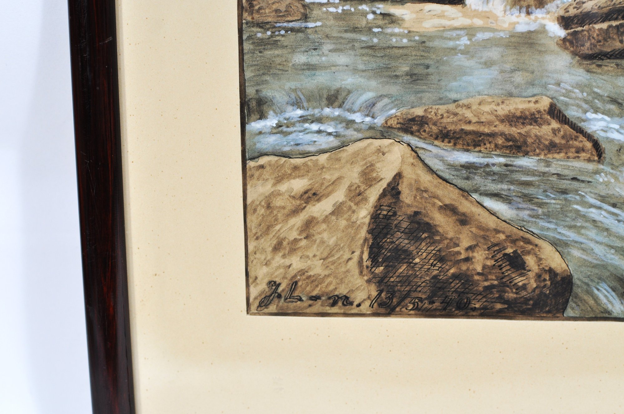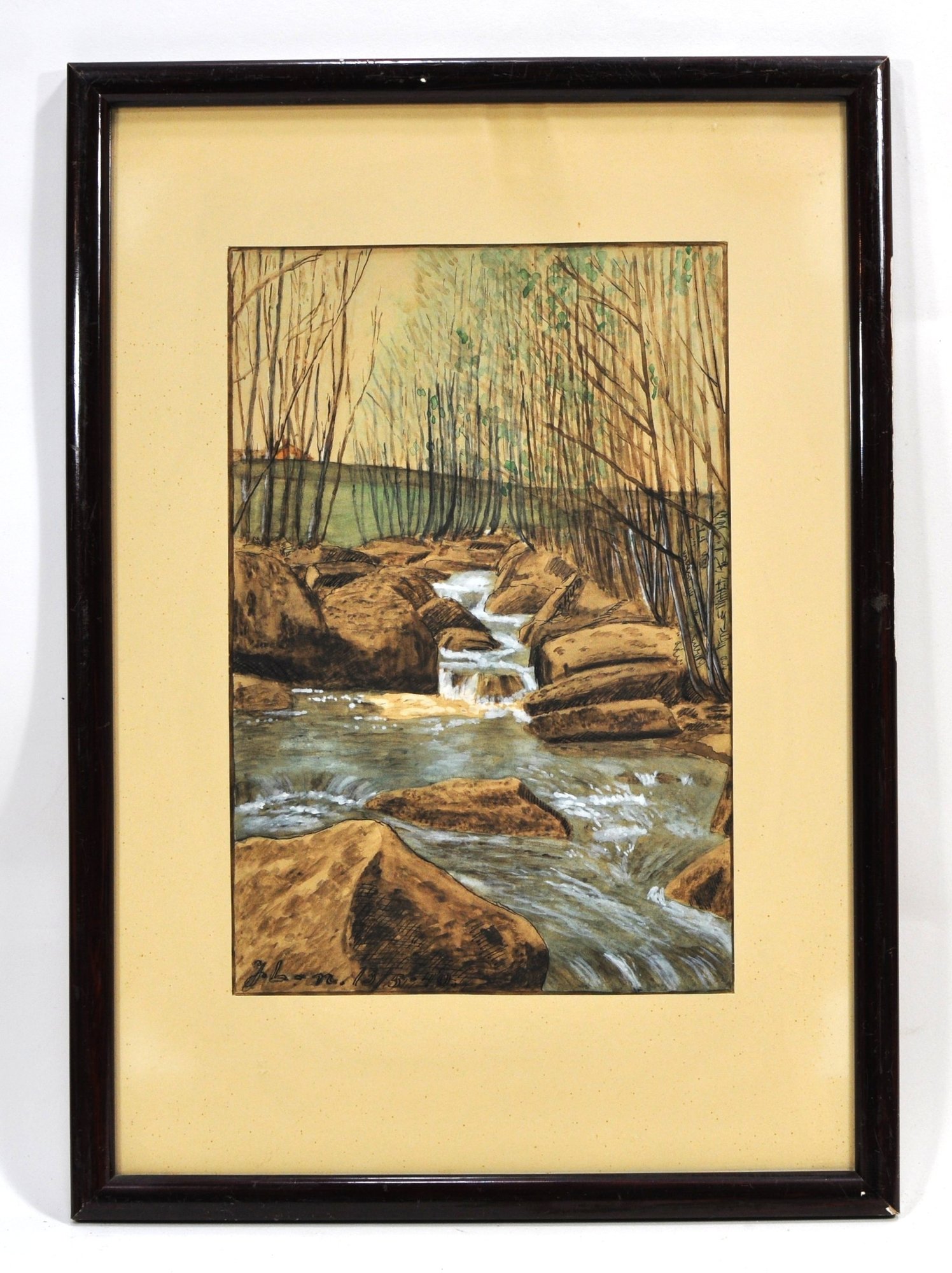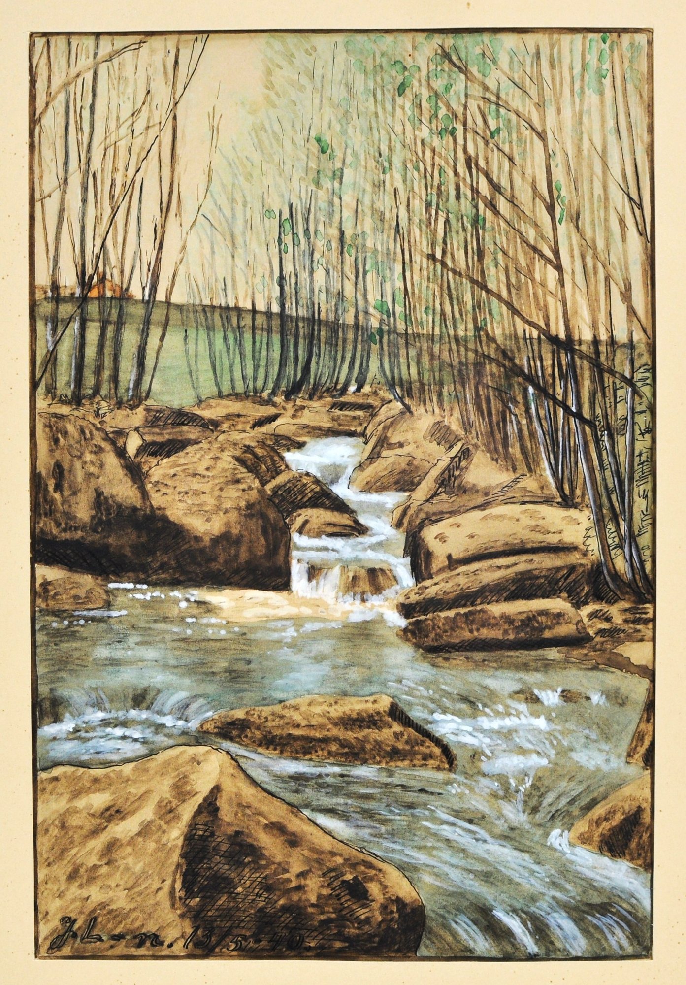 Vintage watercolor (with ink outlining) depicting a tranquil woodland stream flowing over rocks, framed by slender trees and soft green foliage. The composition captures a quiet natural setting with delicate linework and muted earth tones, enhanced by light washes of color.