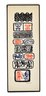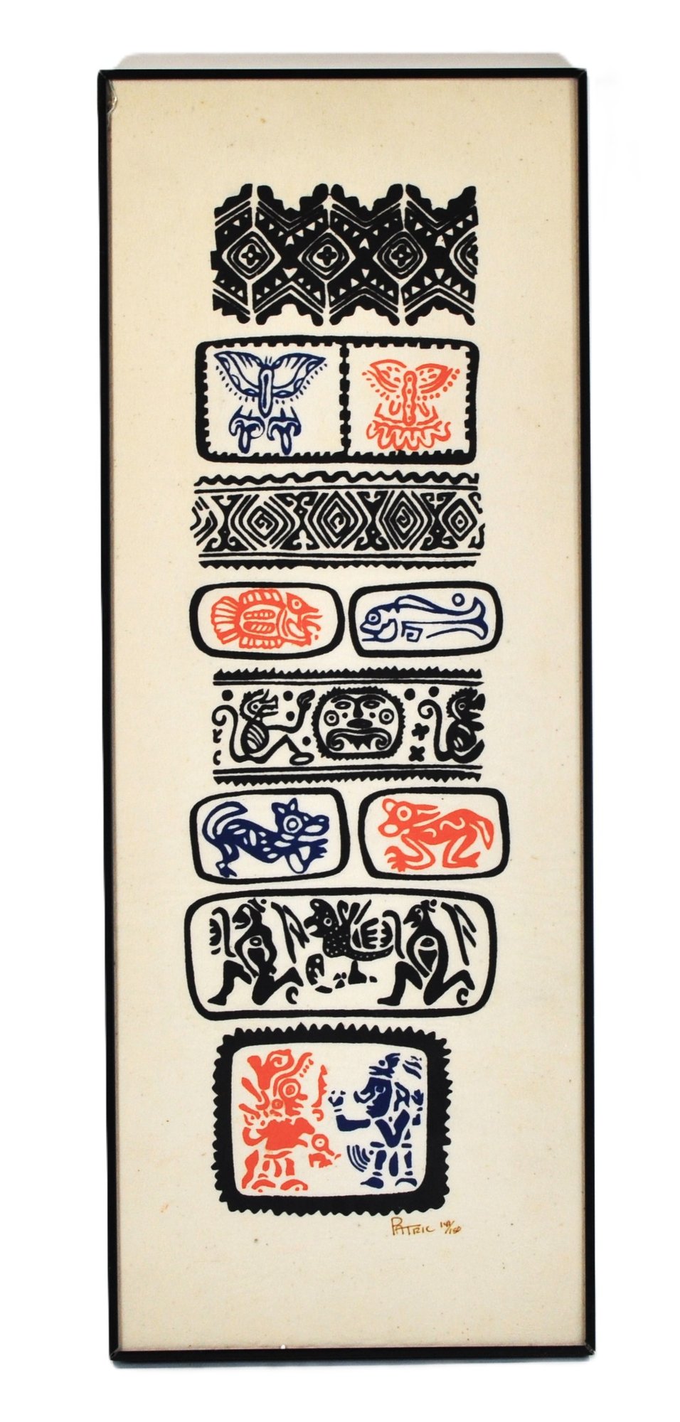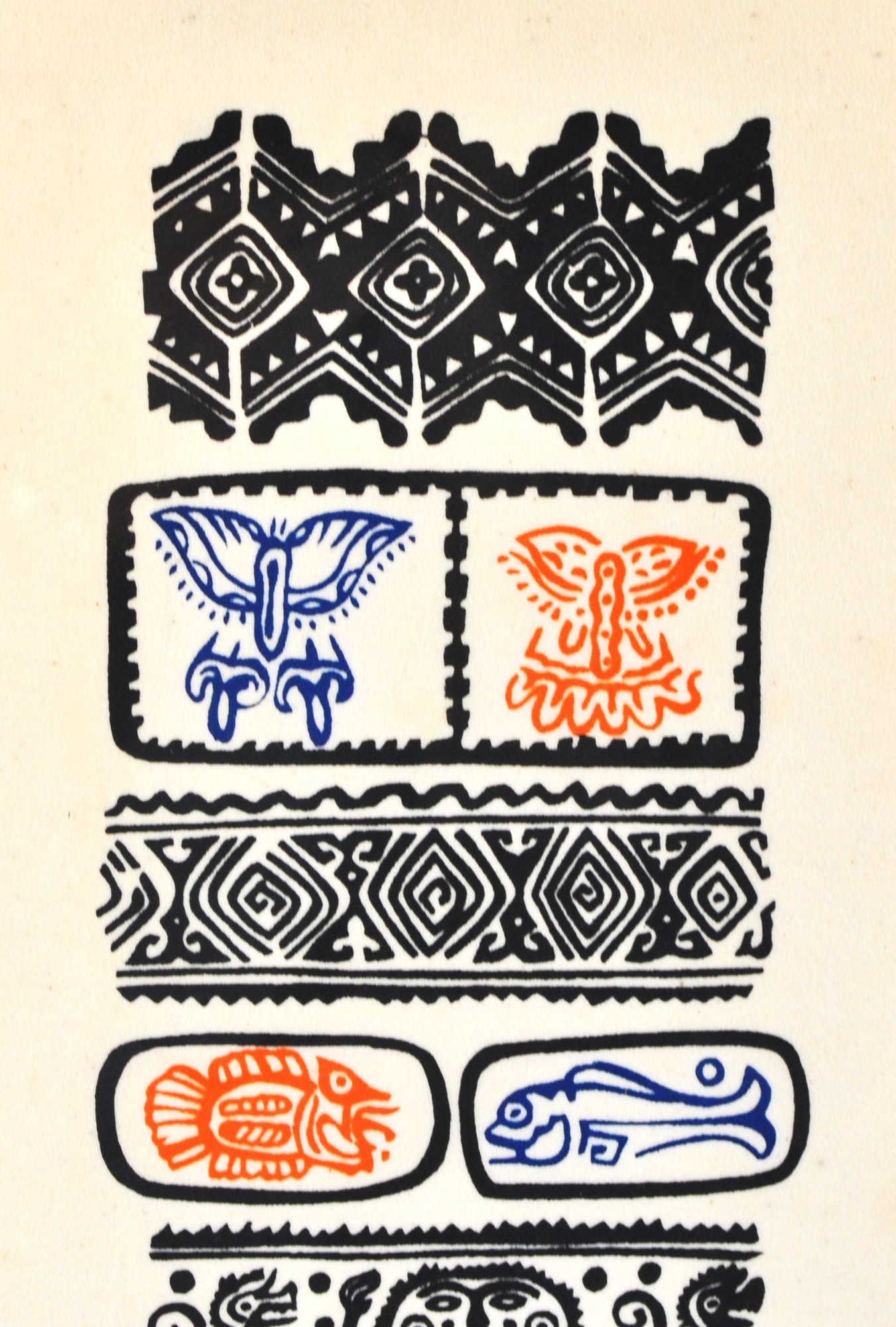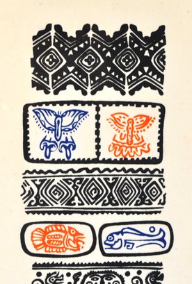 Vertical ink rubbing depicting stylized Mayan glyph motifs in black with red and blue accents.