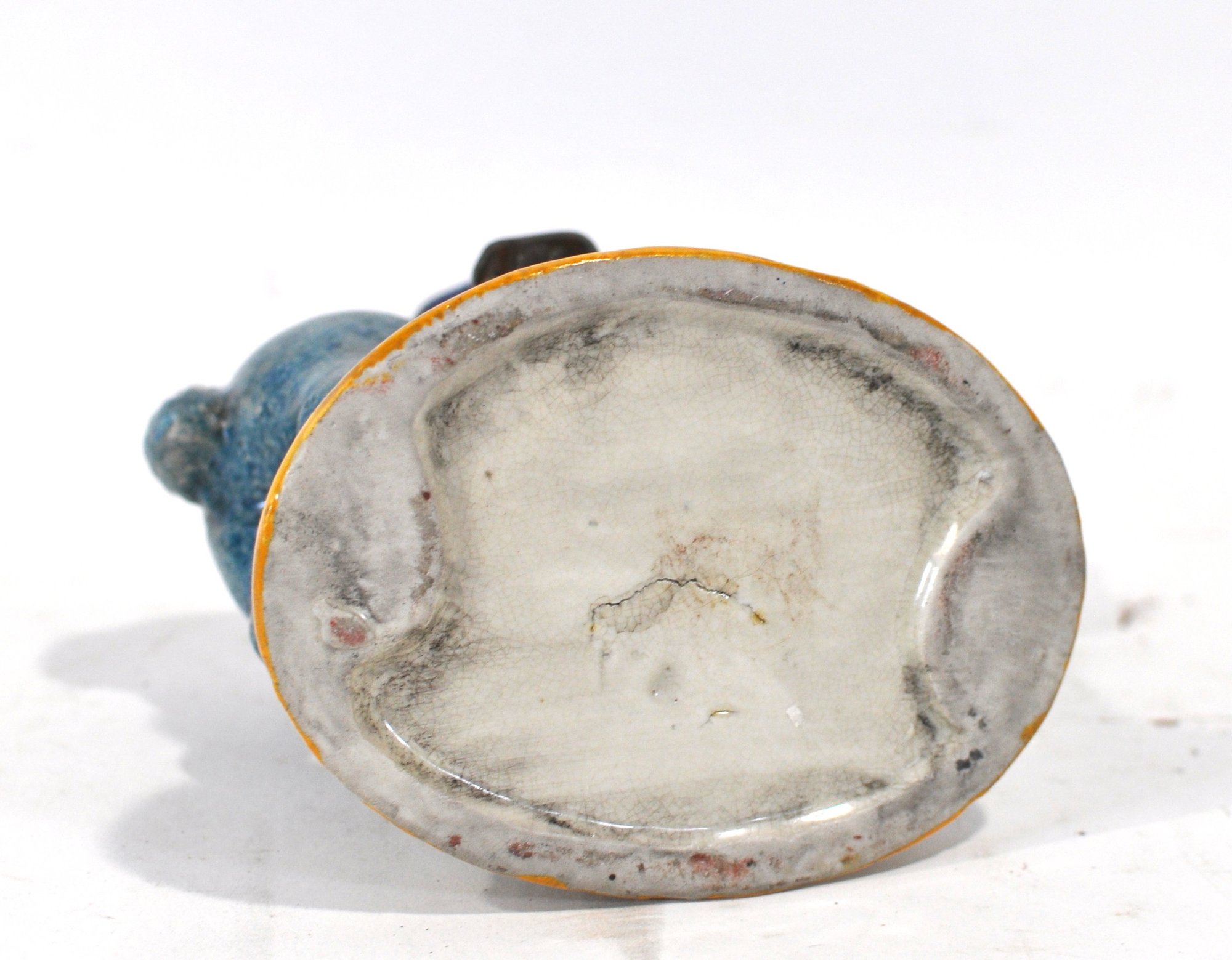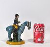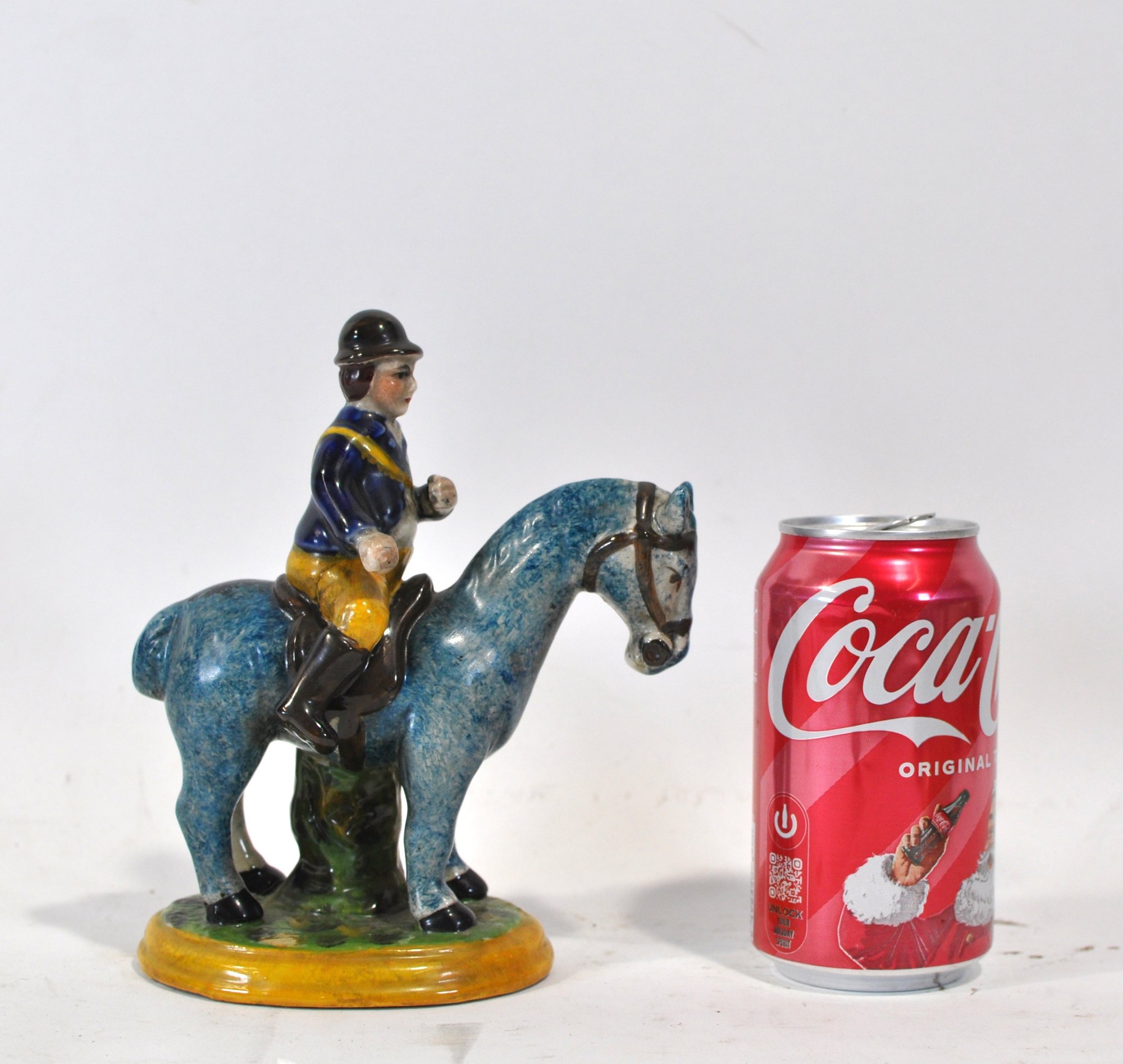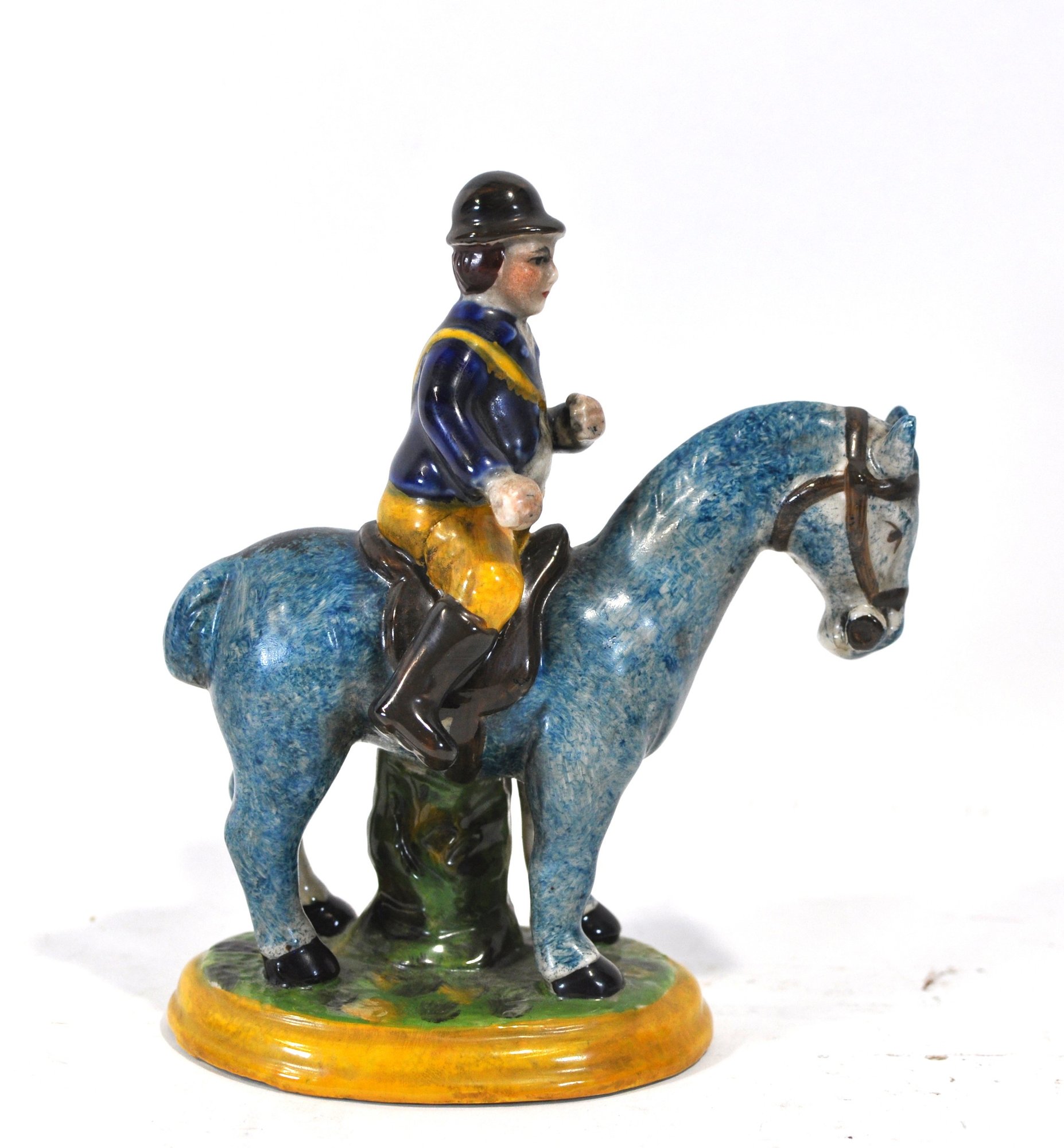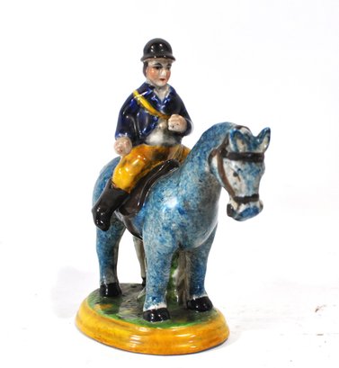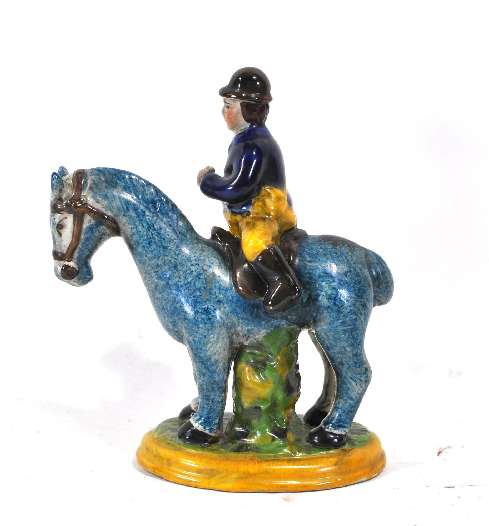 Staffordshire ceramic figurine depicting a rider mounted on a horse. The figure is decorated in bright hand-painted glazes, including a mottled blue horse, cobalt jacket, and yellow riding trousers, standing on an oval base with green ground and ochre border.