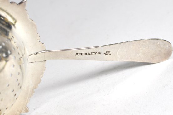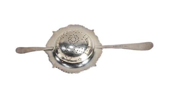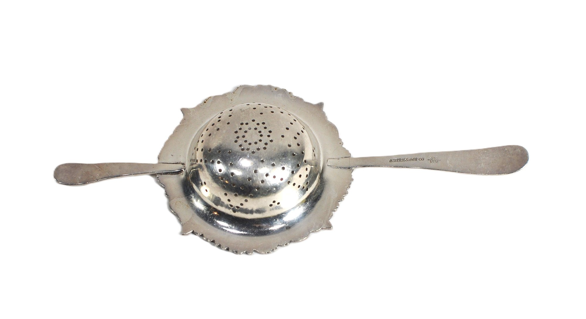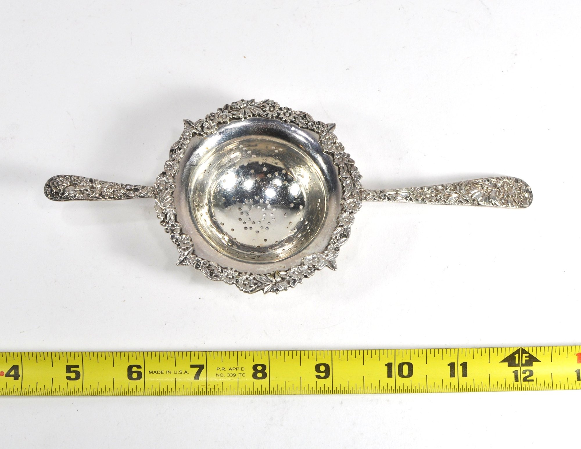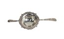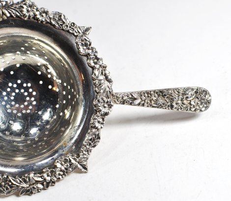 Sterling silver double handle flower repousse design tea strainer with 925/1000 mark.