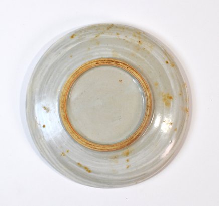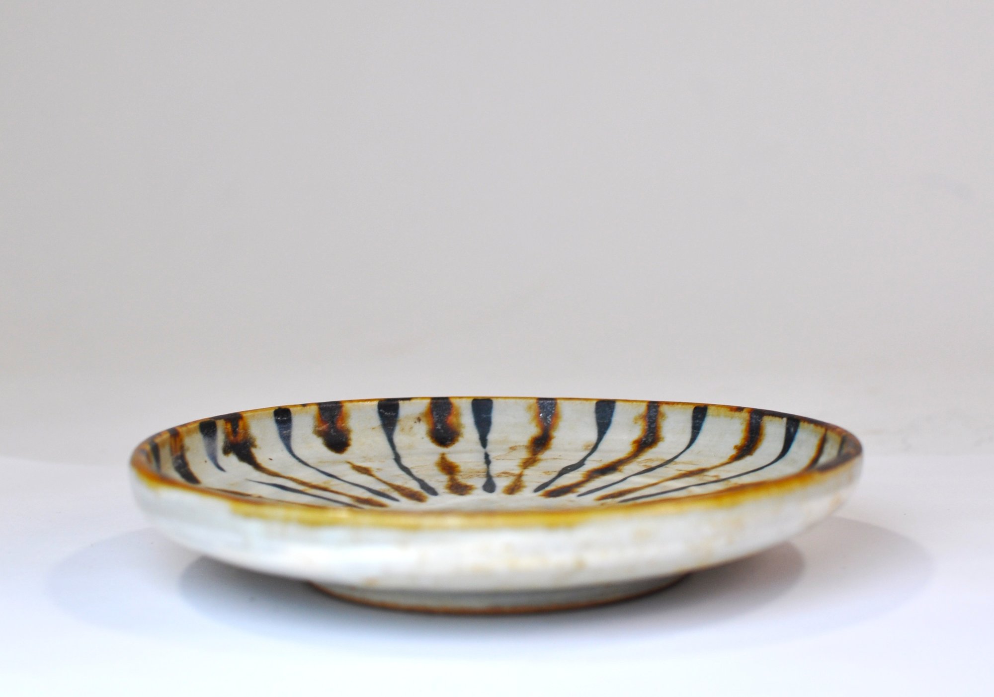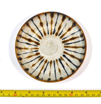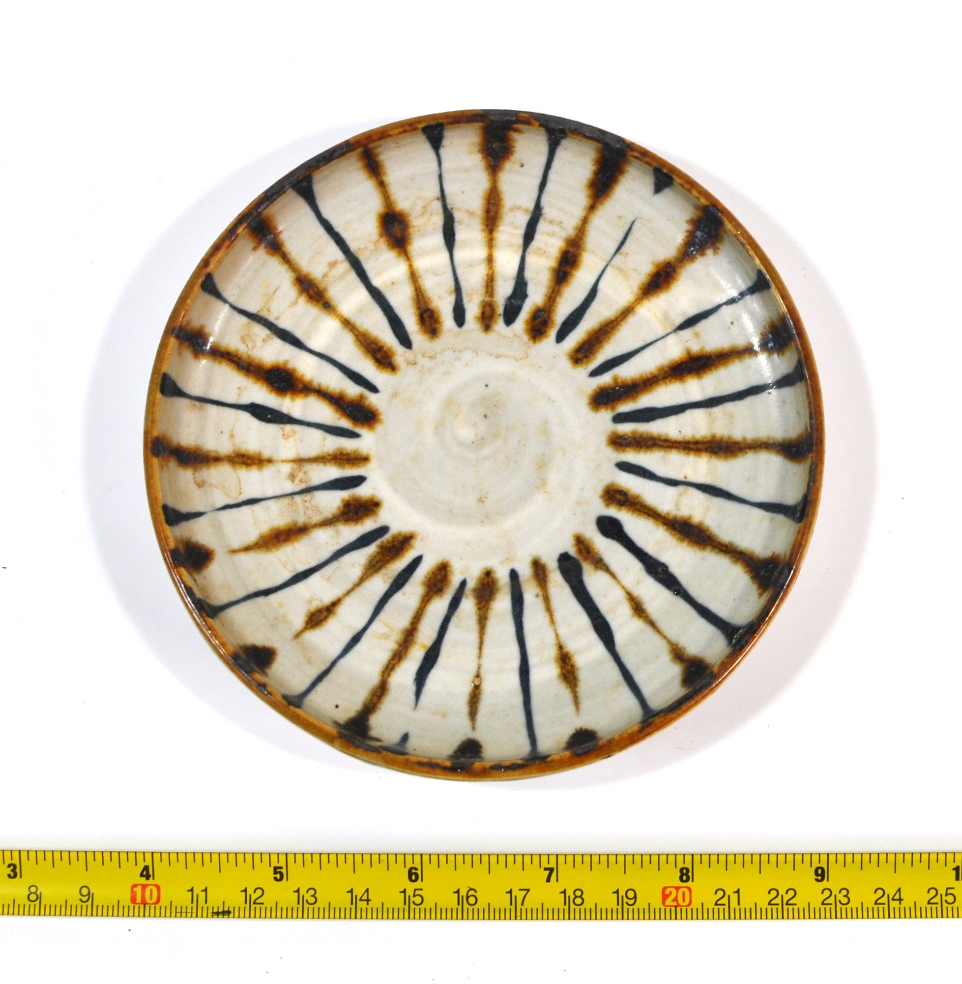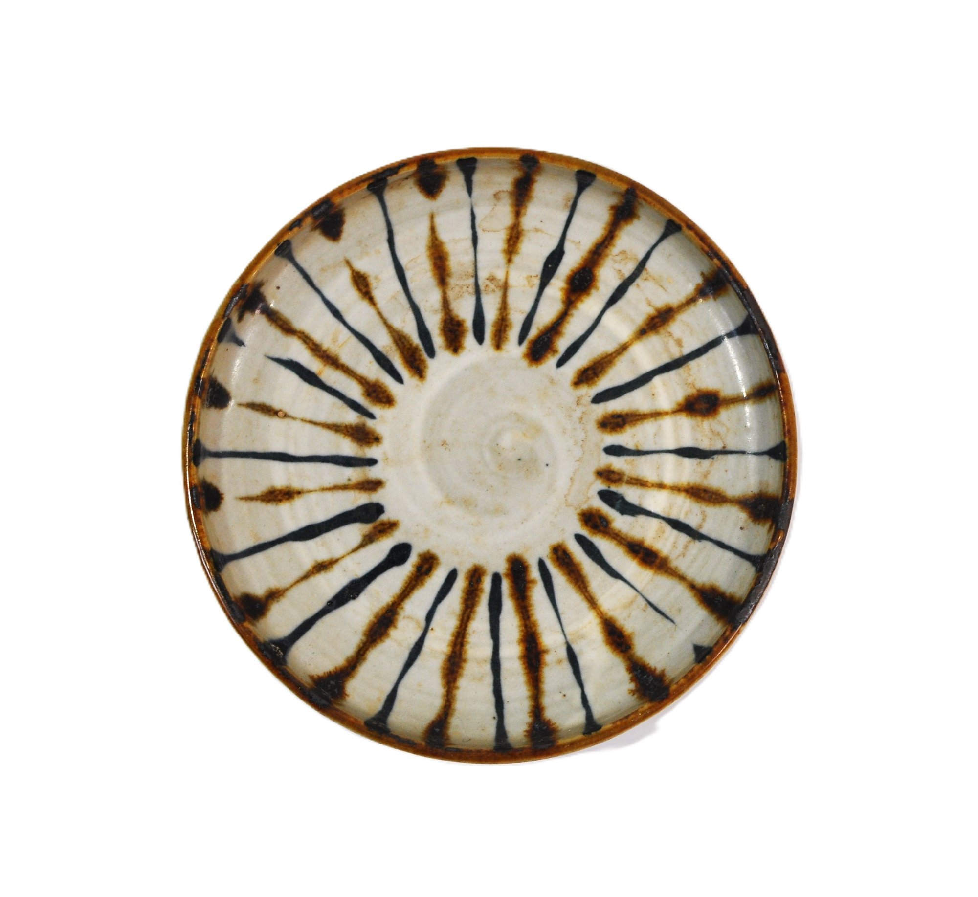 Handcrafted vintage pottery plate featuring a striking radial slip-decorated design in dark brown and iron black on a creamy off-white ground. The interior displays expressive, hand-applied brush and slip strokes radiating from the center, while the exterior shows a softly glazed surface with visible throwing rings and an unglazed foot rim.