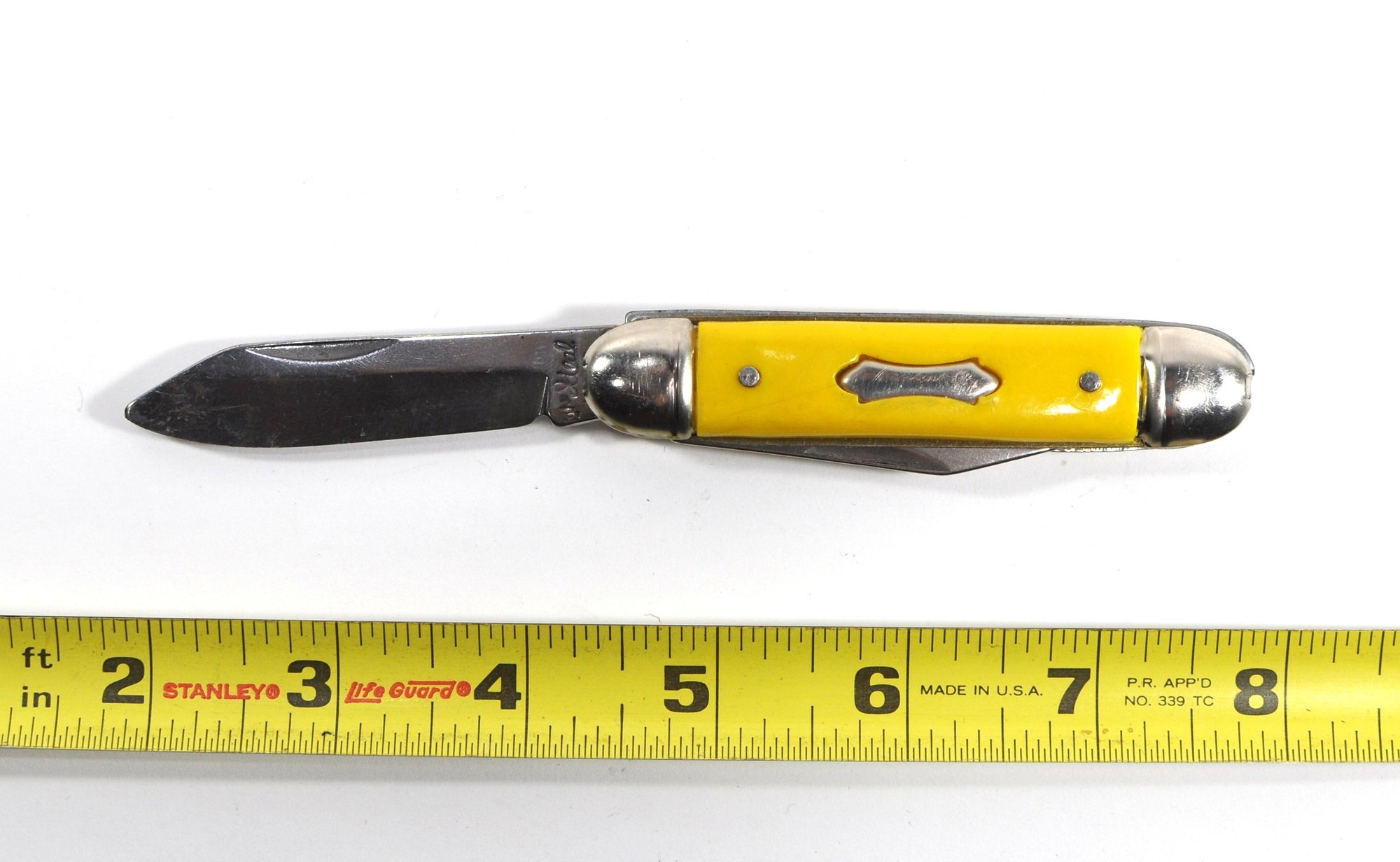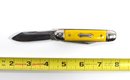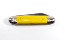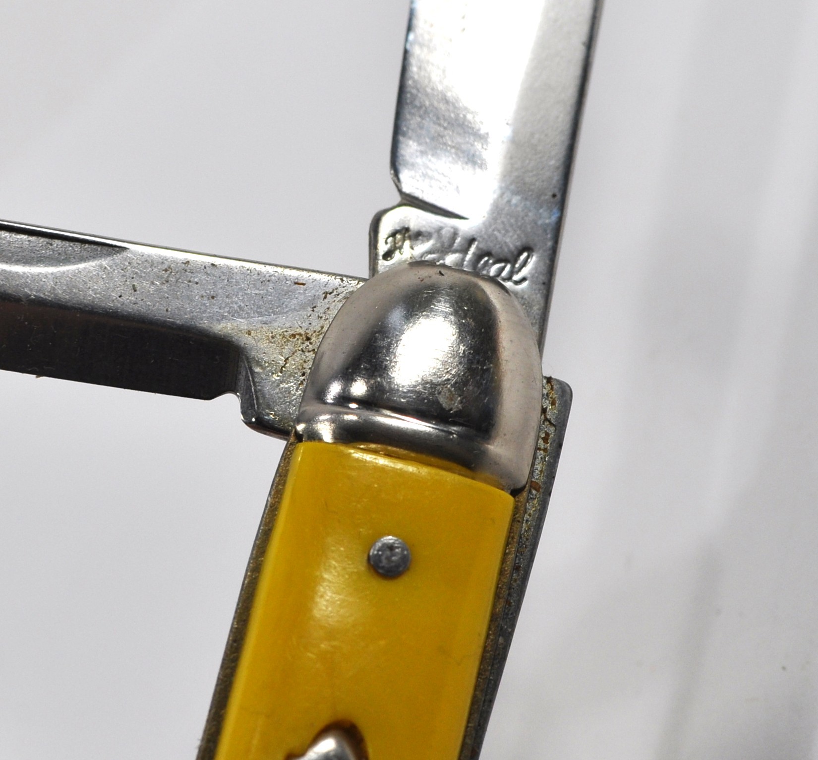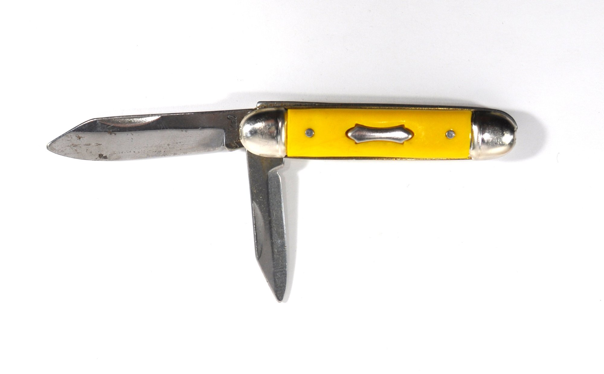 Vintage folding pocket knife featuring bright yellow handle scales with nickel silver bolsters and shield. Two folding blades with nail pulls. Traditional jack knife form, unmarked or faintly marked.