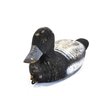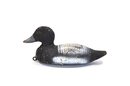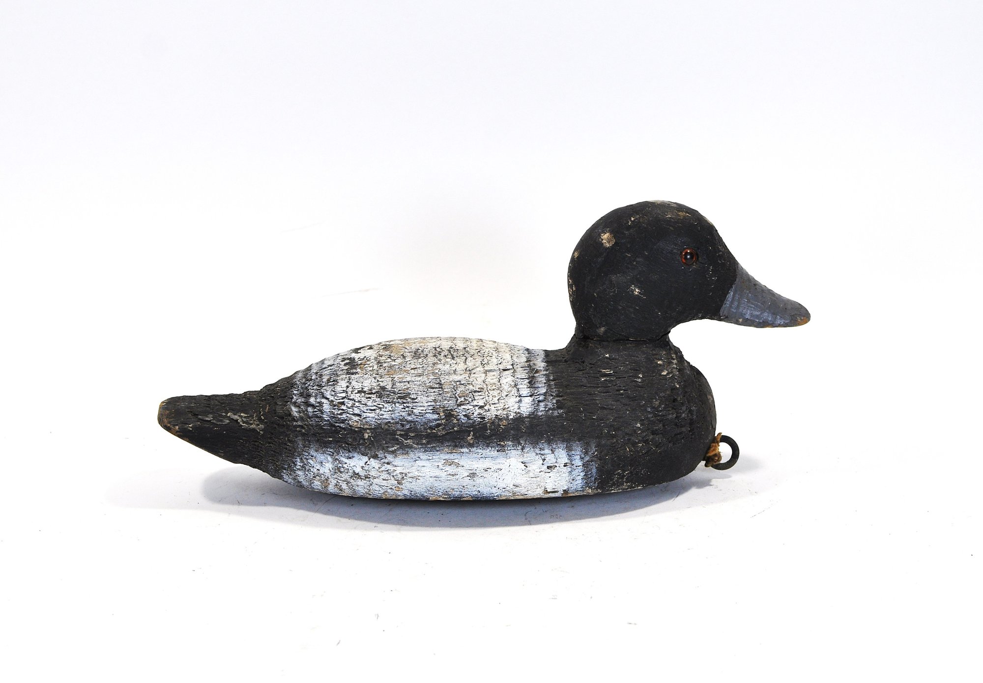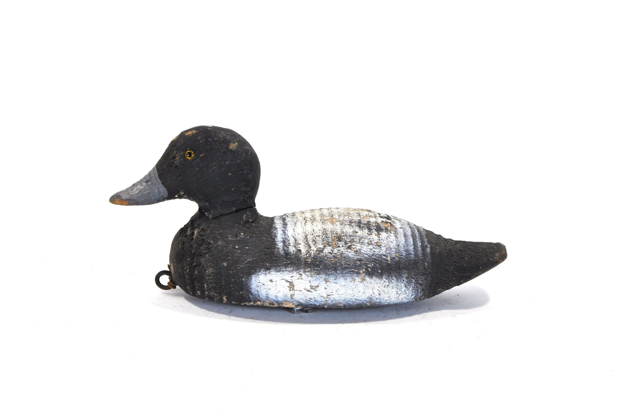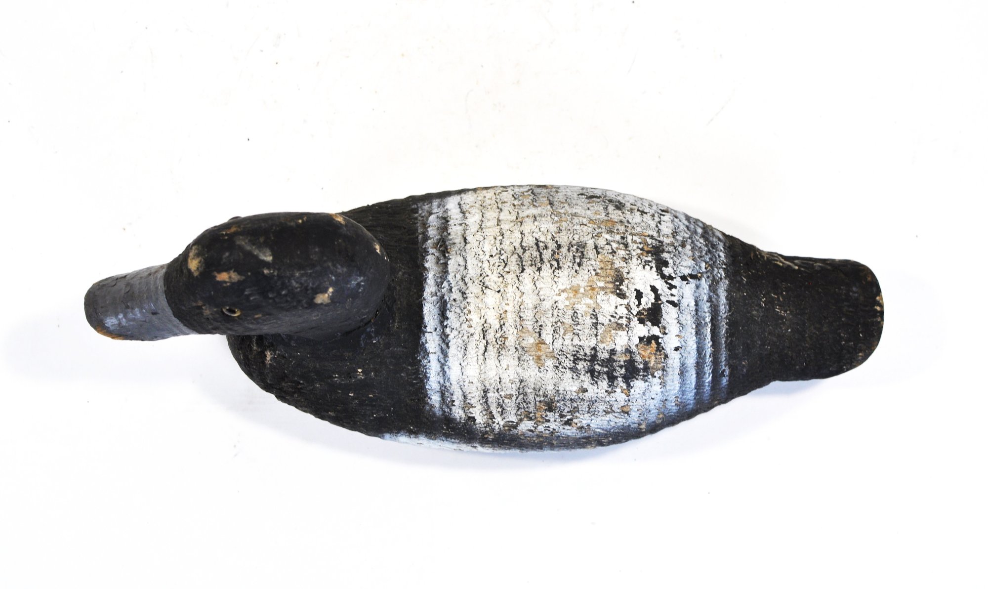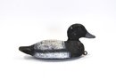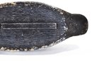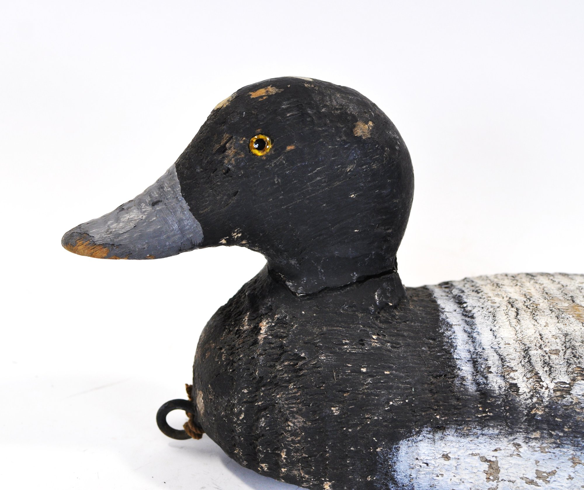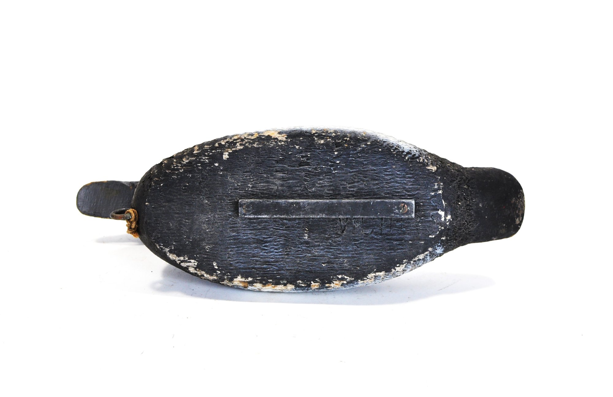 A vintage hand-carved wooden duck decoy, boldly stamped or carved “VICTOR” on the underside. The decoy features a classic working form with a black-painted head and tail, contrasting weathered white and gray body, and a pale bill. Bright yellow glass inset eyes provide a lively, realistic expression.