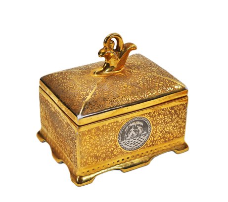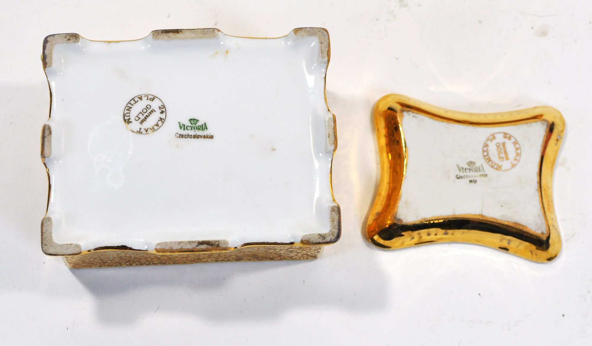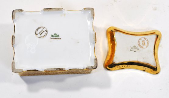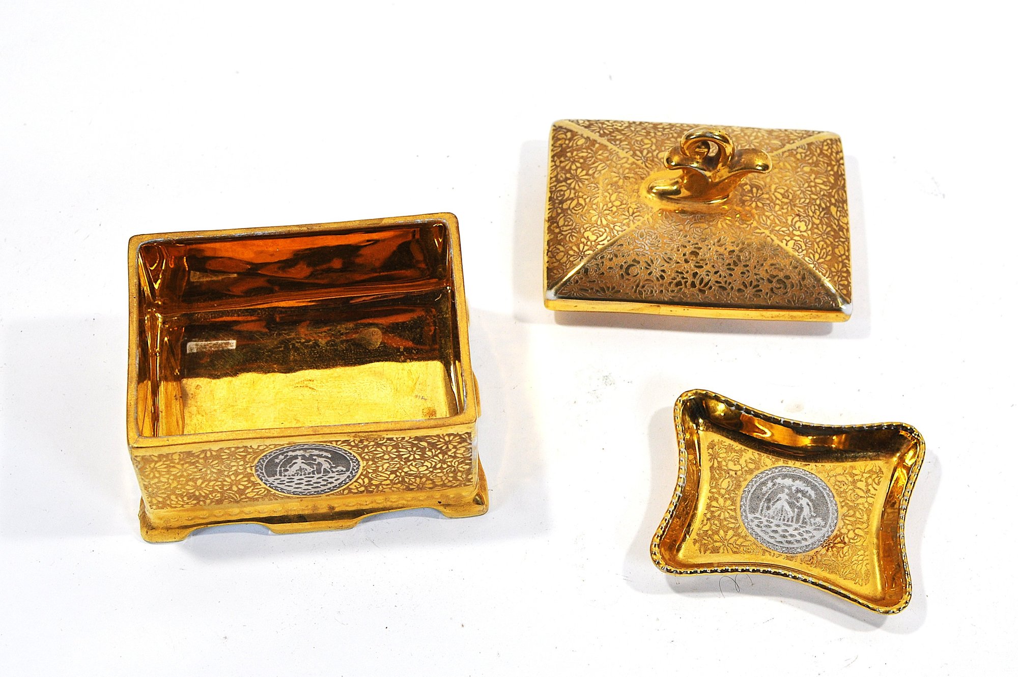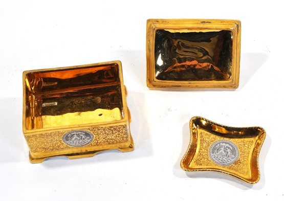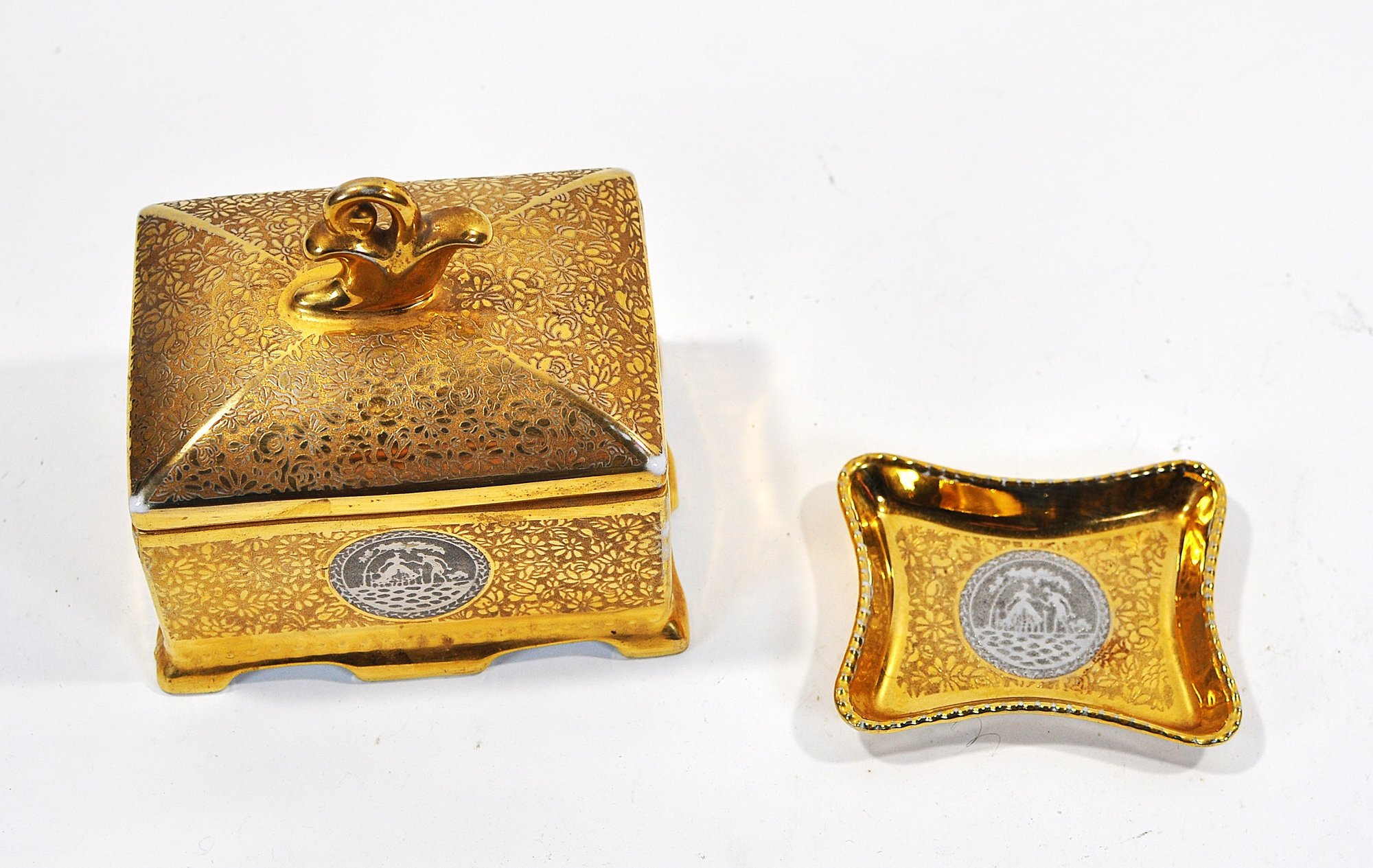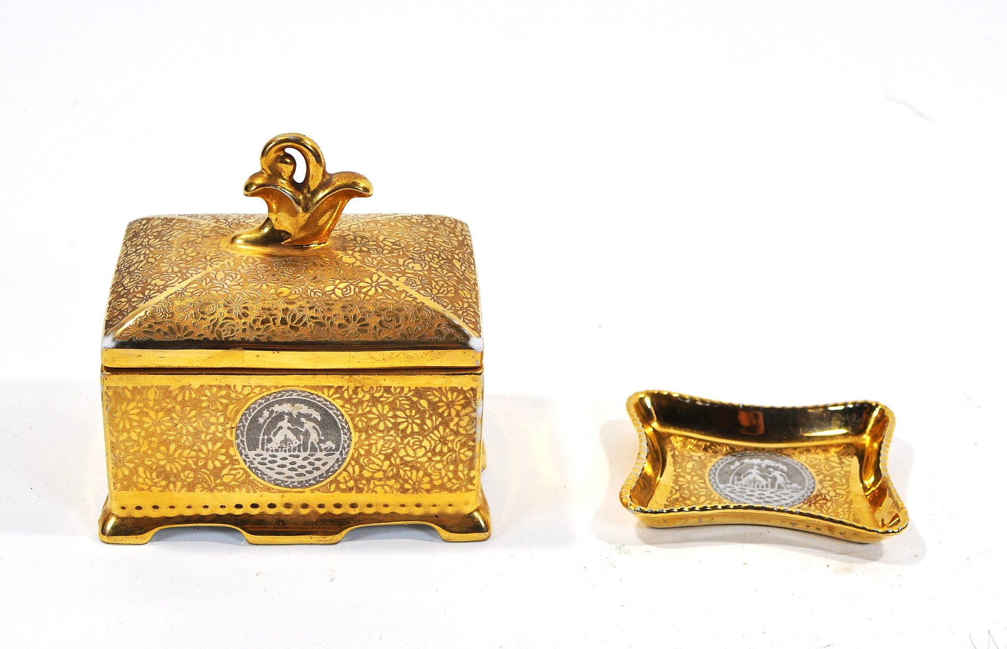 Vintage gilt porcelain trinket box with fitted lid and matching small dish, both decorated with allover gold floral patterning and applied scenic medallions. The box features a decorative finial handle and four small feet. Undersides marked “Victoria – Czechoslovakia” and retailer stamp “24 Gold Platinum.”