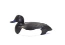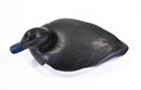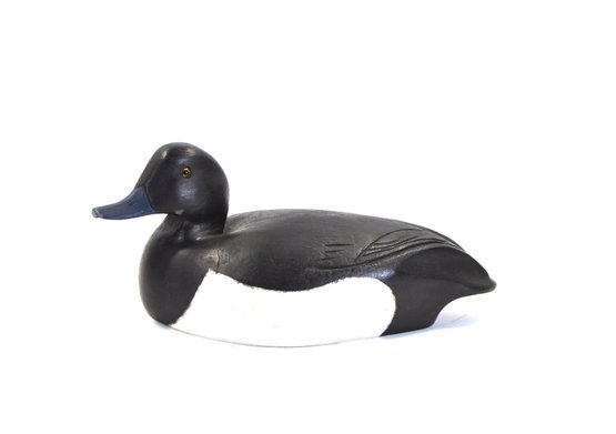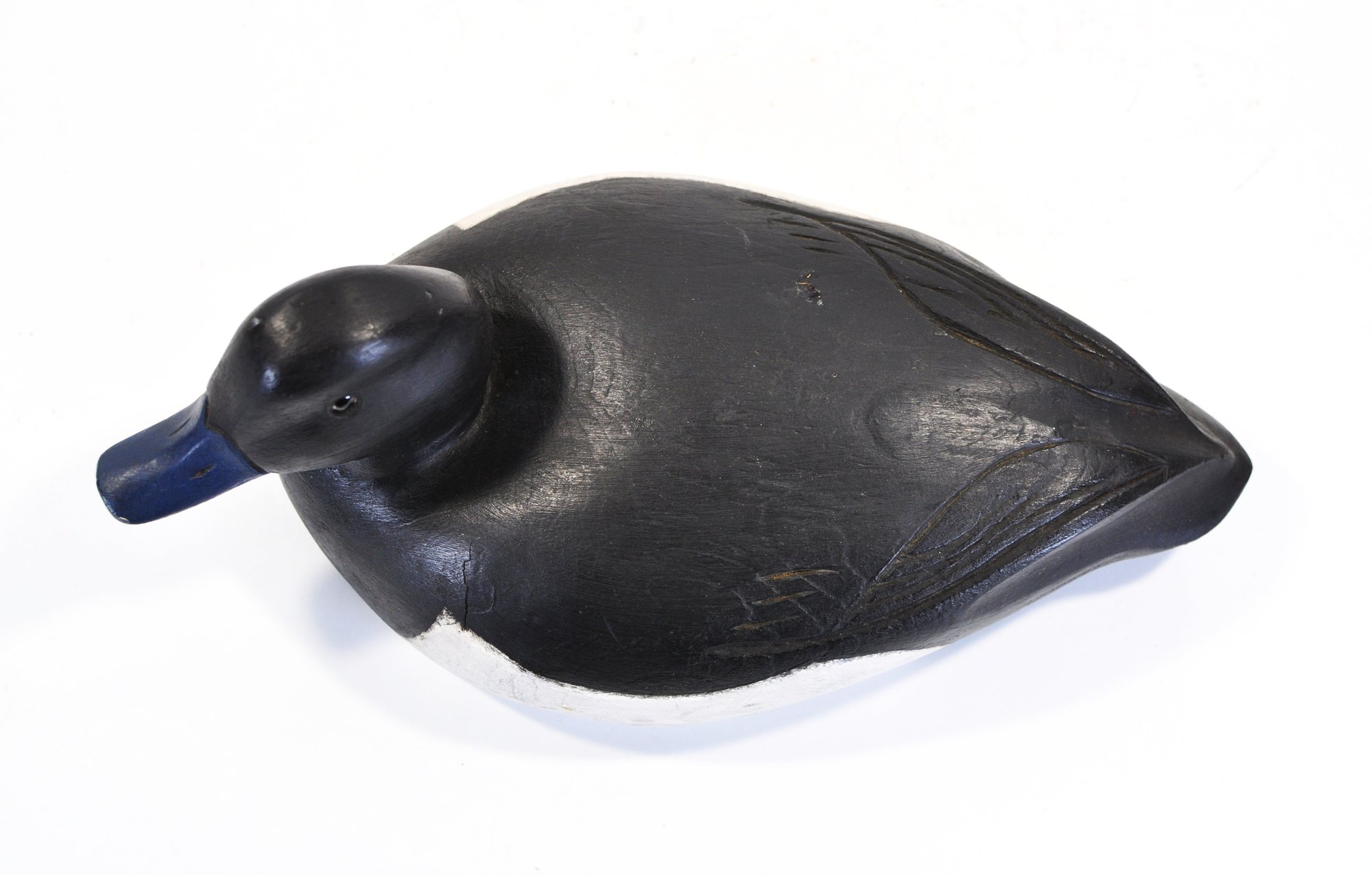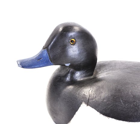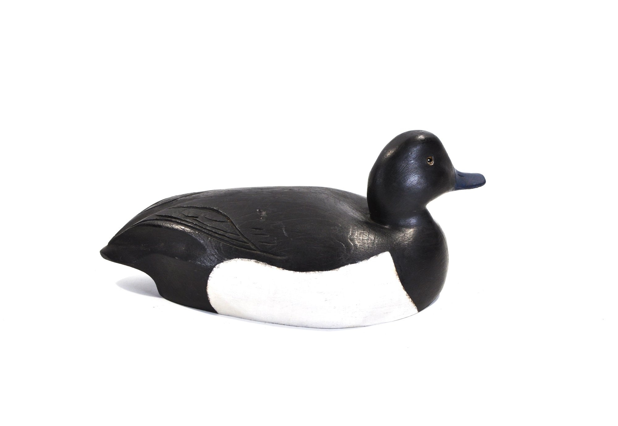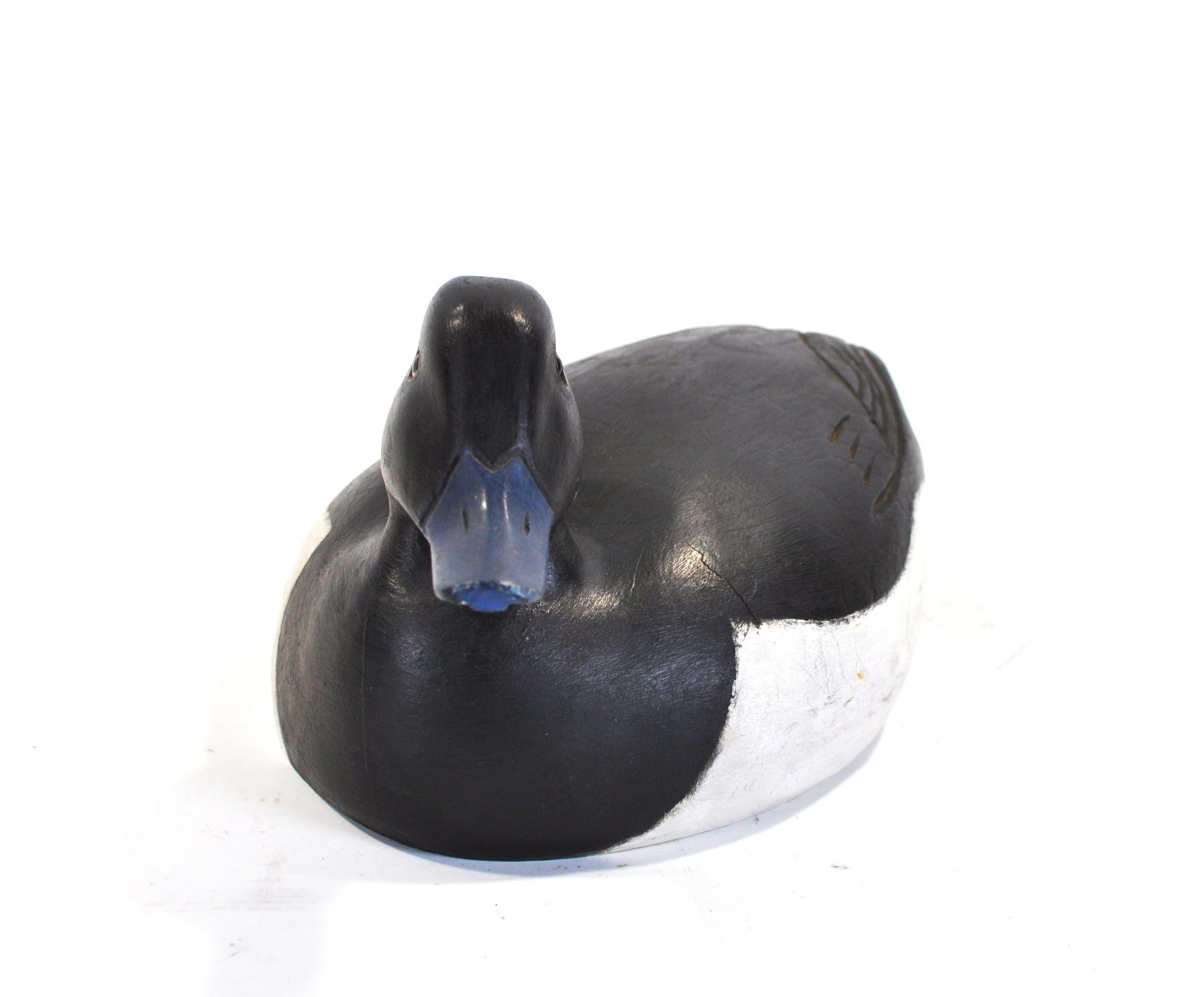 A distinctive vintage hand-carved wooden duck decoy featuring a striking black and white body with a blue bill and glass inset eyes. The smooth, simplified form is accented by subtle carved wing detail, giving the piece a clean, modern folk-art presence while retaining traditional decoy character.