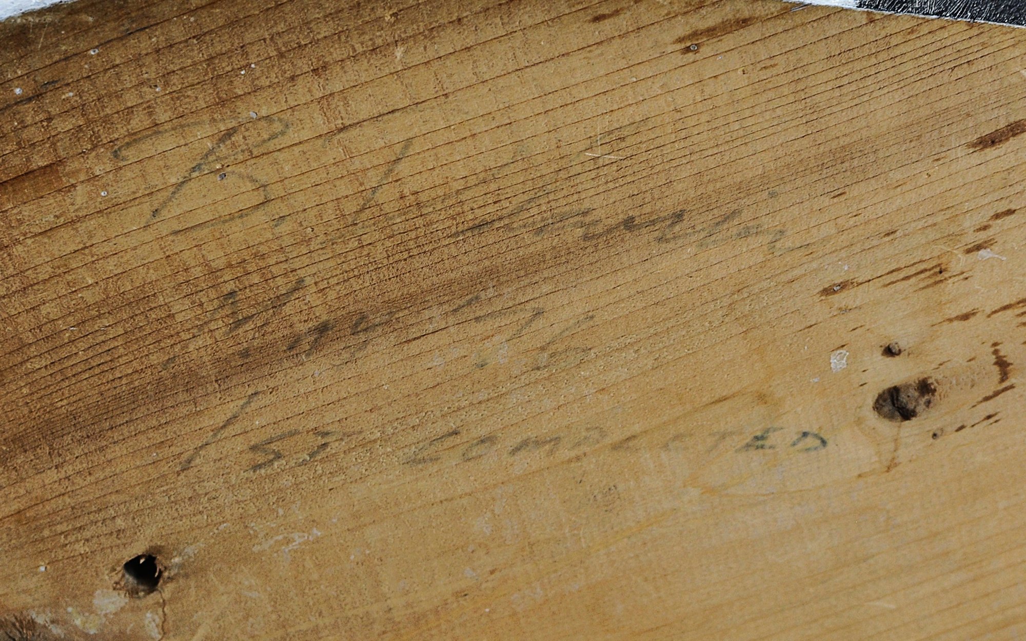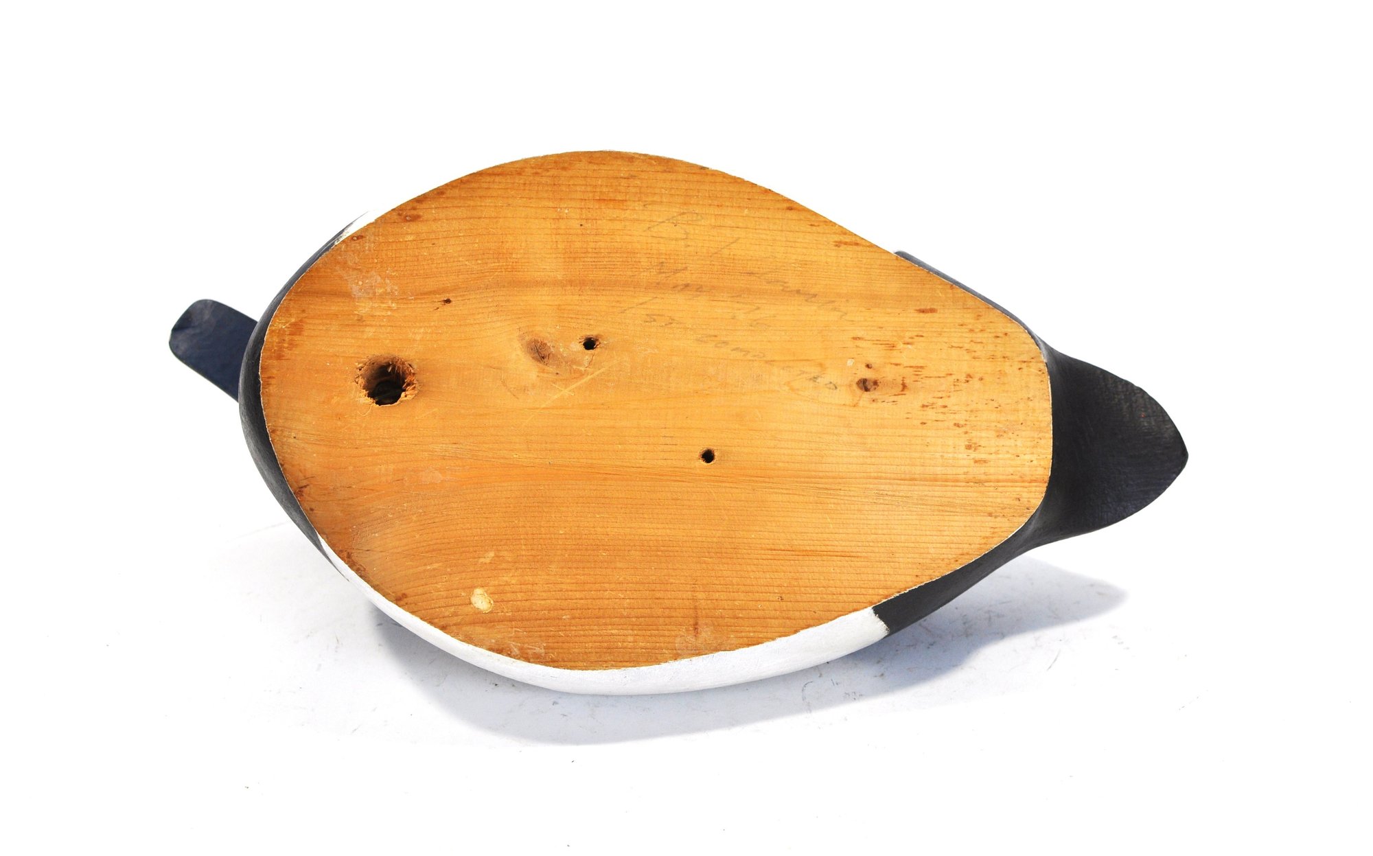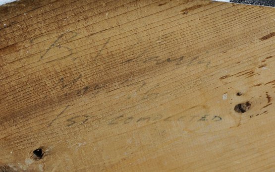 The underside reveals raw wood with visible tool marks and mounting holes, along with faint pencil inscription indicating “1st completed,” suggesting this example may represent an early or inaugural work by the maker. Additional handwritten markings appear to include a signature, enhancing its appeal as a signed, possibly one-of-a-kind piece.