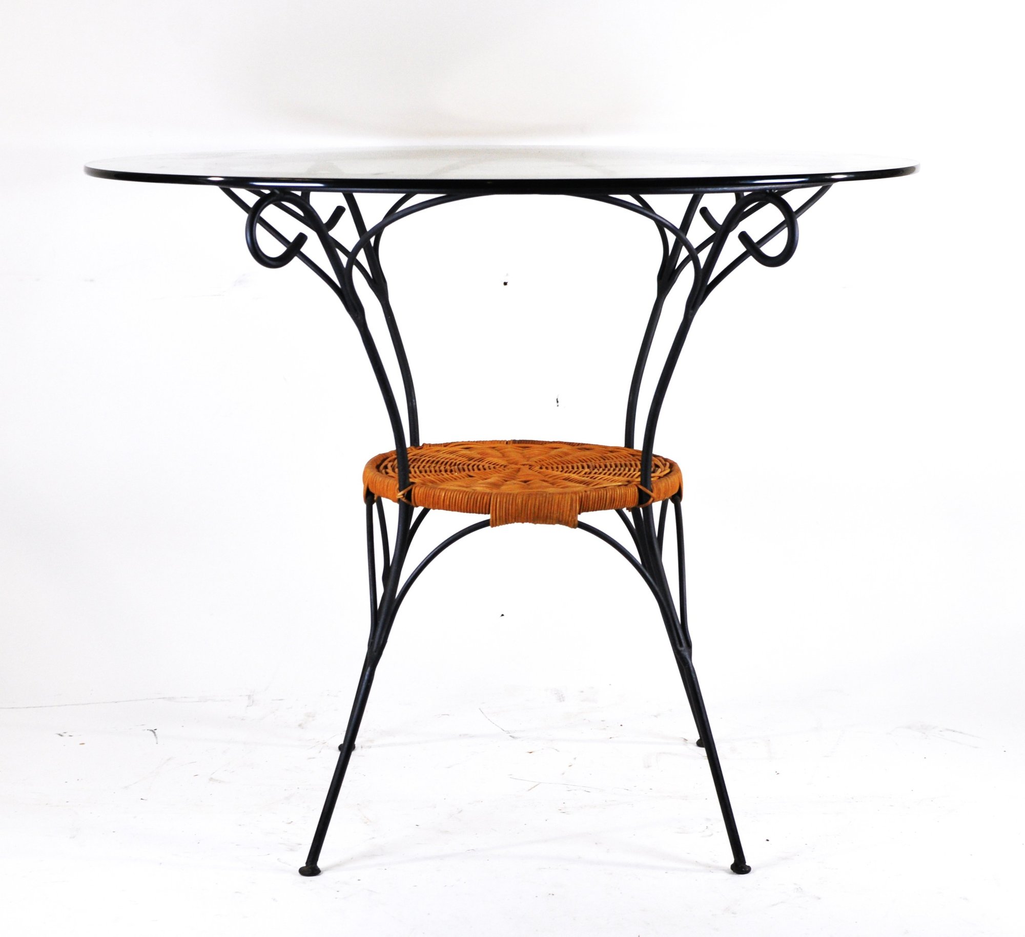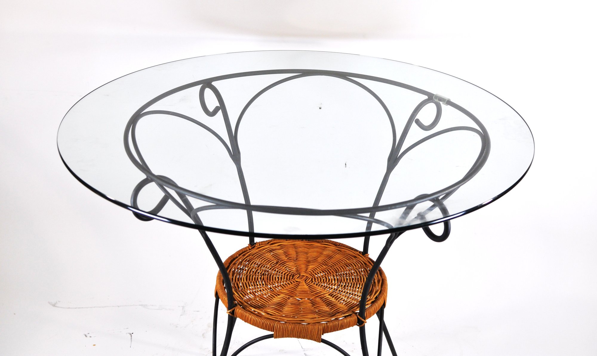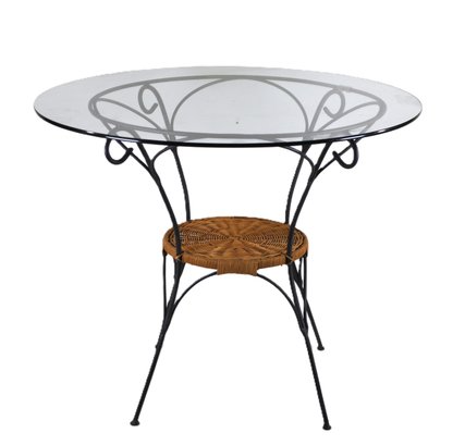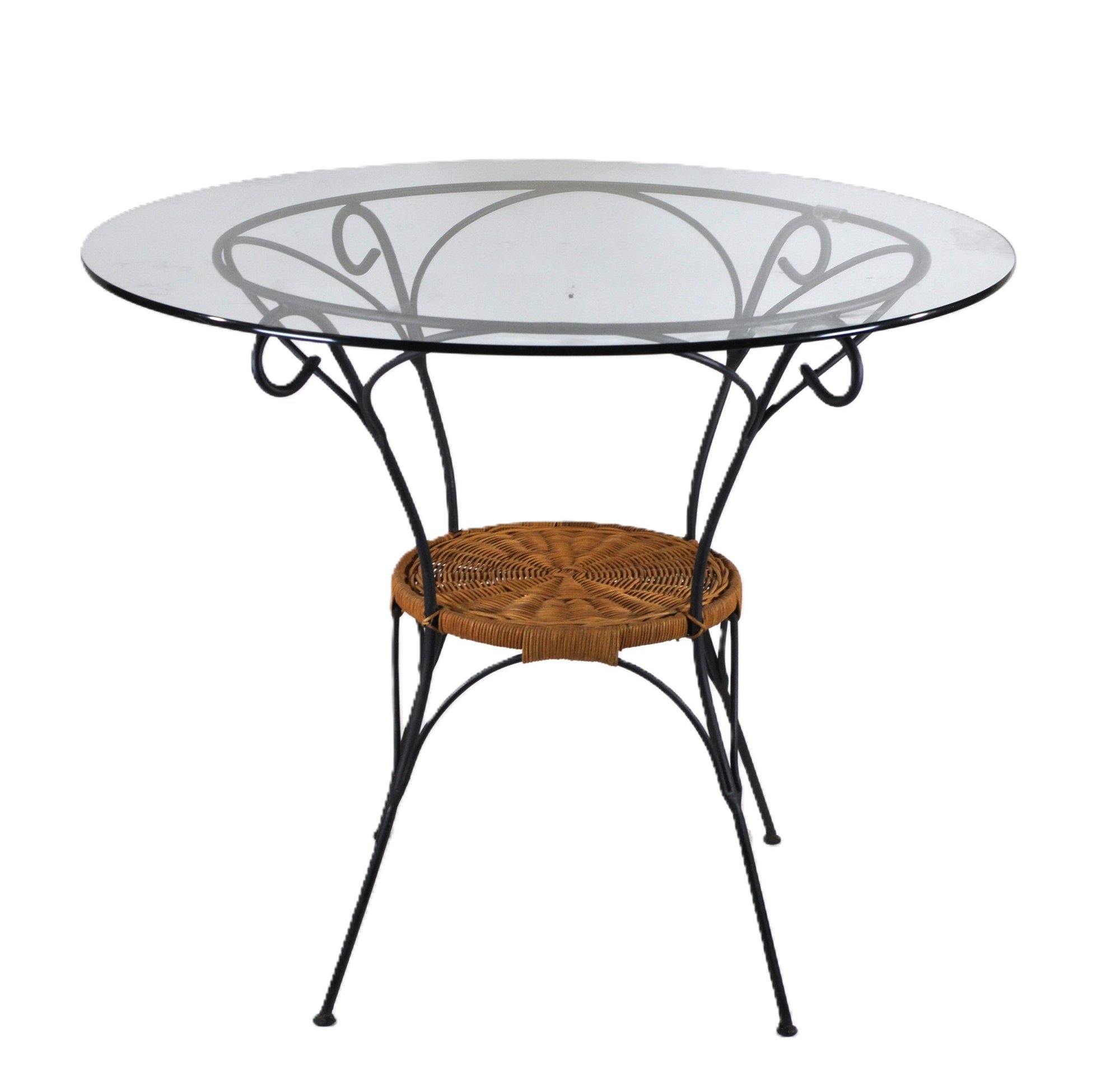 vintage round accent table featuring a clear glass top set in an elegant wrought iron frame with decorative scrollwork supports. The table includes a woven wicker lower shelf, adding warmth and texture while providing useful storage or display space. Slim tapered legs give the piece a light, airy look that works beautifully in French country, garden room, or vintage-inspired interiors.