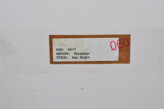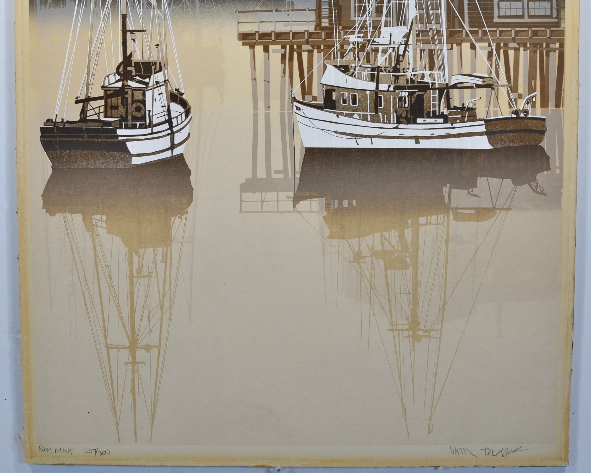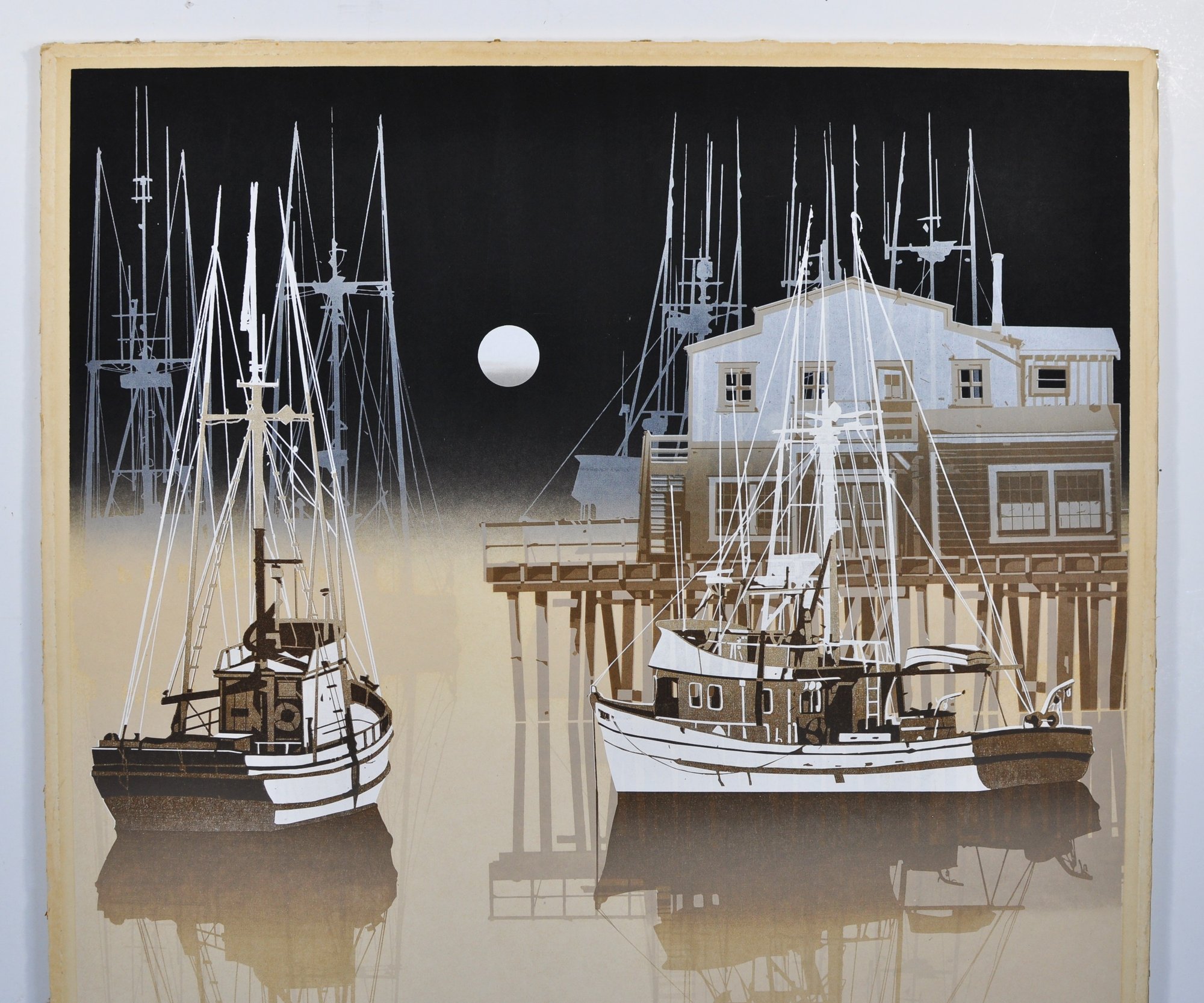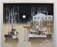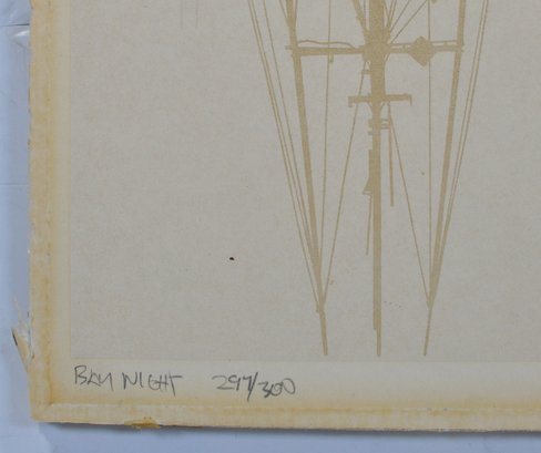 Limited edition print titled Bay Night by American artist Virgil Thrasher, depicting moored fishing vessels and a pier reflected in still harbor waters beneath a moonlit sky. Executed in a restrained palette of blacks, creams, and warm neutrals with strong linear rigging details.