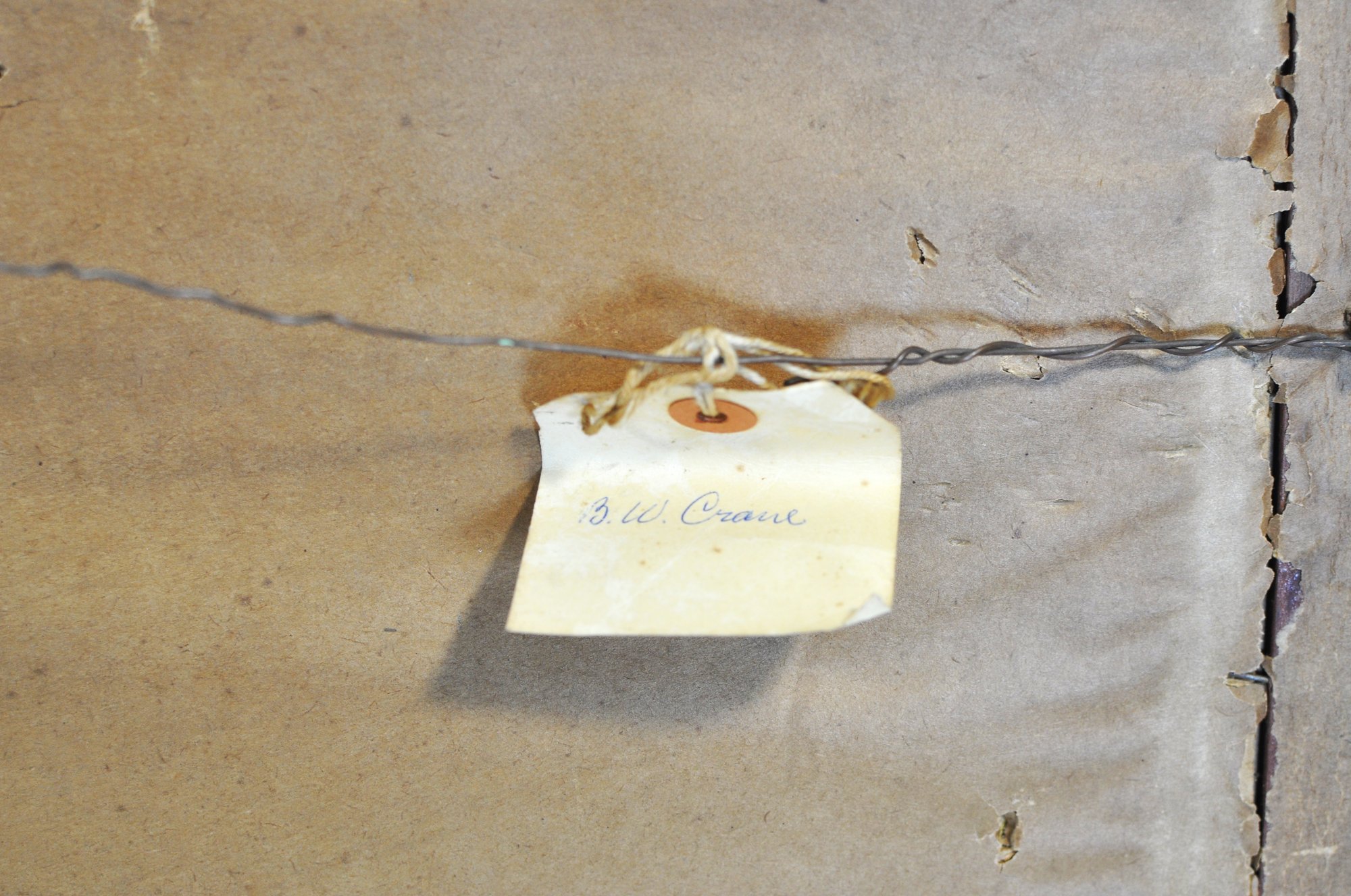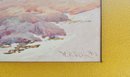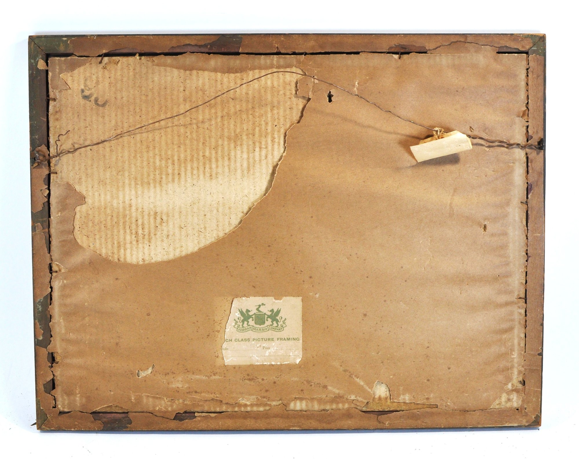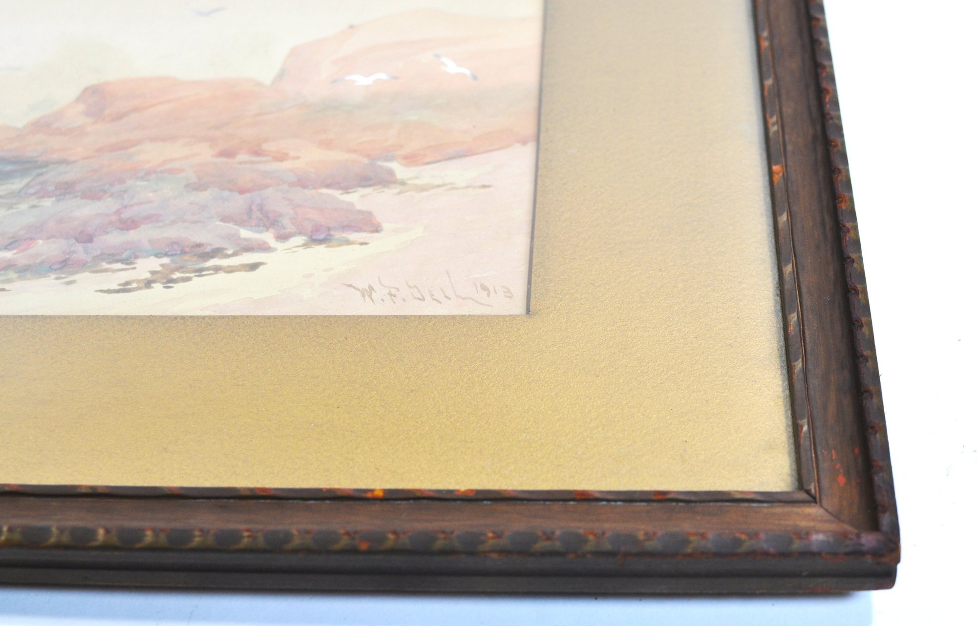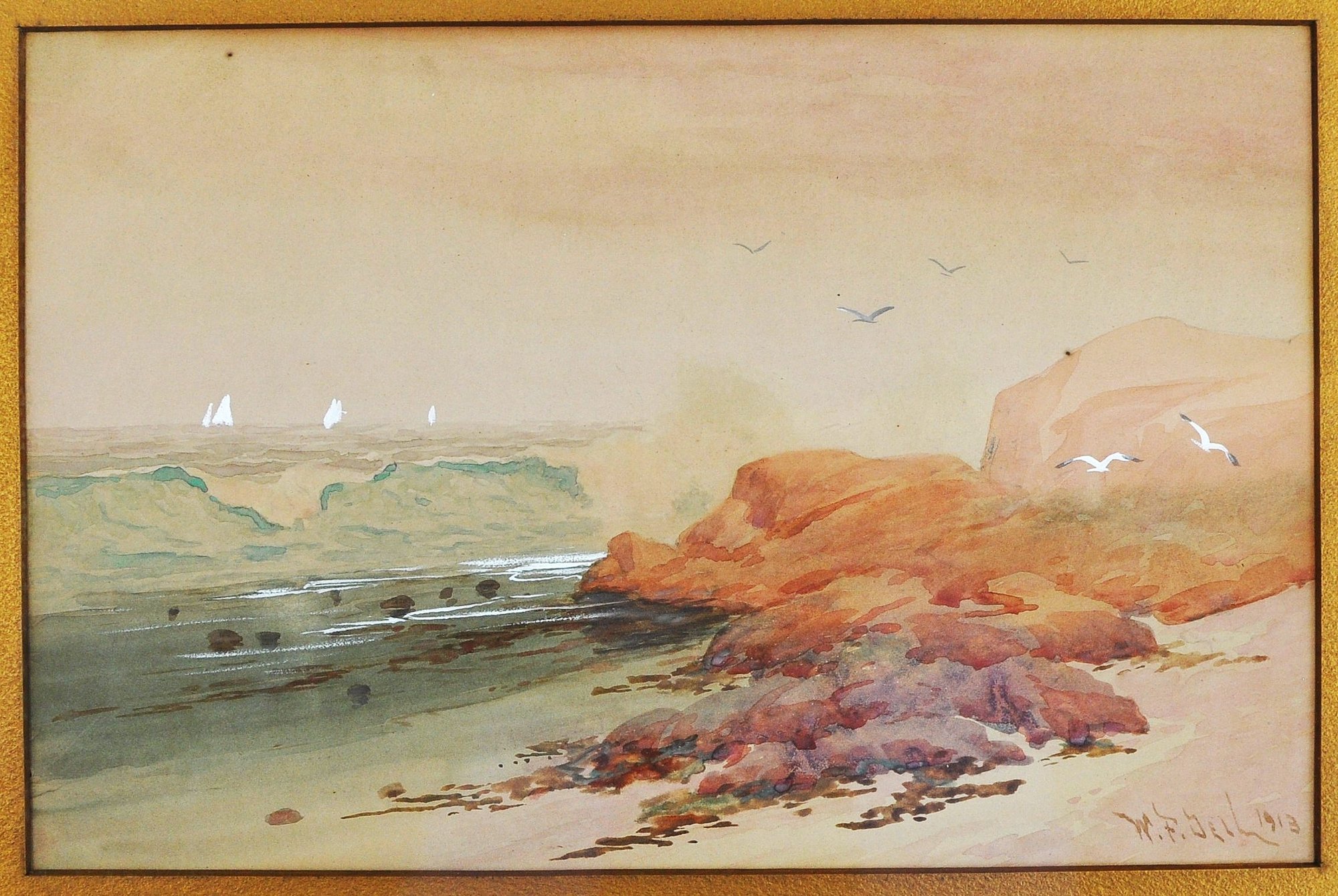 Charming antique watercolor seascape depicting rocky shoreline with sailboats and seabirds, signed lower right “W.F. Dell” and dated 1913. Presented in period frame with Jordan Marsh Company Boston framing label on verso.