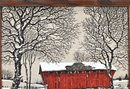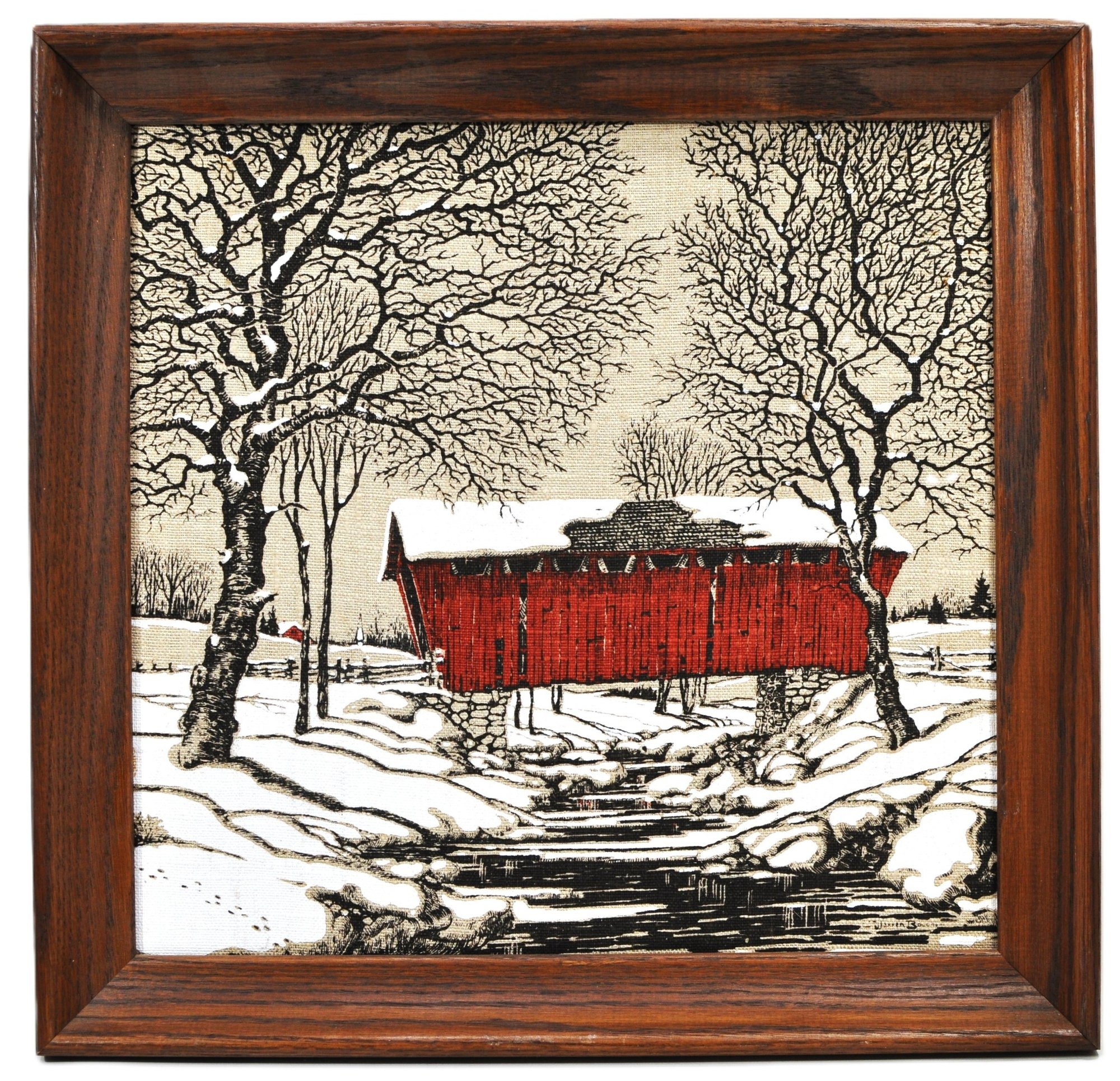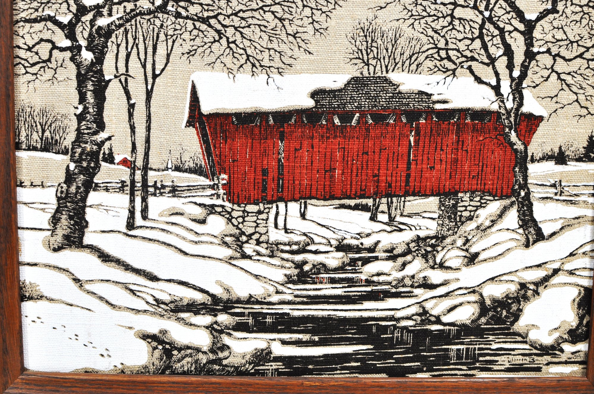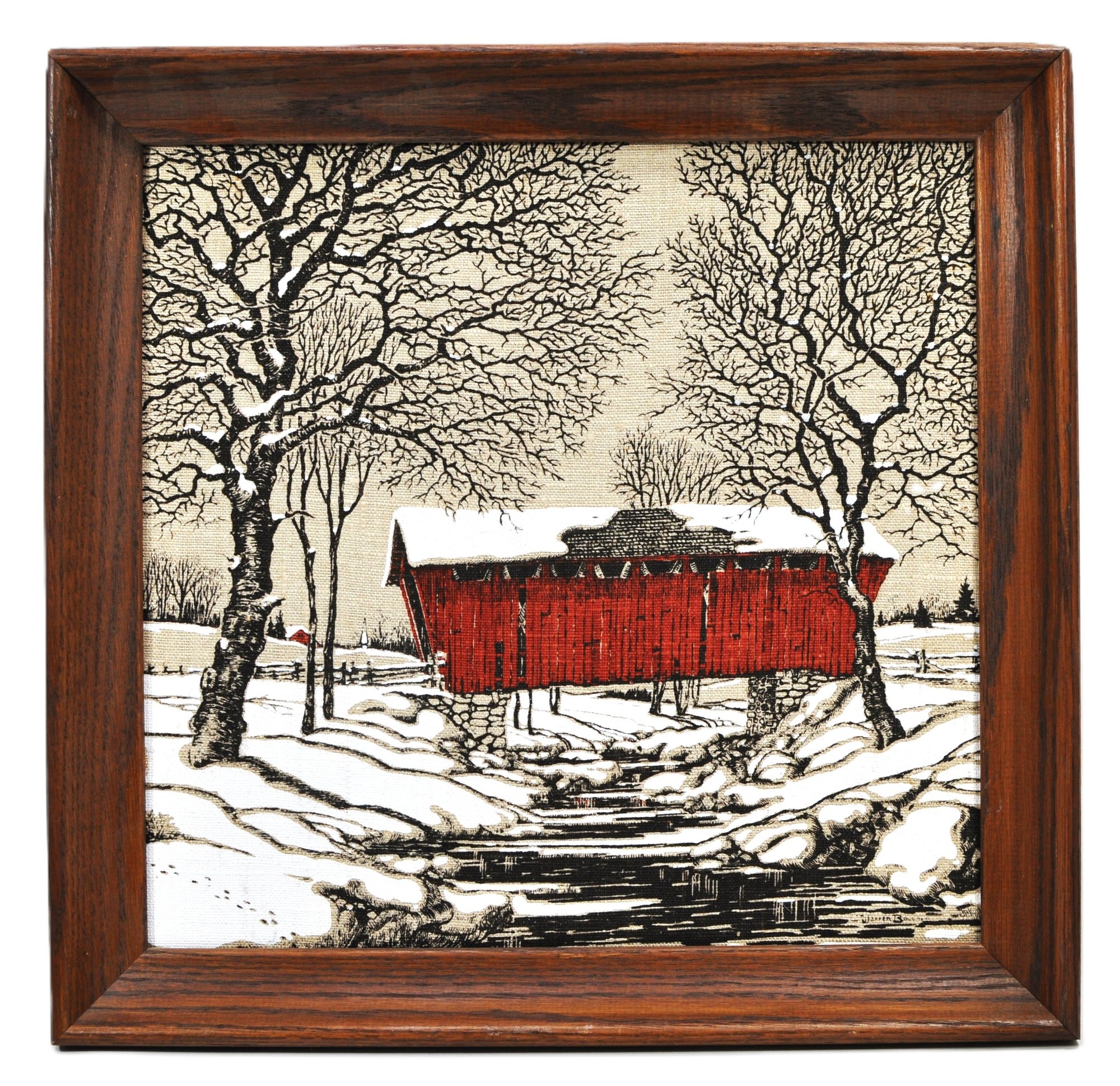 Vintage Kay Dee decorative linen wall art print featuring a winter covered bridge scene after a design by artist Warren Boucher. The composition shows a red covered bridge over a stream, set within a snowy landscape with finely detailed bare trees, rendered in black linework on natural linen with bold red accents.